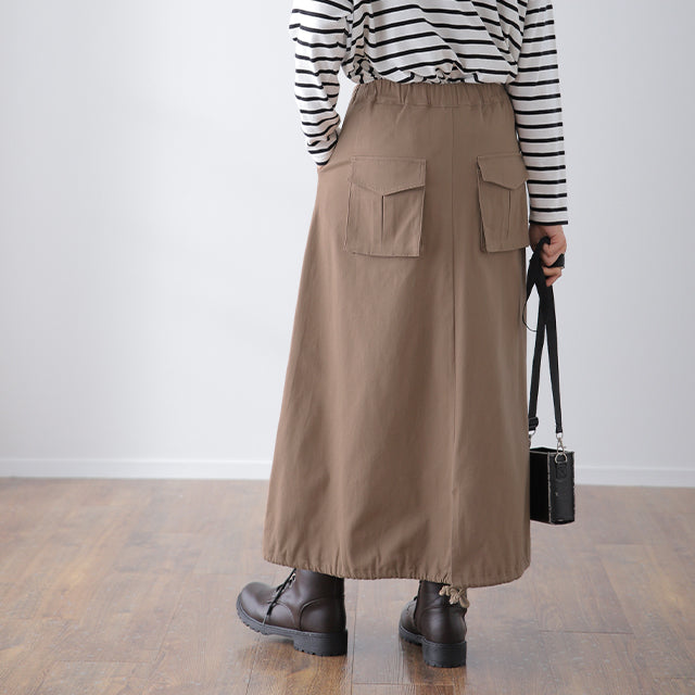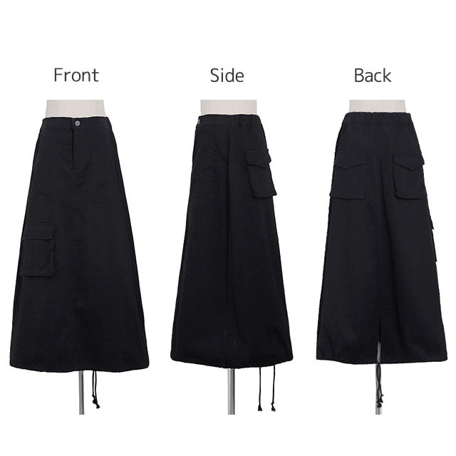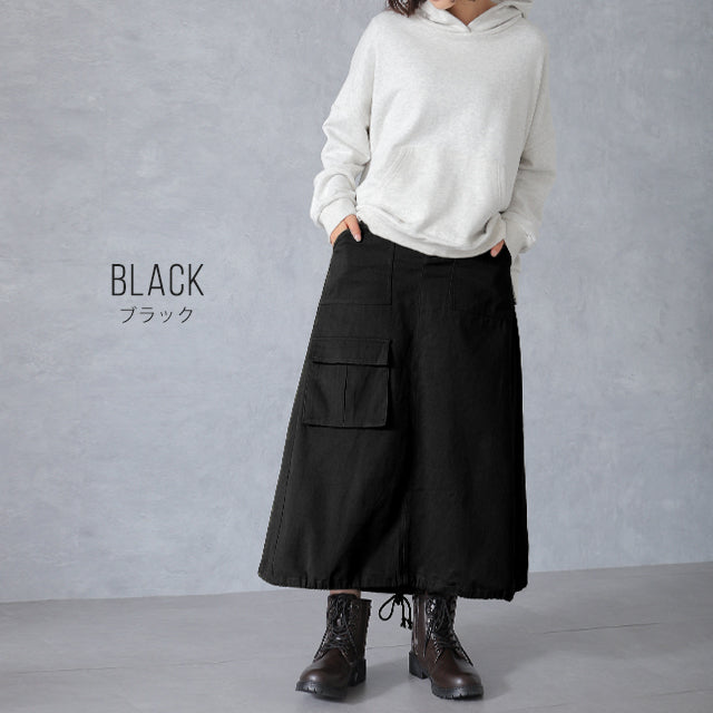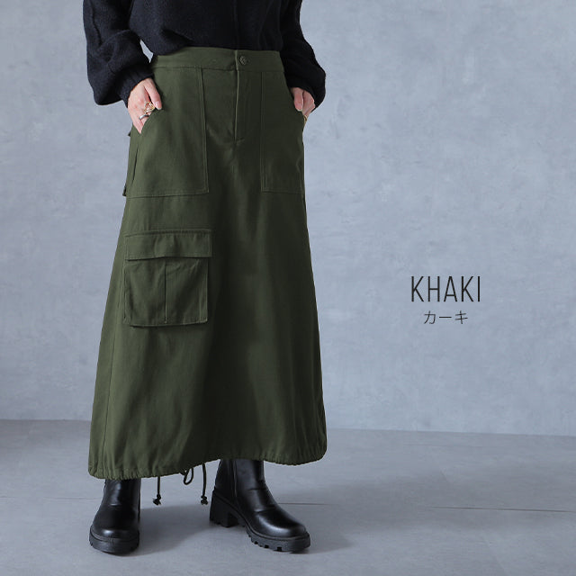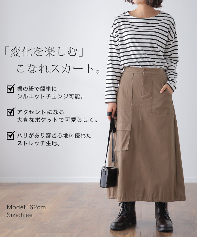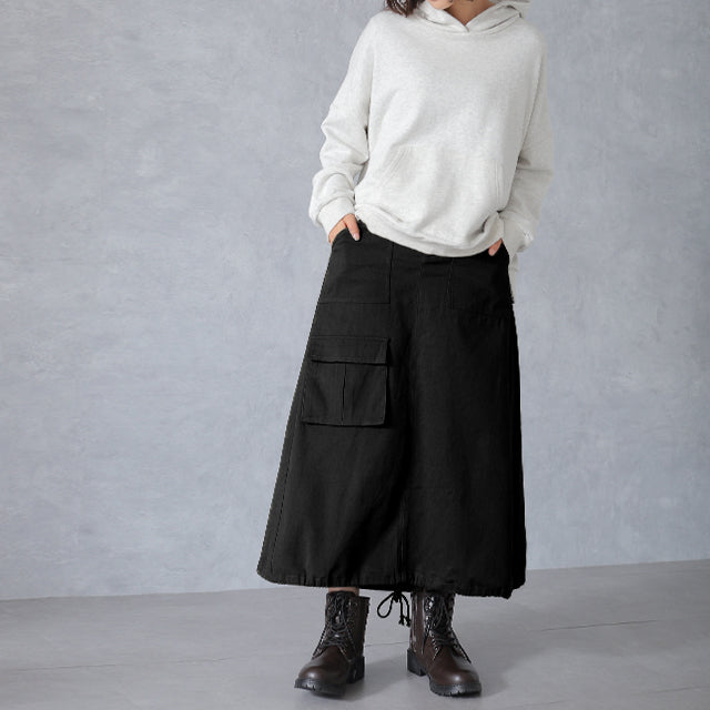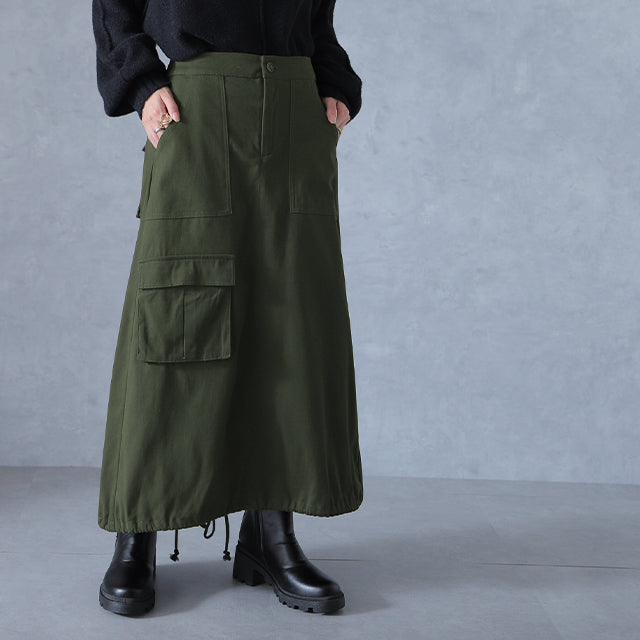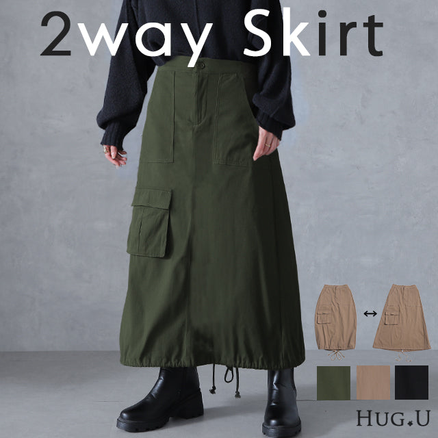 大きいポケットデザインが可愛い2wayスカートです。ミリタリーライクなウエスト周りやカーゴポケットで辛口コーデに。程よいハリ感のある生地を使用したミリタリースカートです。