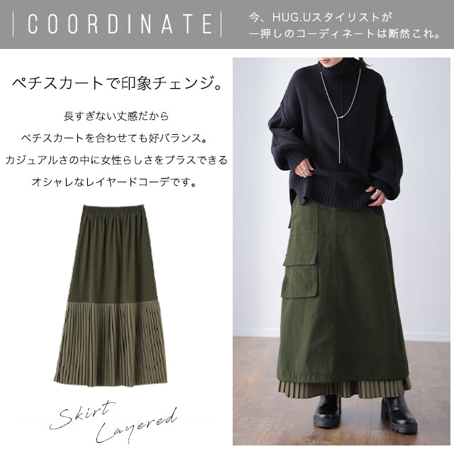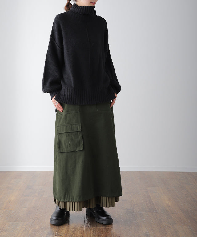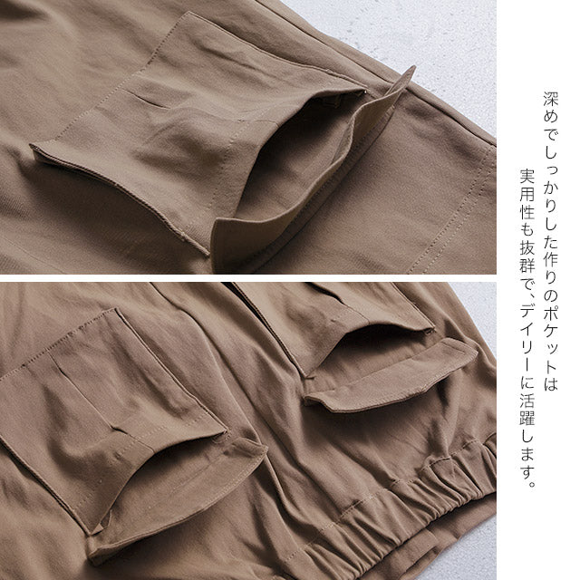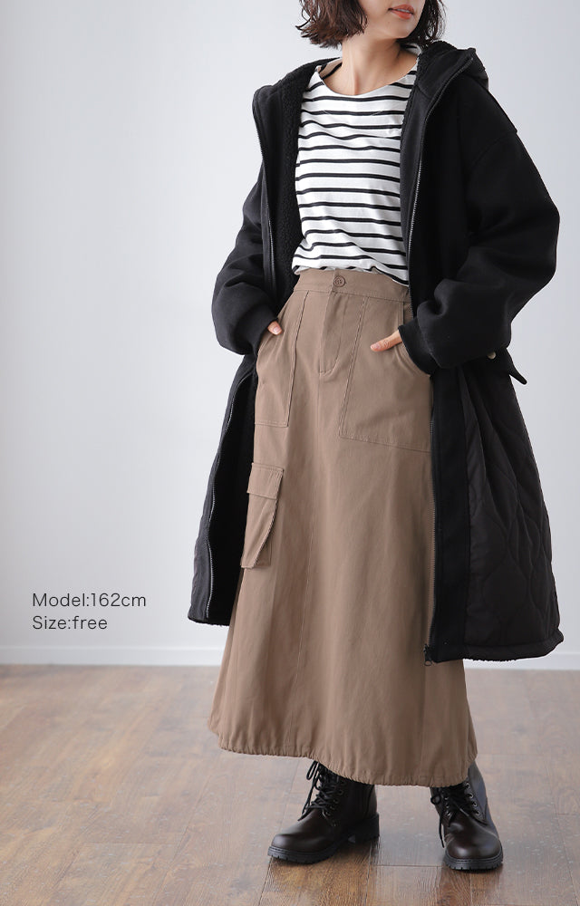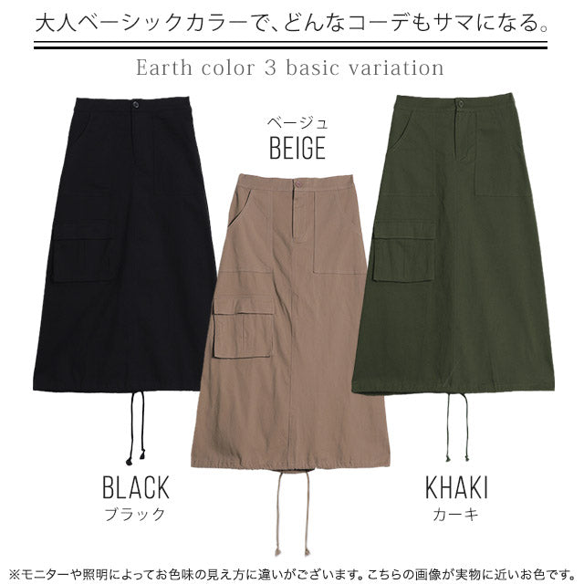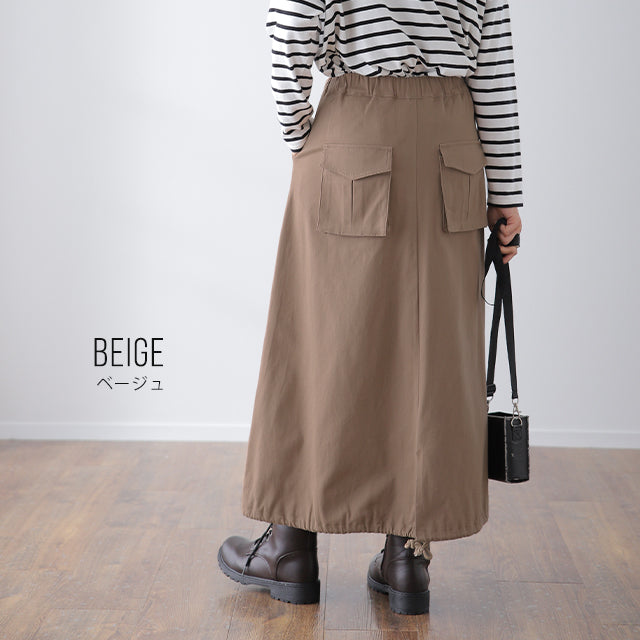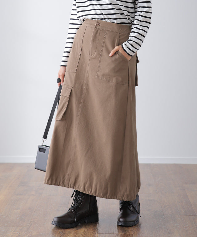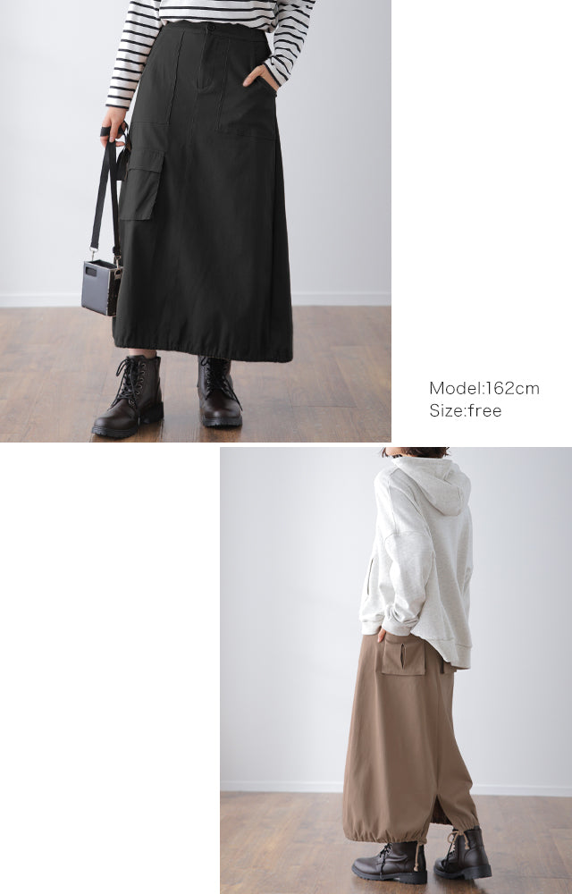 大きいポケットデザインが可愛い2wayスカートです。ミリタリーライクなウエスト周りやカーゴポケットで辛口コーデに。程よいハリ感のある生地を使用したミリタリースカートです。