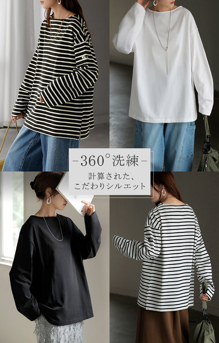 2025AW新作 ロンT ボーダー ■一部11月中旬入荷 刺繍 レディース トップス 長袖 Tシャツ 綿100 カットソー ロング チュニック バスク ティーシャツ ビッグ プラスサイズ ボートネック クルーネック 長い ゆったり 無地 体型カバー お尻が隠れる 大きいサイズ おしゃれ 白 黒 秋 冬 HUG.U