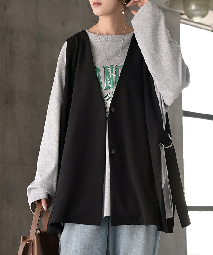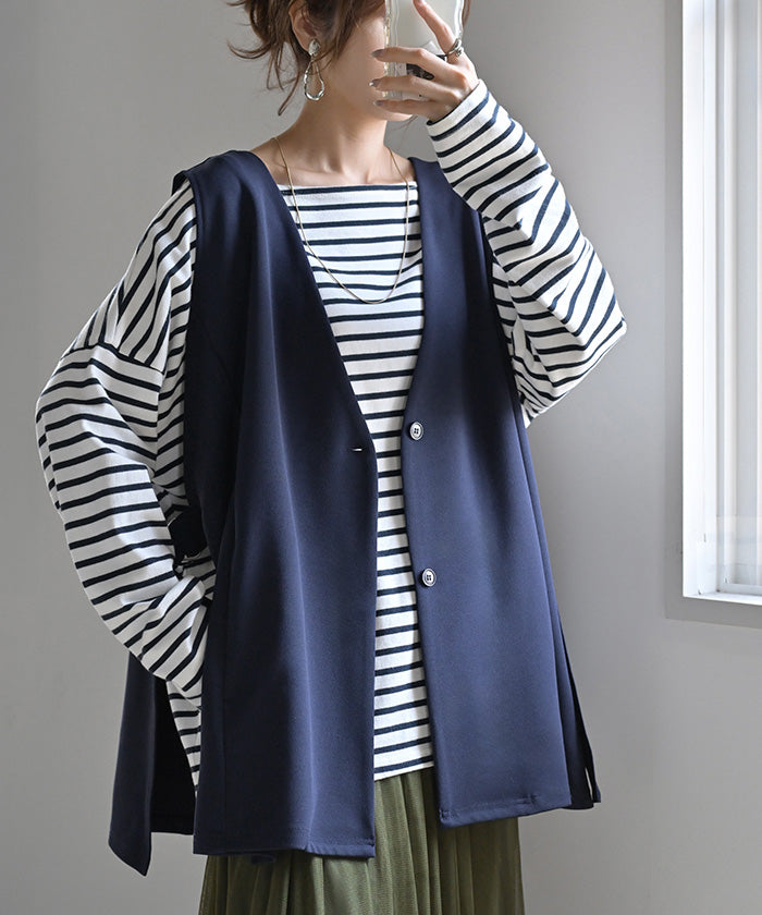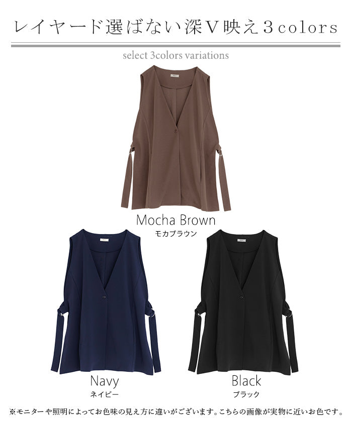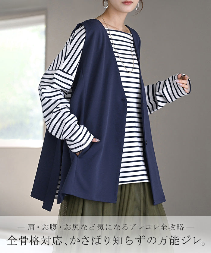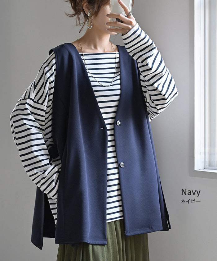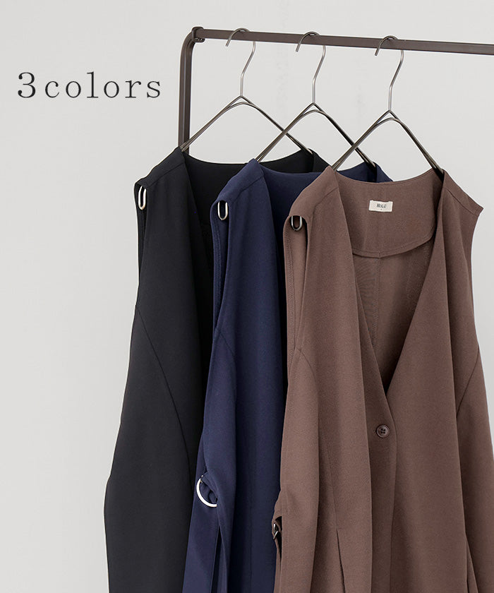 2025AW新作 ジレ ロング 深V レディース ■一部11月中旬入荷 トップス ベスト アウター ノーカラー Vネック ロングジレ ノースリーブ サイドベルト レイヤード ストレッチ シワになりにくい 体型カバー おしゃれ 前開き ゆったり お尻が隠れる 大きいサイズ 黒 ネイビー 秋 冬 HUG.U