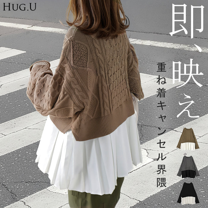 2025AW新作 ニット プリーツ ドッキング ■12月下旬入荷 レディース トップス ロング セーター ケーブルニット オーバー 重ね着 レイヤード プルオーバー クルーネック 無地 チュニック きれいめ 長袖 長い上品 ゆったり 大きいサイズ 体型カバー お尻が隠れる 黒 グレー 秋 冬 HUG.U
