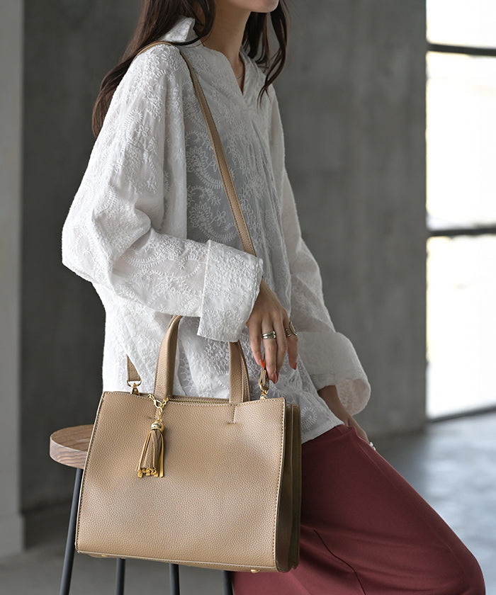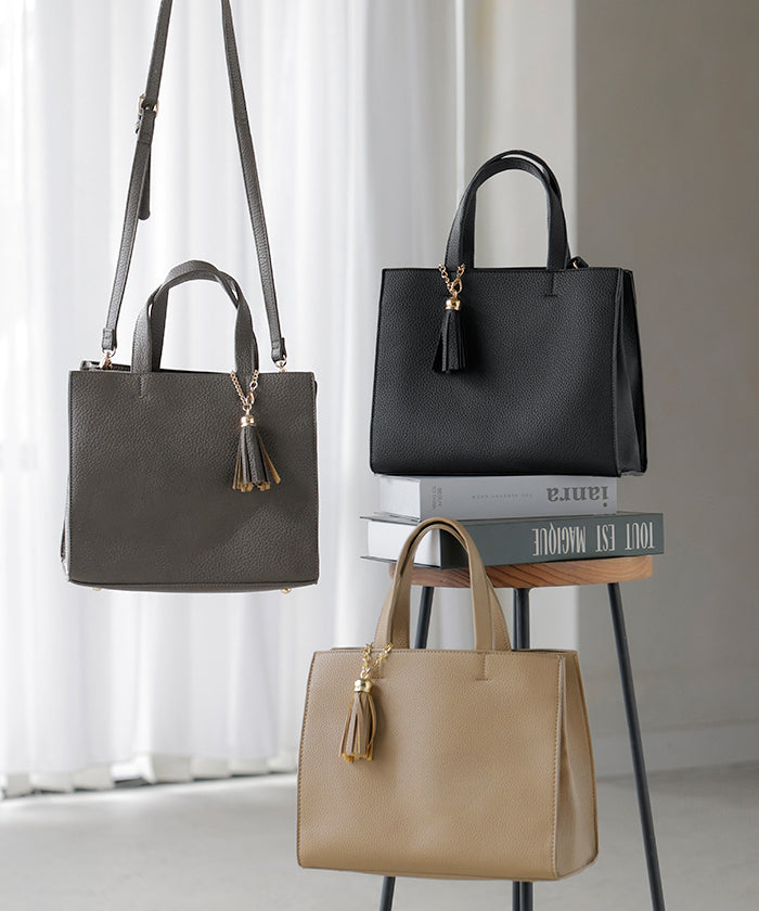 2025AW新作 トート バッグ フェイクレザー タッセル レディース トートバッグ ショルダーバッグ 2way マチ付き ミニトート ポケット かばん 鞄 無地 ペットボトル 収納可 本革 風 インナーポケット 軽量 シボ ストラップ付き 通勤 上品 きれいめ 黒 グレー 秋 冬 HUG.U