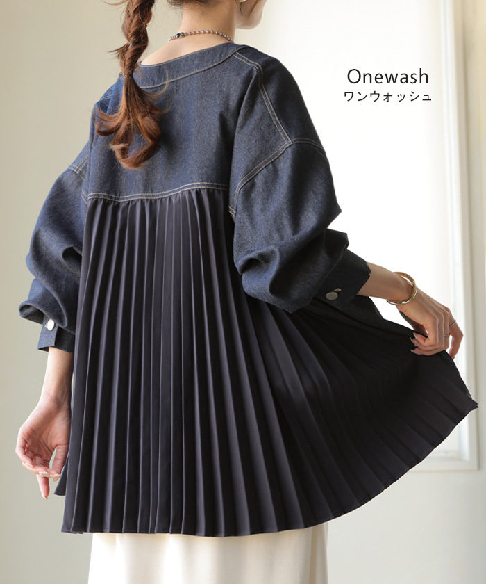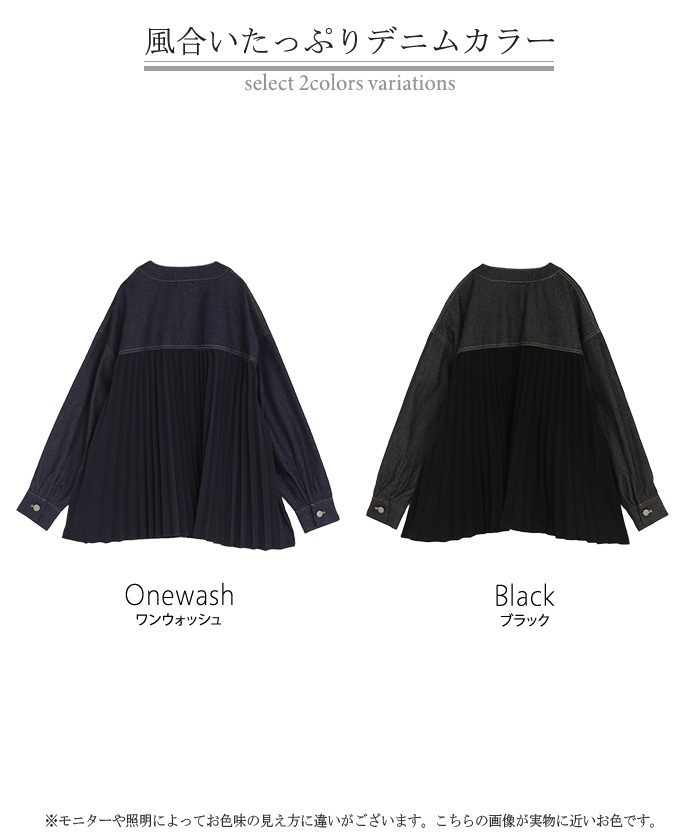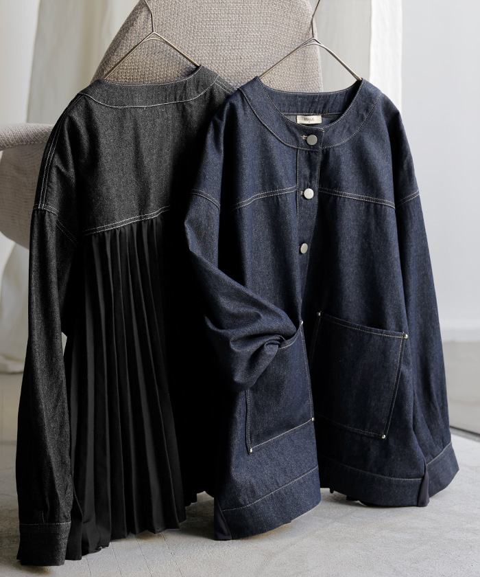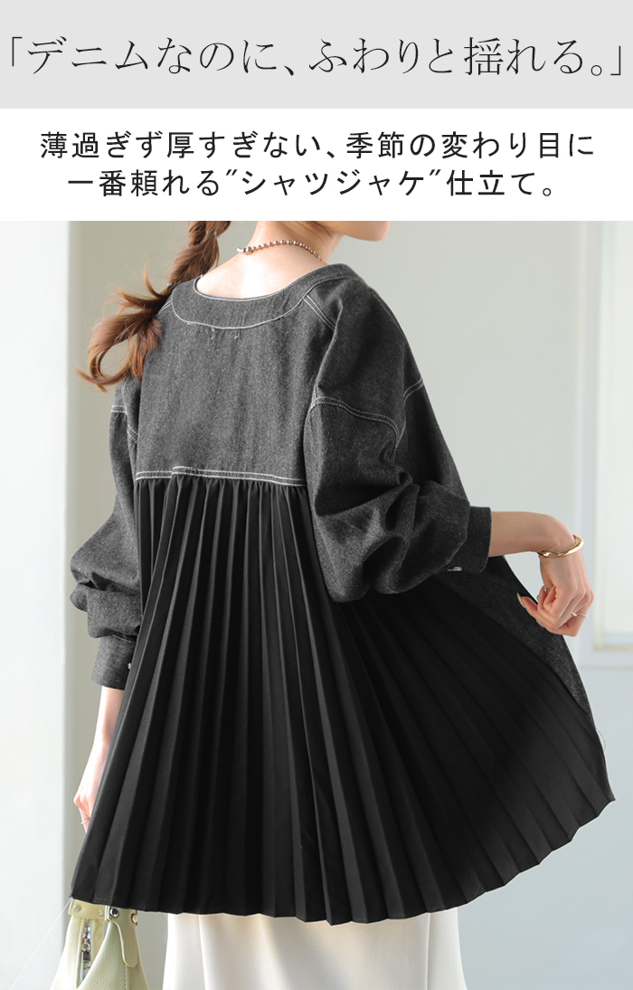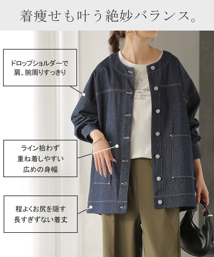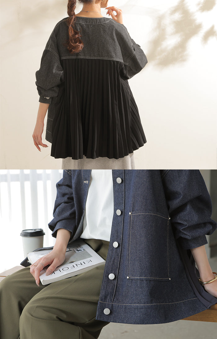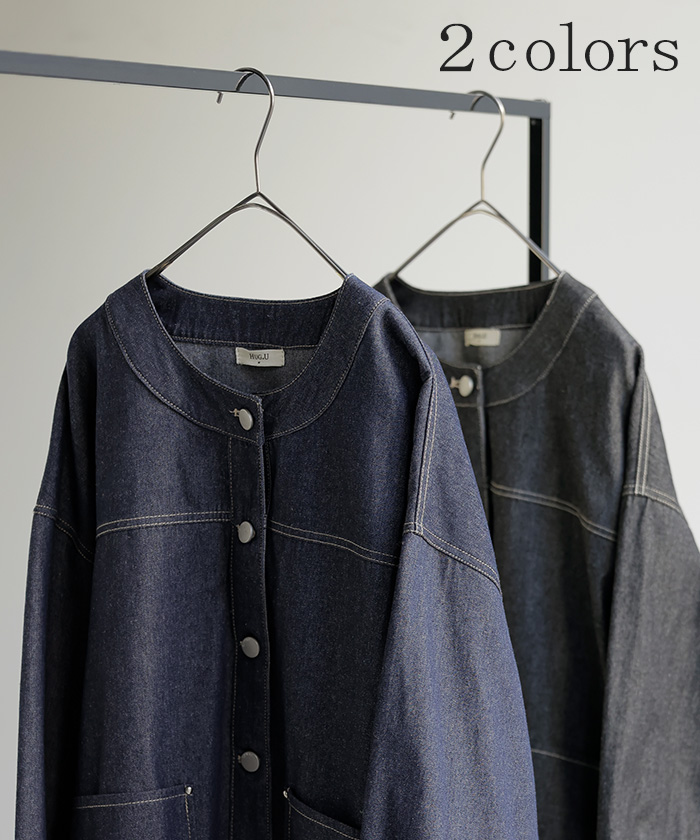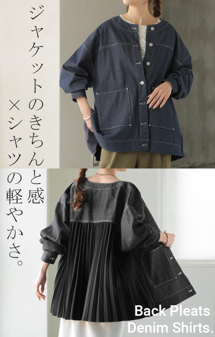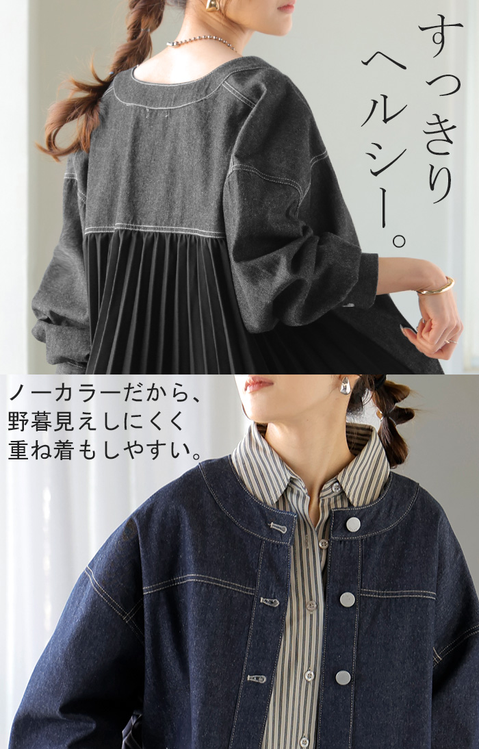 【早割10%OFF】 2026SS新作 アウター ジャケット デニム バックプリーツ 異素材 MIX レディース Gジャン ロング デニムジャケット シャツ ブルゾン ノーカラー 長袖 羽織 チュニック ジーンズ オーバーサイズ 大きいサイズ 体型カバー お尻が隠れる おしゃれ 黒 青 春 夏 HUG.U
