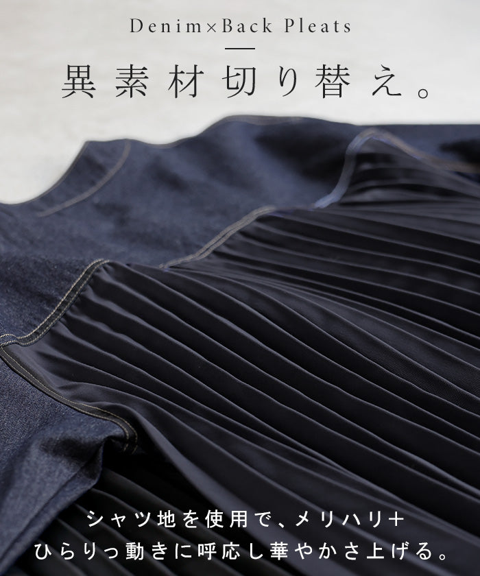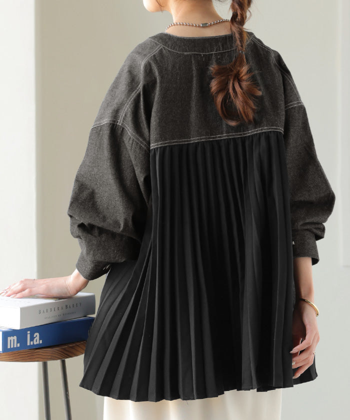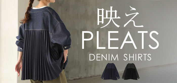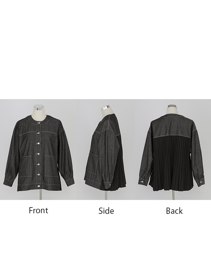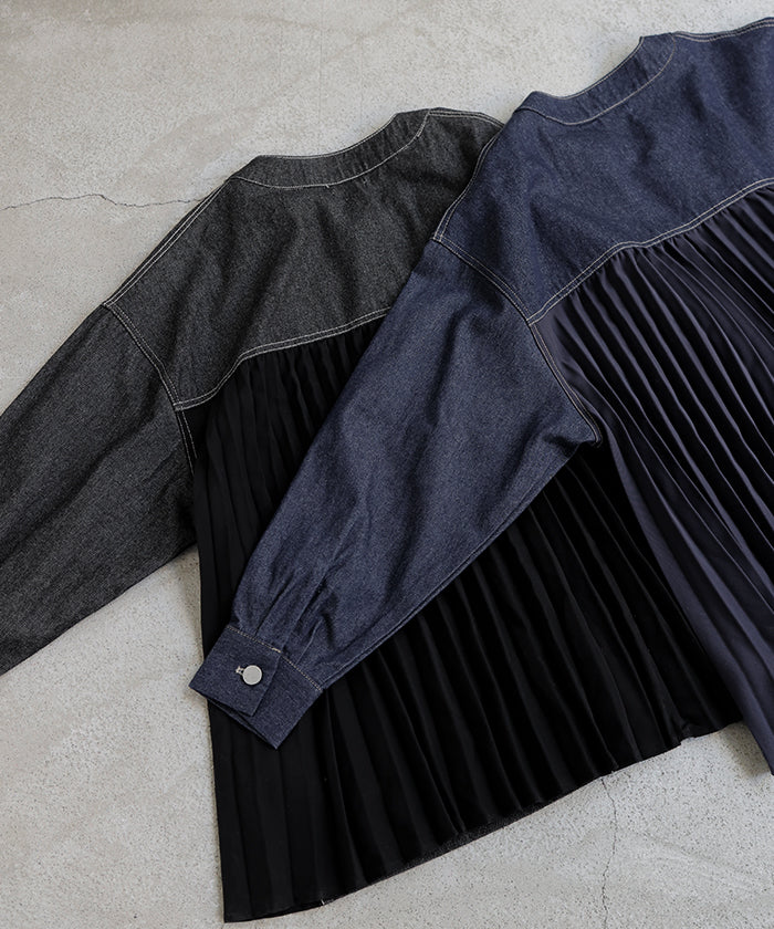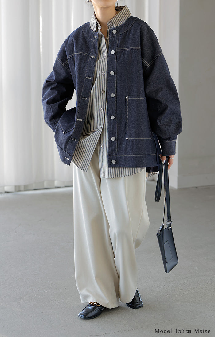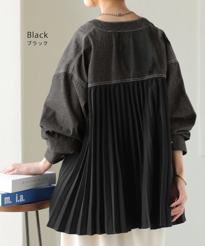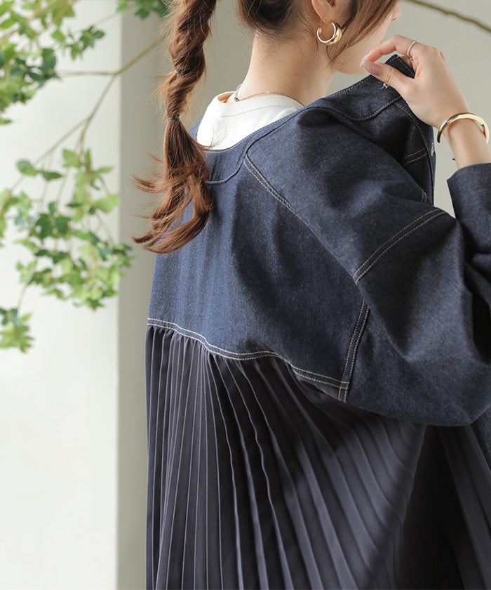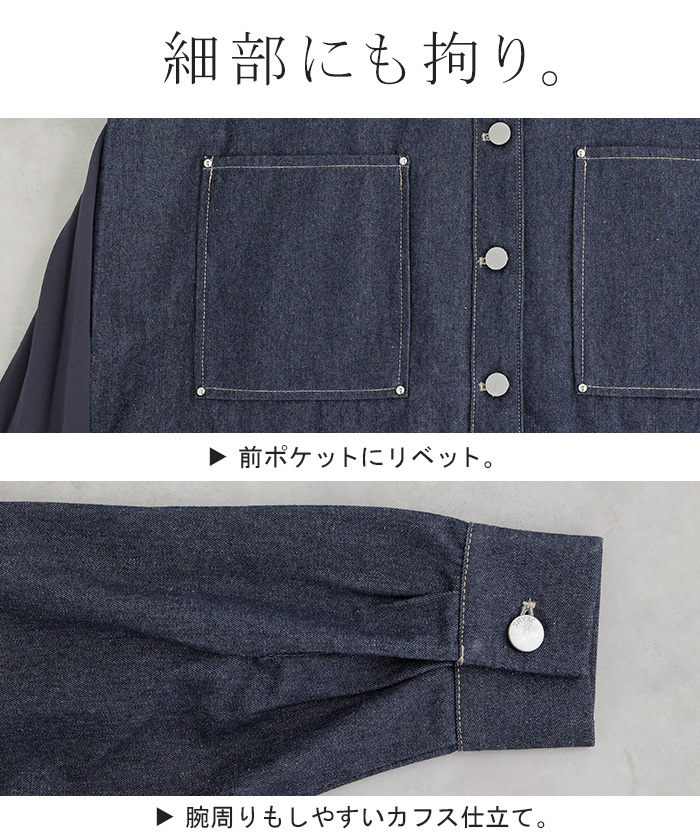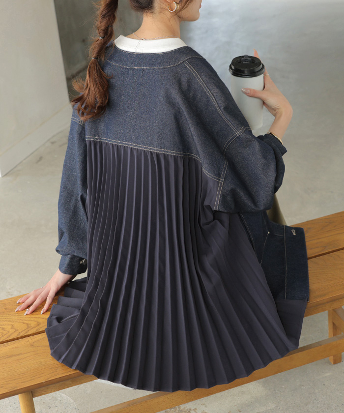 【早割10%OFF】 2026SS新作 アウター ジャケット デニム バックプリーツ 異素材 MIX レディース Gジャン ロング デニムジャケット シャツ ブルゾン ノーカラー 長袖 羽織 チュニック ジーンズ オーバーサイズ 大きいサイズ 体型カバー お尻が隠れる おしゃれ 黒 青 春 夏 HUG.U