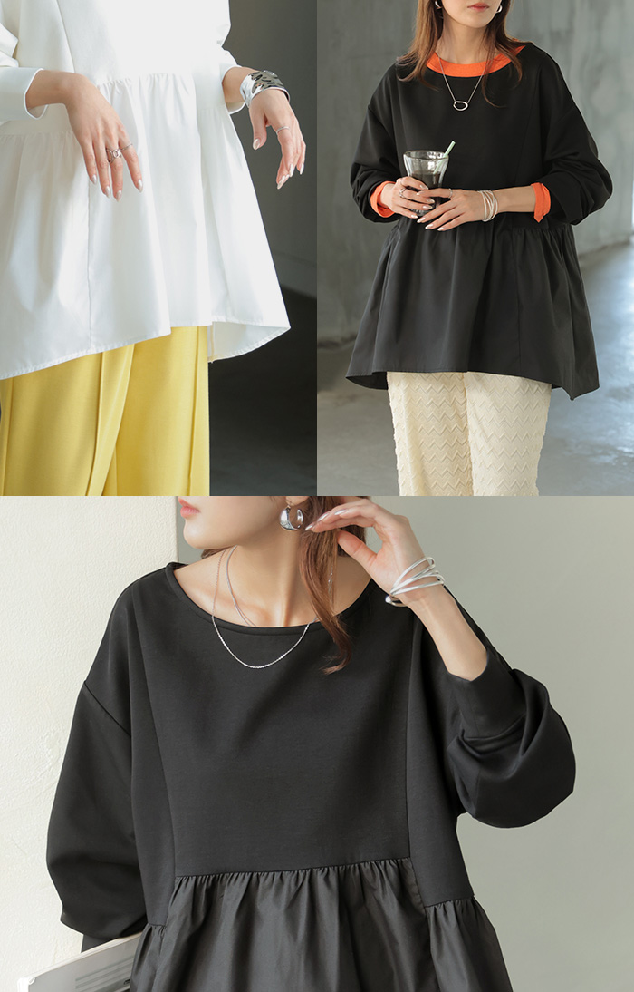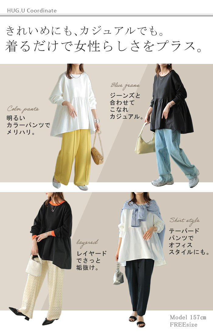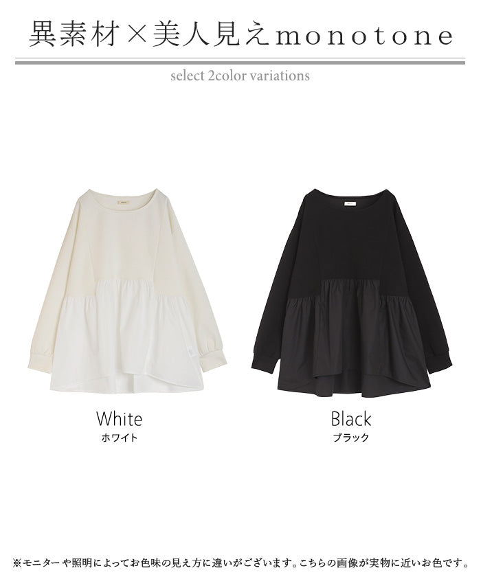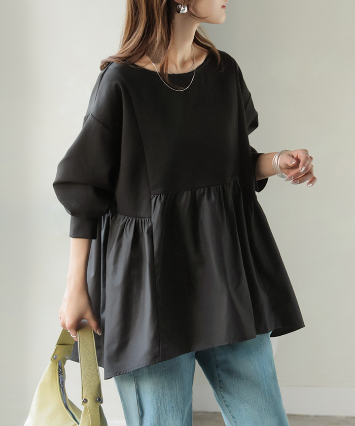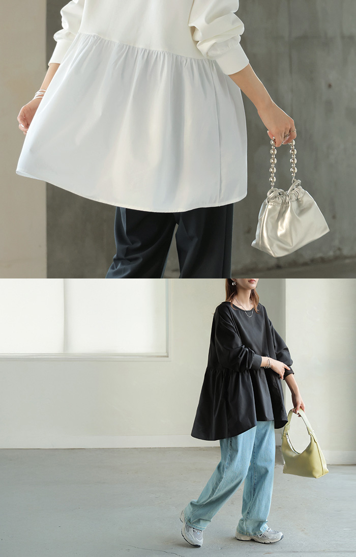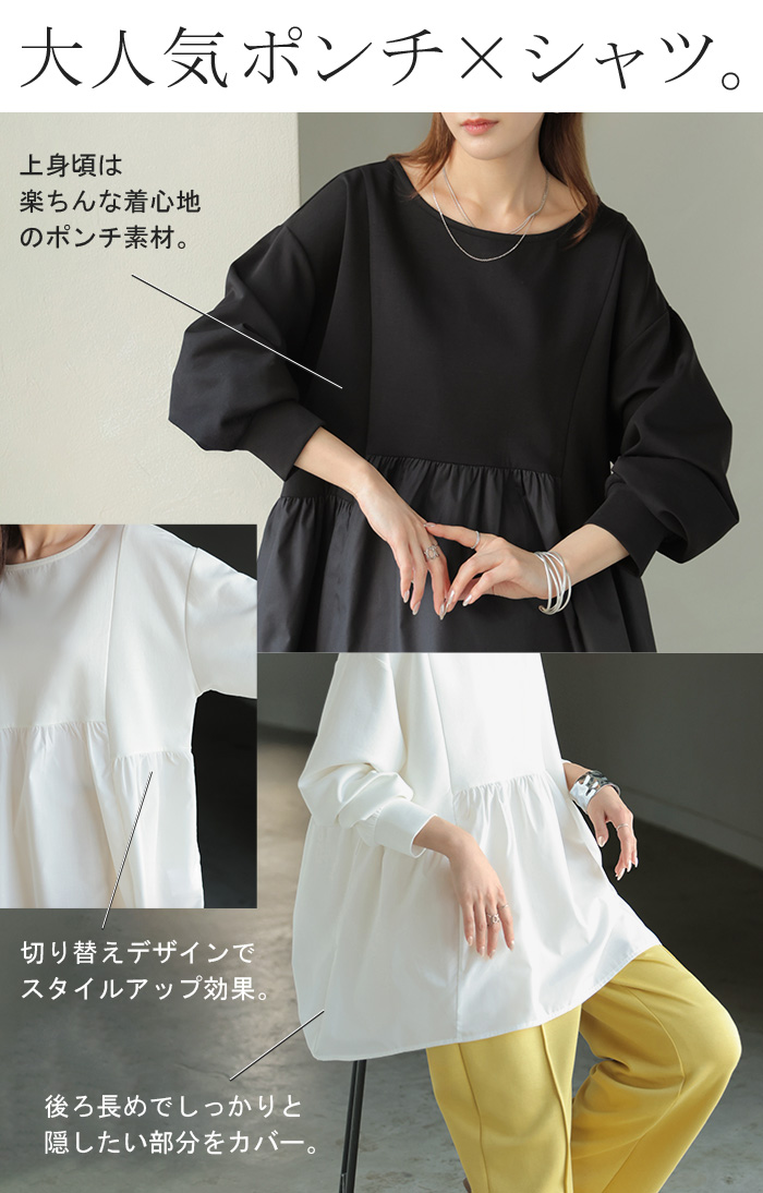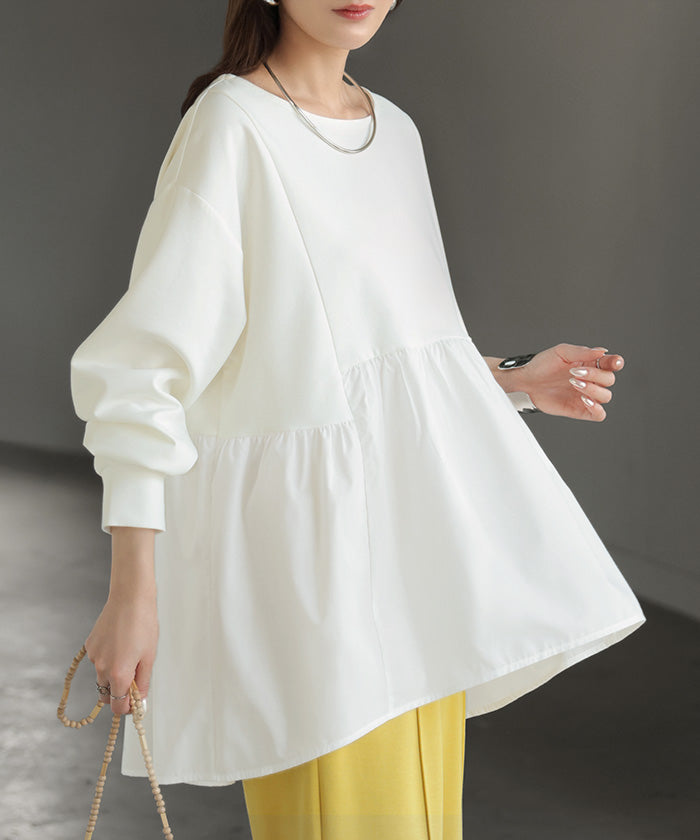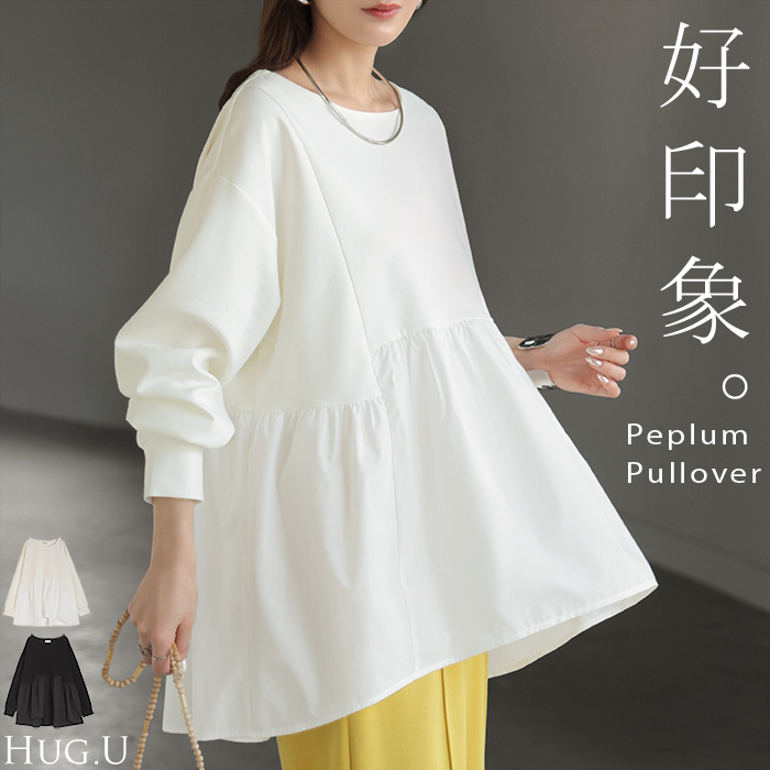 【早割10%OFF】 2026SS新作 トップス ポンチ ■一部2月下旬入荷 スウェット シャツ 異素材 ドッキング レディース ペプラム ロング トレーナー チュニック プルオーバー ペプラムトップス 無地 長袖 長い クルーネック ゆったり 体型カバー お尻が隠れる きれいめ 上品 カジュアル 黒 白 春 夏 HUG.U