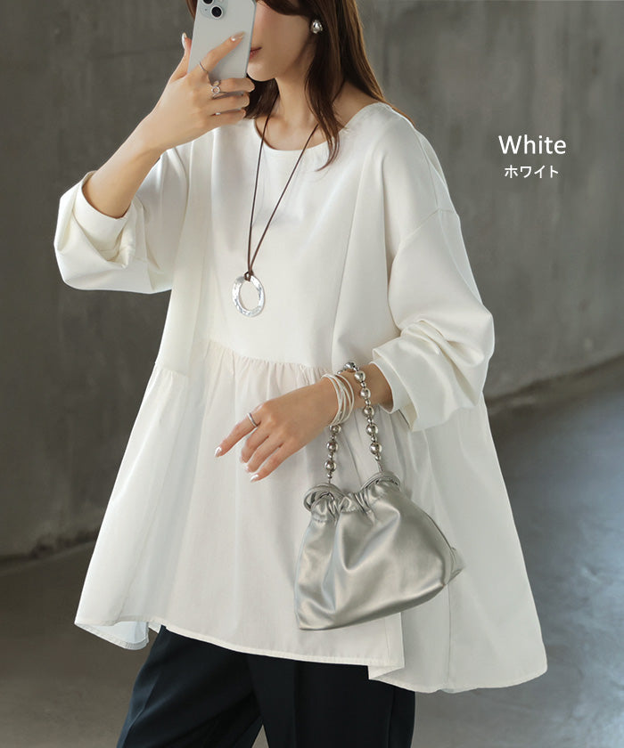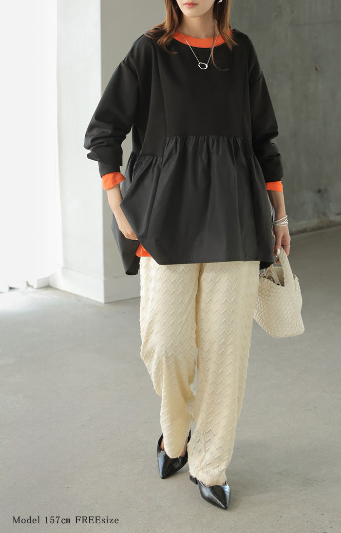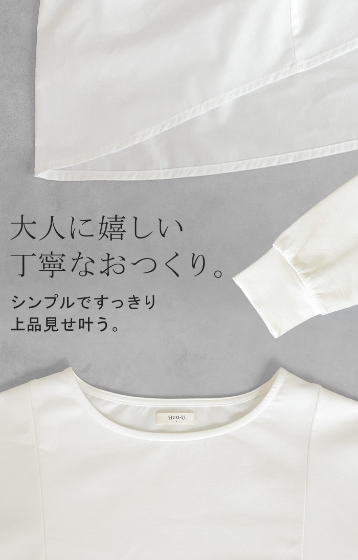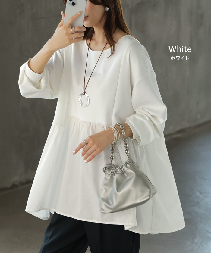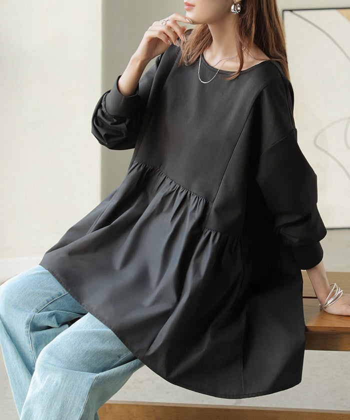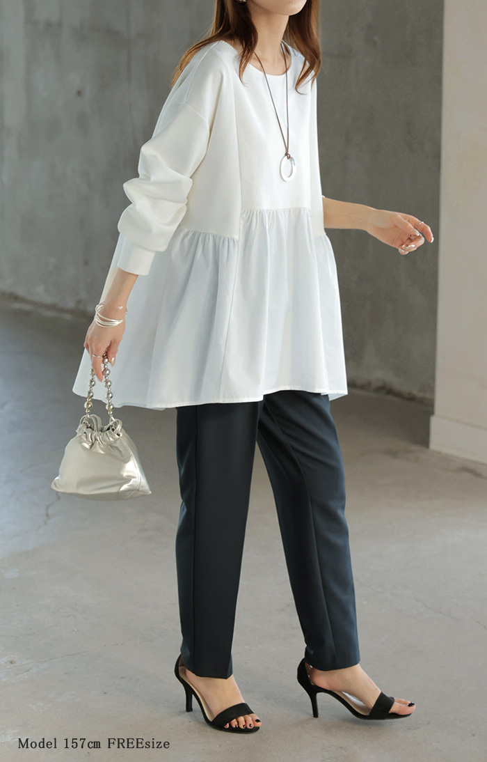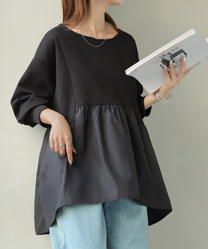 【早割10%OFF】 2026SS新作 トップス ポンチ ■一部2月下旬入荷 スウェット シャツ 異素材 ドッキング レディース ペプラム ロング トレーナー チュニック プルオーバー ペプラムトップス 無地 長袖 長い クルーネック ゆったり 体型カバー お尻が隠れる きれいめ 上品 カジュアル 黒 白 春 夏 HUG.U