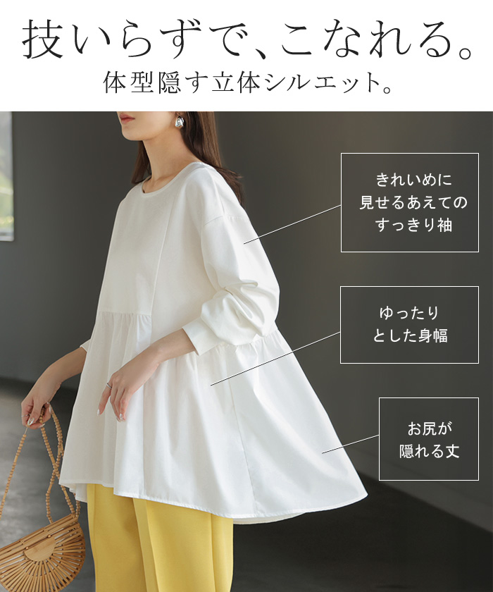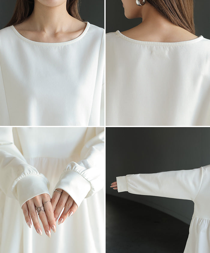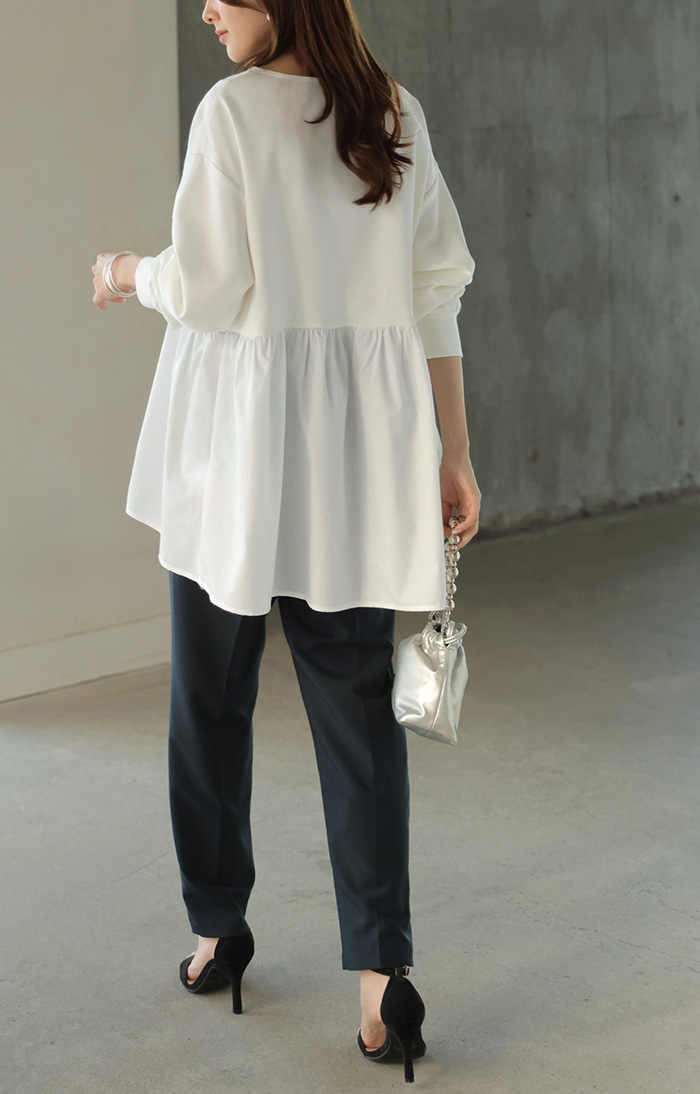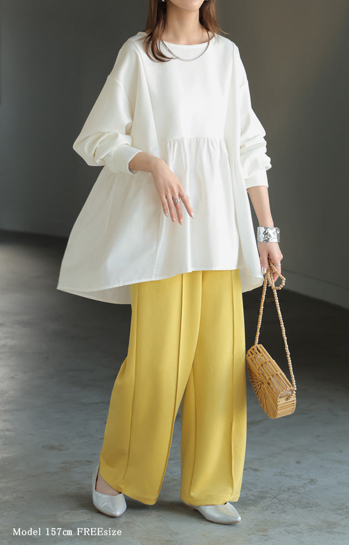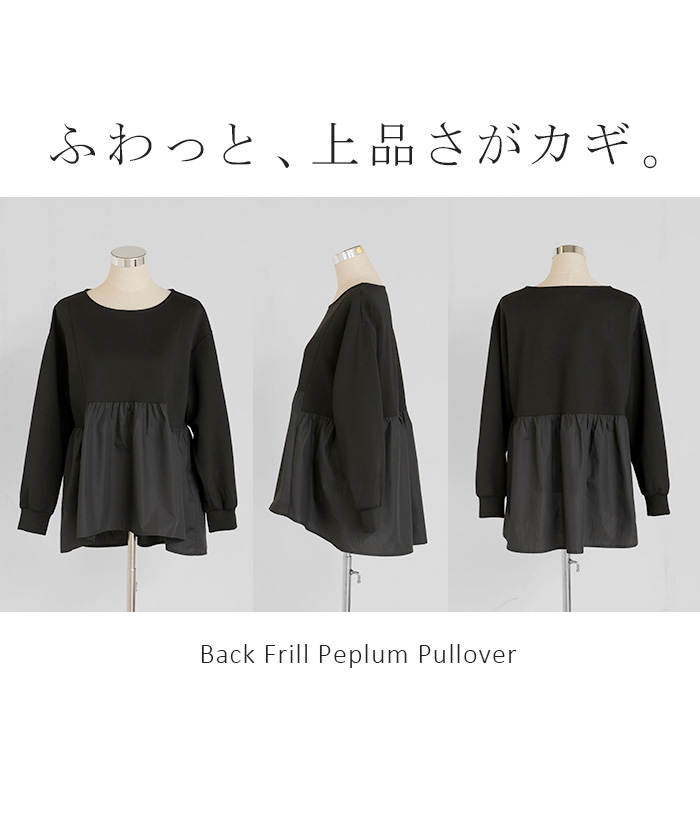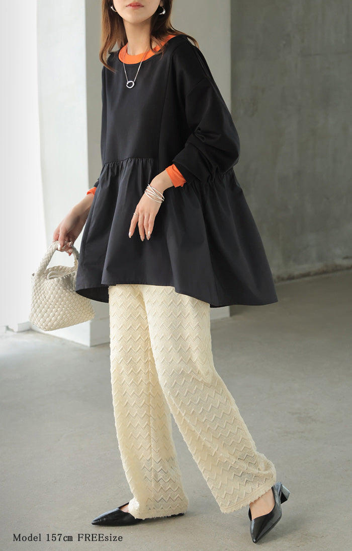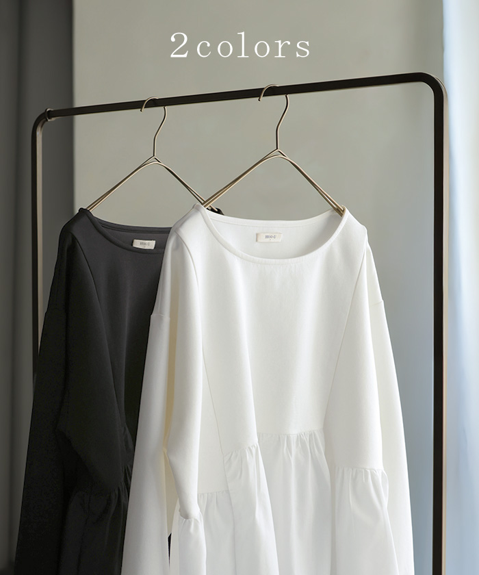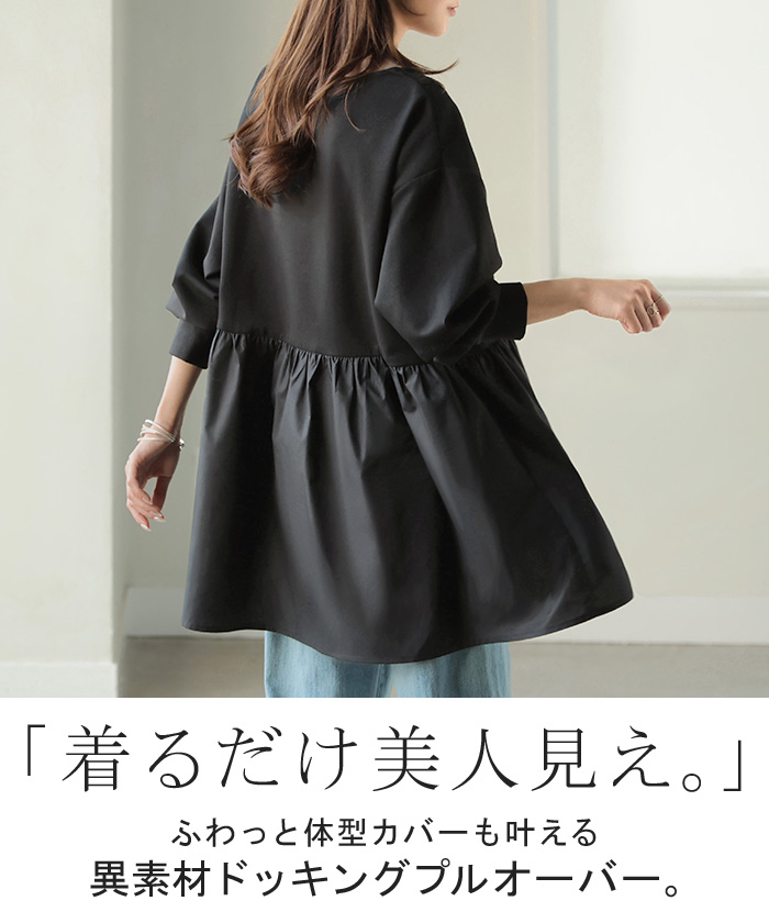 【早割10%OFF】 2026SS新作 トップス ポンチ ■一部2月下旬入荷 スウェット シャツ 異素材 ドッキング レディース ペプラム ロング トレーナー チュニック プルオーバー ペプラムトップス 無地 長袖 長い クルーネック ゆったり 体型カバー お尻が隠れる きれいめ 上品 カジュアル 黒 白 春 夏 HUG.U