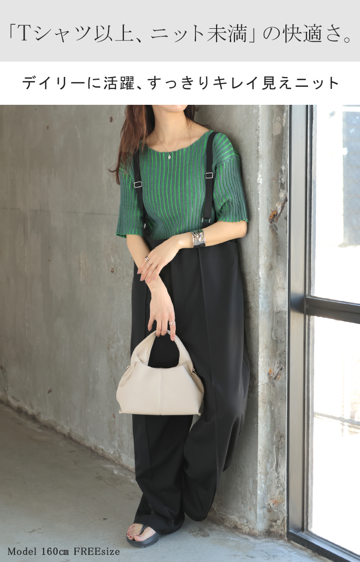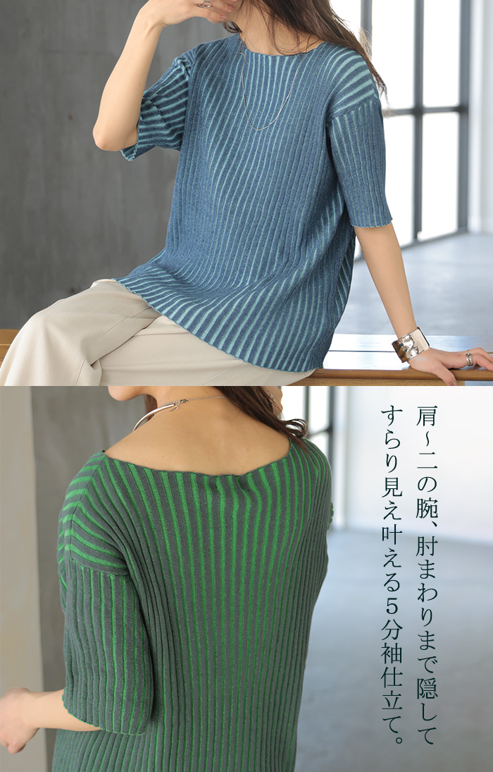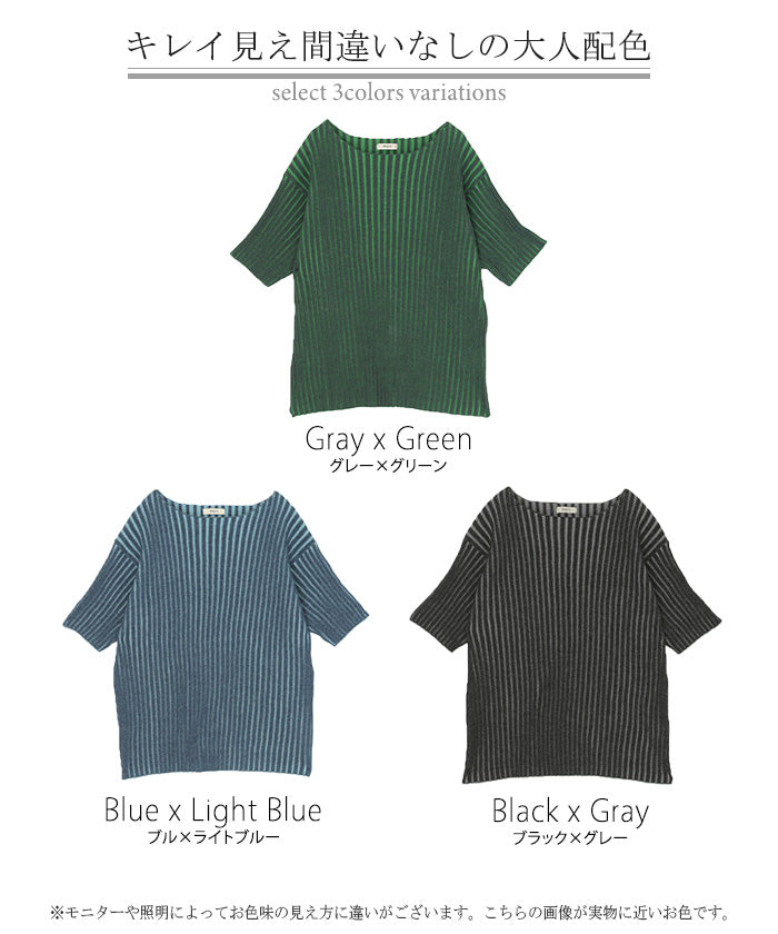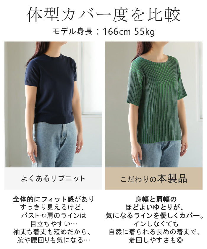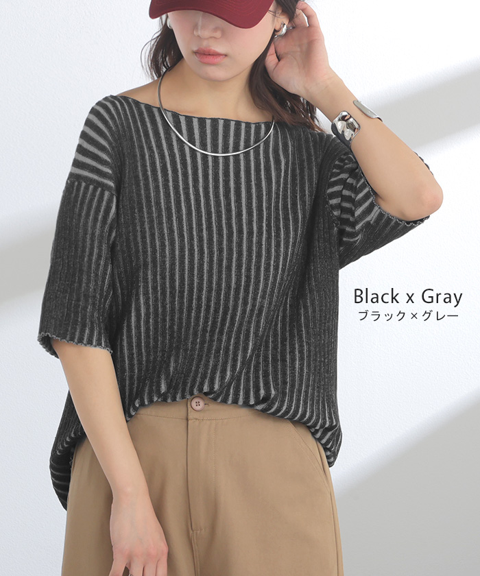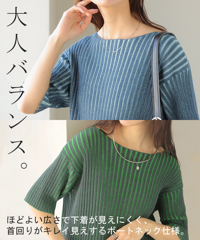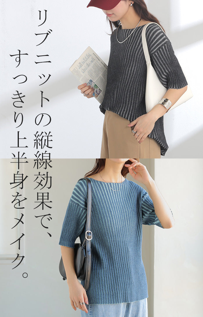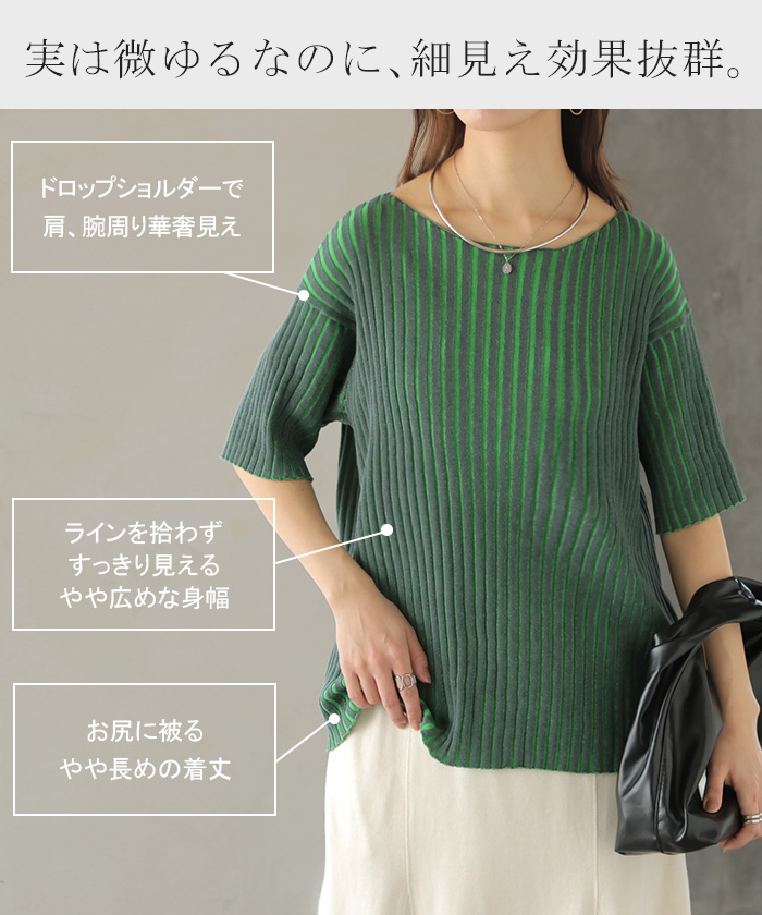 【早割10%OFF】 2026SS新作 サマーニット リブ 配色 綿100 レディース トップス Tシャツ 半袖 カットソー プルオーバー リブニット ニット ボートネック ストライプ ストレッチ ゆったり 体型カバー 二の腕カバー 大きいサイズ ドロップショルダー カジュアル 黒 グレー 春 夏 HUG.U