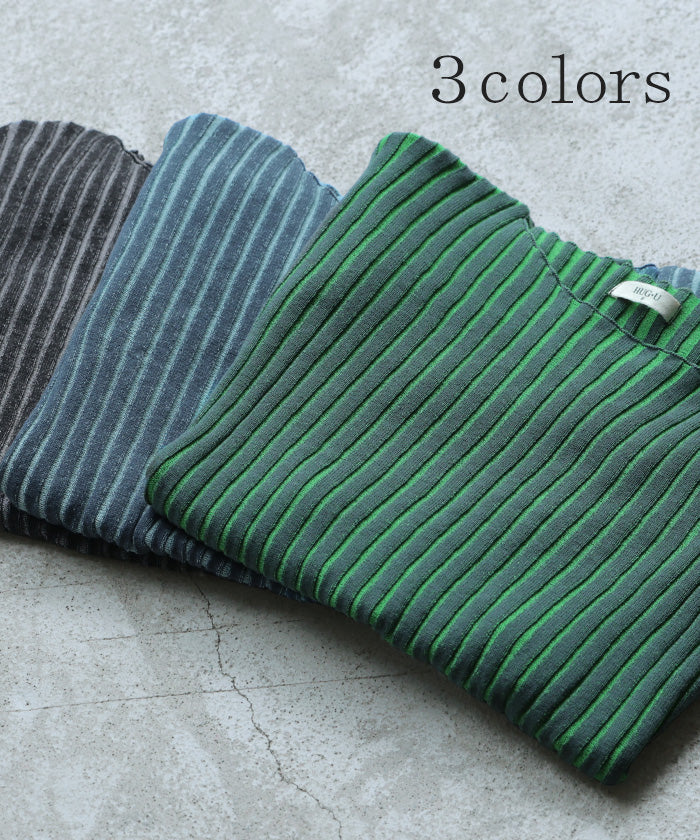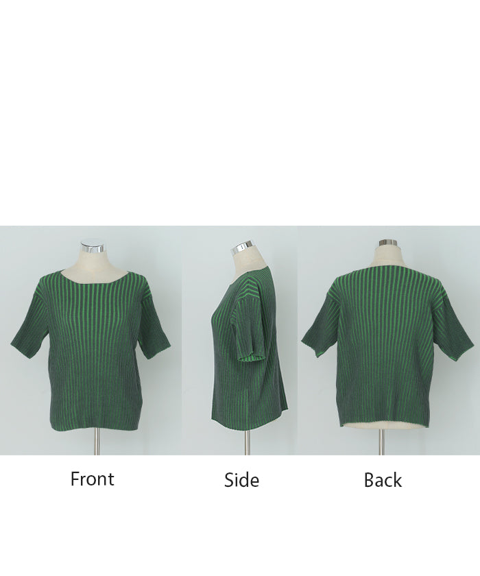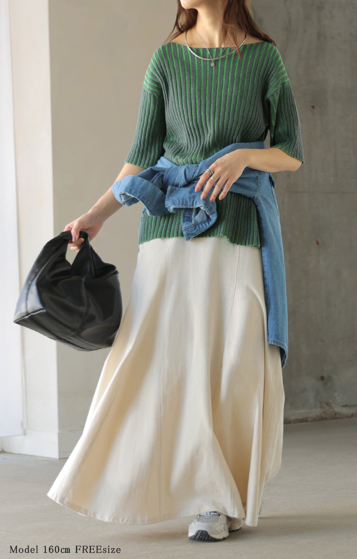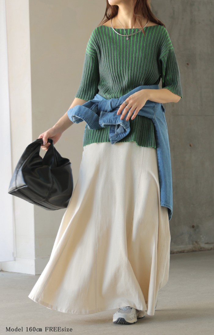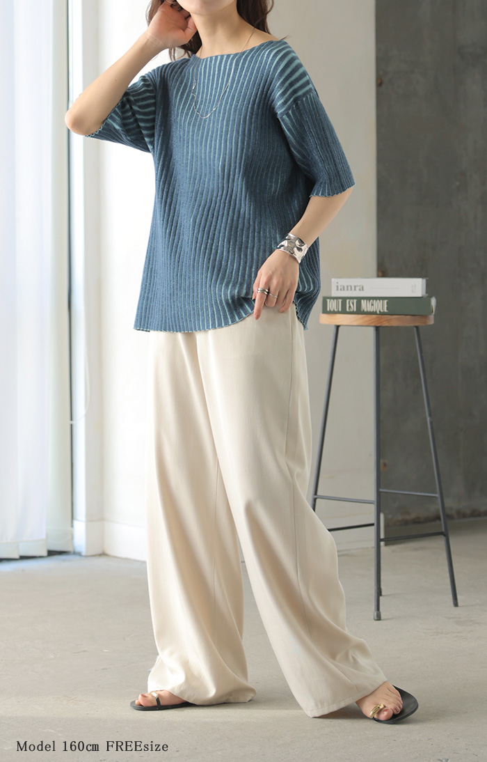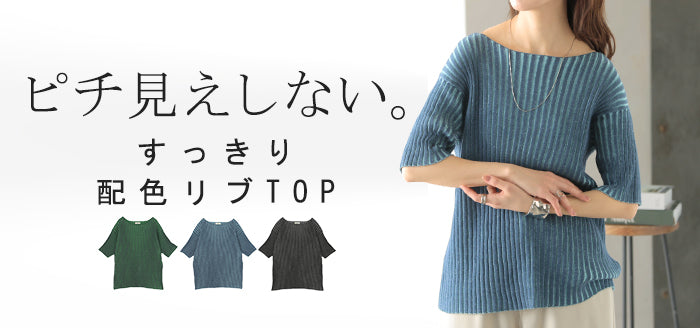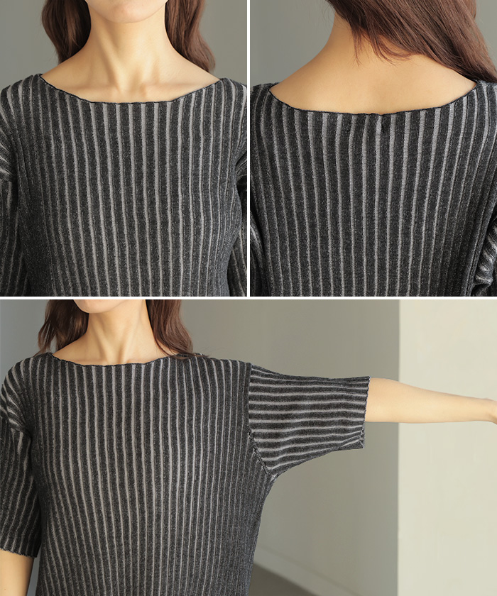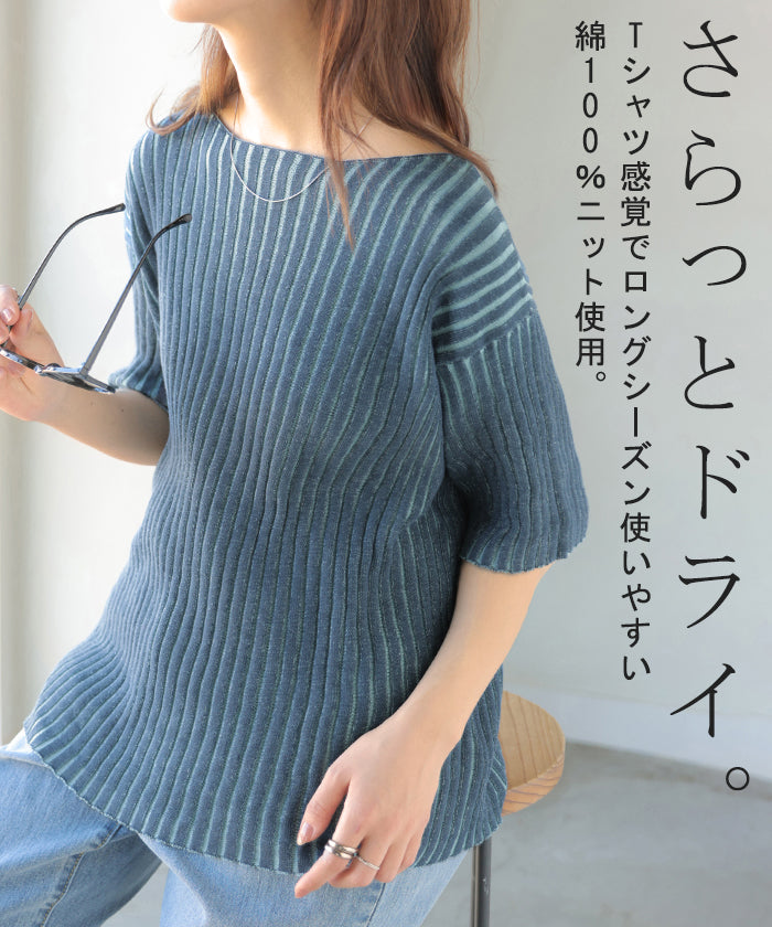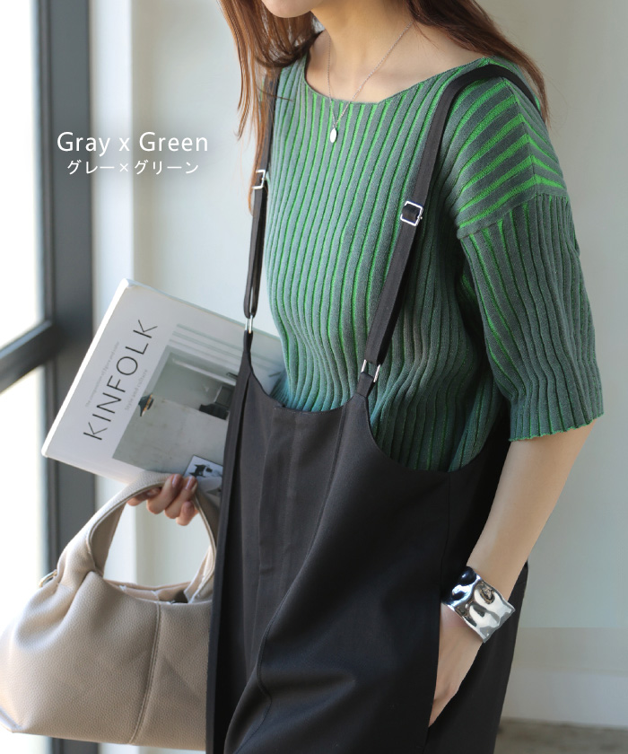 【早割10%OFF】 2026SS新作 サマーニット リブ 配色 綿100 レディース トップス Tシャツ 半袖 カットソー プルオーバー リブニット ニット ボートネック ストライプ ストレッチ ゆったり 体型カバー 二の腕カバー 大きいサイズ ドロップショルダー カジュアル 黒 グレー 春 夏 HUG.U