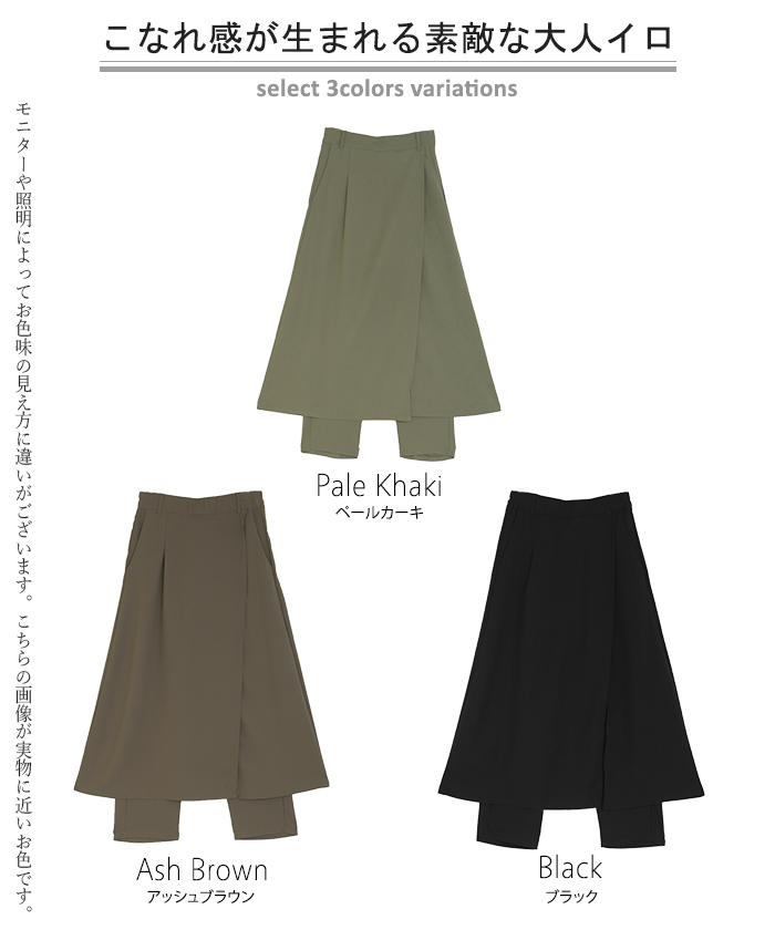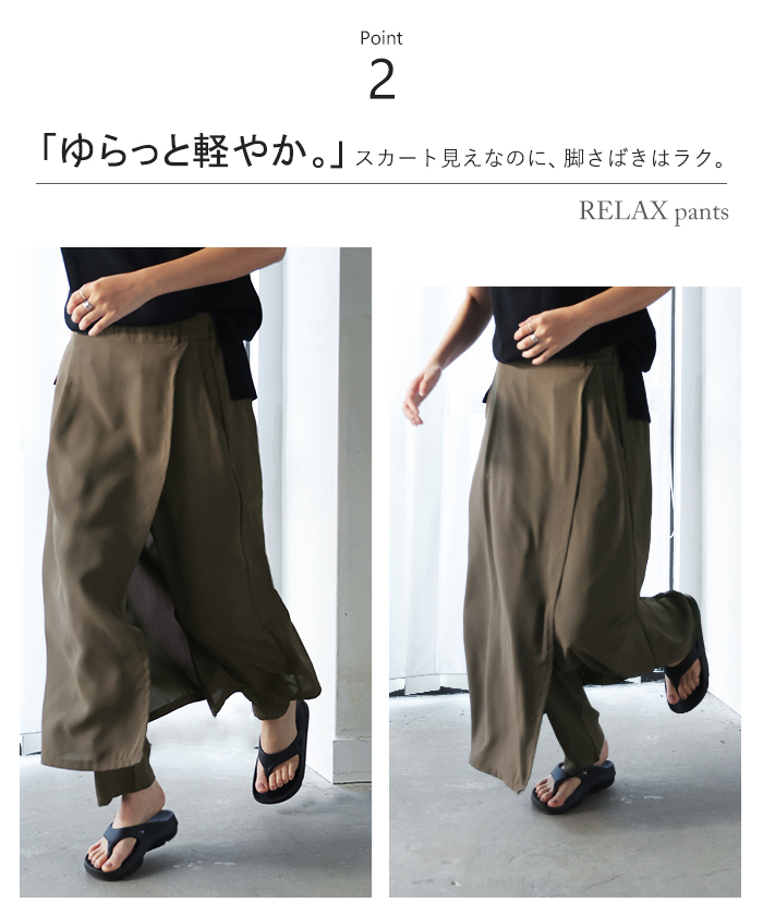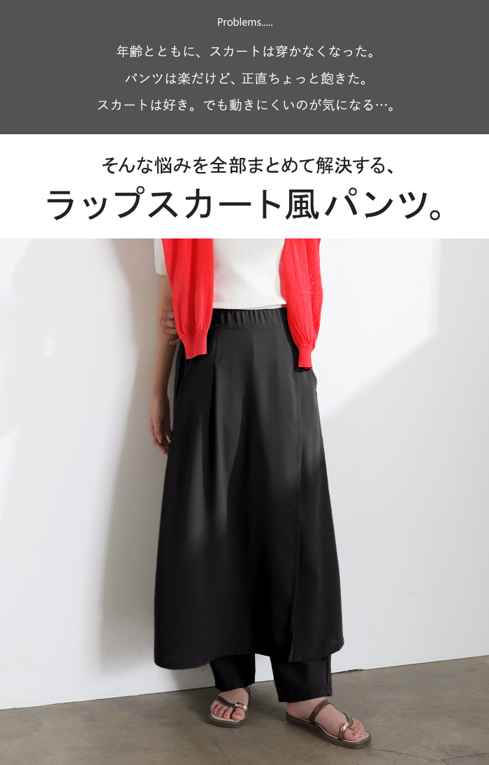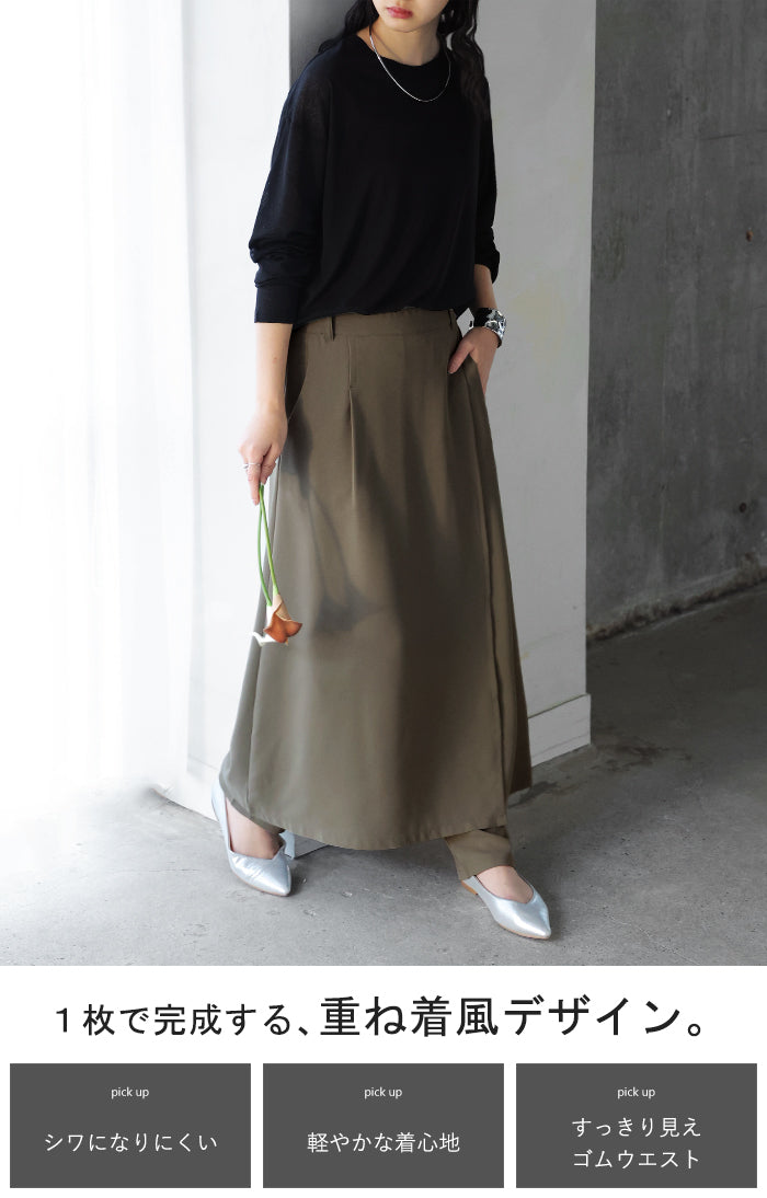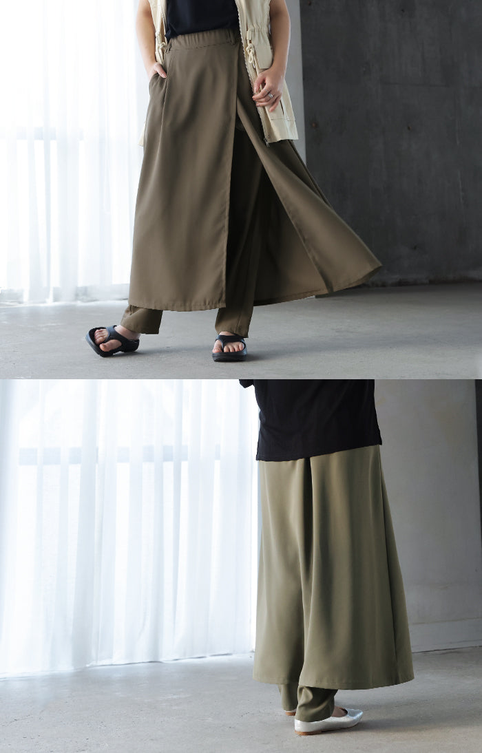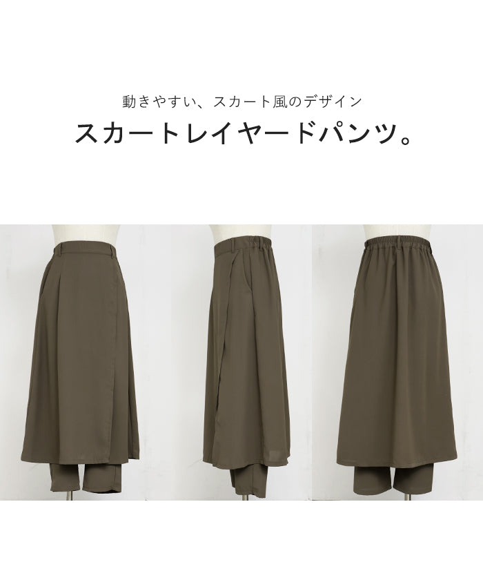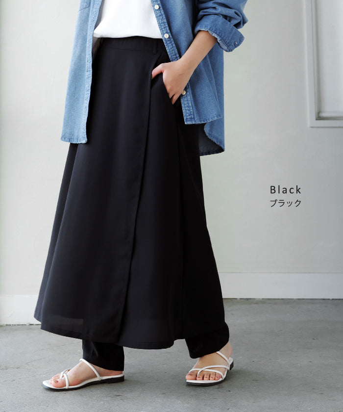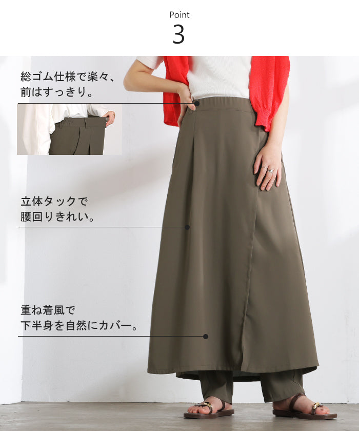 【早割10%OFF】2026SS新作 パンツ スカート レディース ボトムス スカパン フレア ラップスカート風 重ね着風 レイヤード 体型カバー ワイドパンツ ズボン ウエストゴム シワになりにくい 軽い 軽量 動きやすい きれいめ カジュアル 大きいサイズ ブラック ブラウン 春 夏 HUG.U
