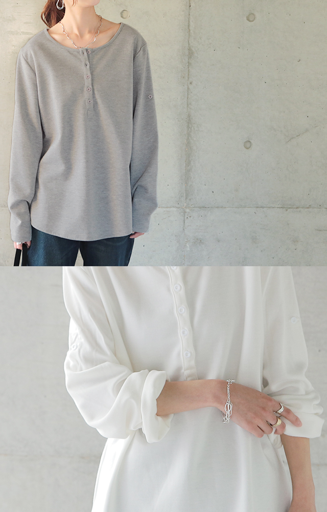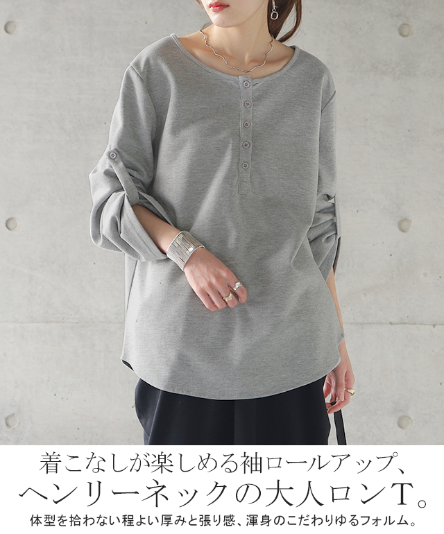 ヘンリーネック 長袖 Tシャツ レディース ロンT ロングTシャツ カットソー トップス ボタン シンプル 無地 五分袖 七分袖 ロールアップ Uネック Vネック スウェット ミディアム ゆる トレーナー 大きいサイズ 黒 白 グレー 春 夏 メール便