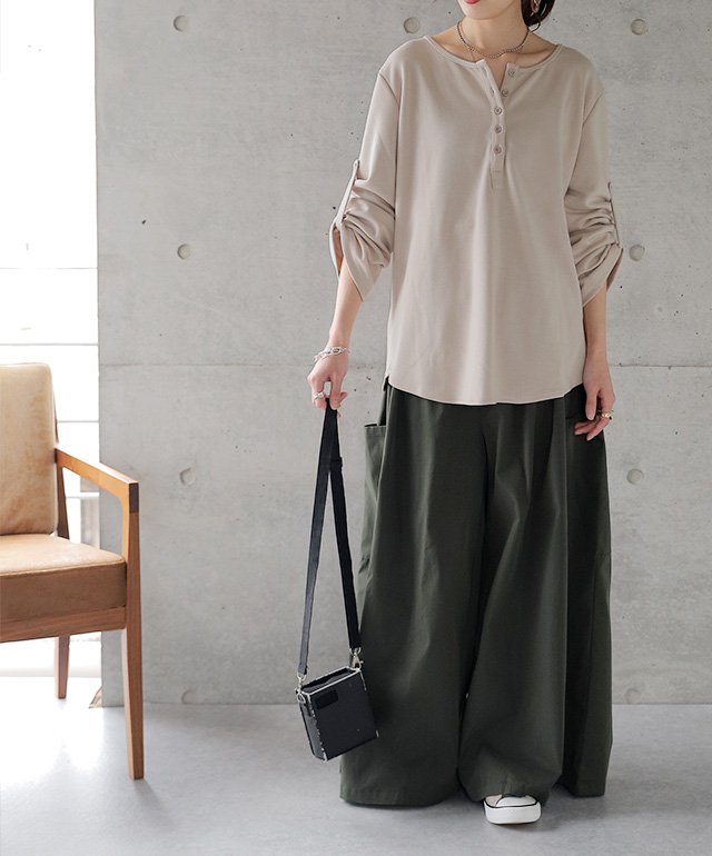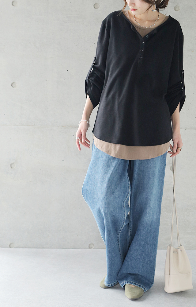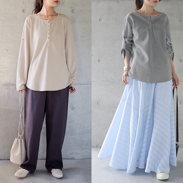 着こなしが楽しめるヘンリーネックTシャツです。
