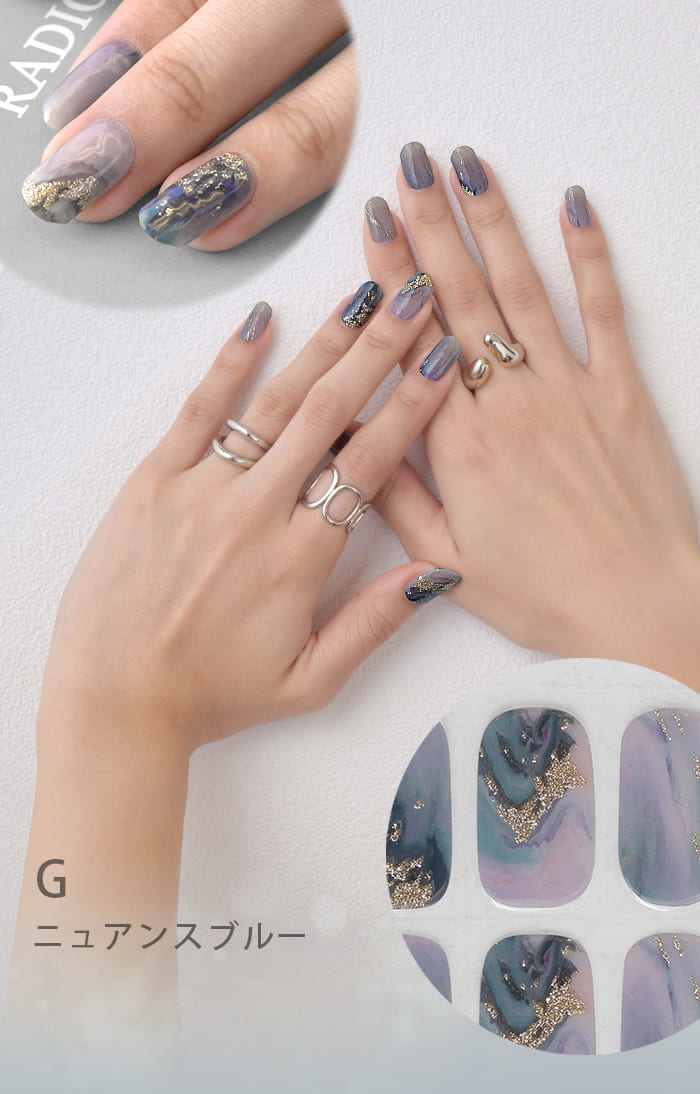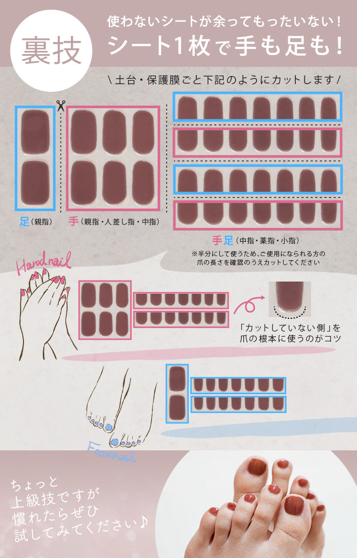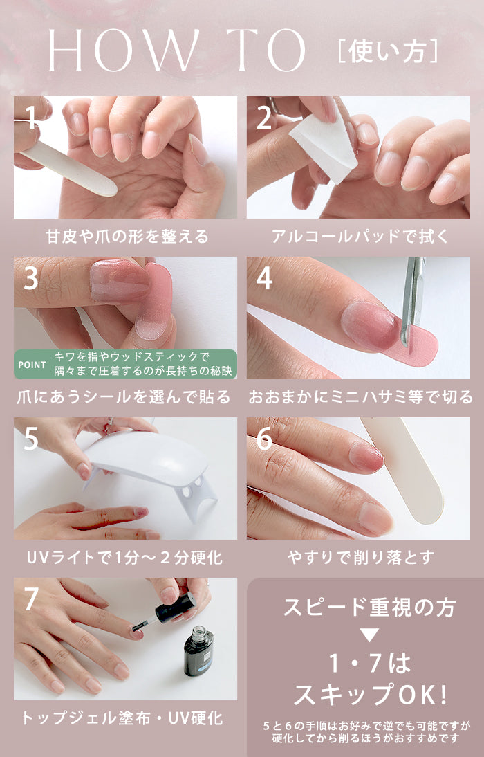 【商品説明】ジェルネイルシートを使用した新感覚ネイルです。既存のジェルネイルシールとは違った新製法で作られたネイルシール。ジェルネイルのカラーリングにシート状に半硬化させたジェルネイルシートを使用。とても柔らかく収縮性があり爪にフィットすることで負担を軽減しています。剥がれにくく、洗髪時に髪の毛が挟まることもない使ってビックリの持続力と使用感。貼付後、別売りのUVライトを照射すると硬化します。【注意事項】◆開封後はできるだけお早めにご使用ください。◆余ったシートを保管する場合は黒の遮光袋に戻し、光が入らないようご注意ください。◆気温が下がると一時的にシートが固くなる場合がございます。その場合は遮光袋の上から手で挟んで60秒ほど温めてからご使用ください。