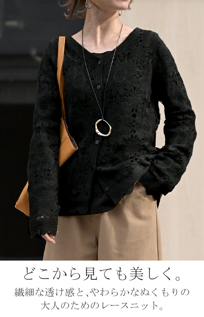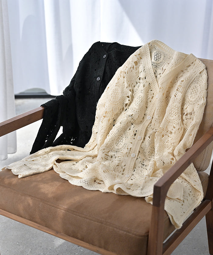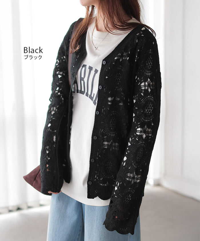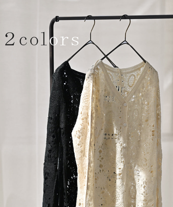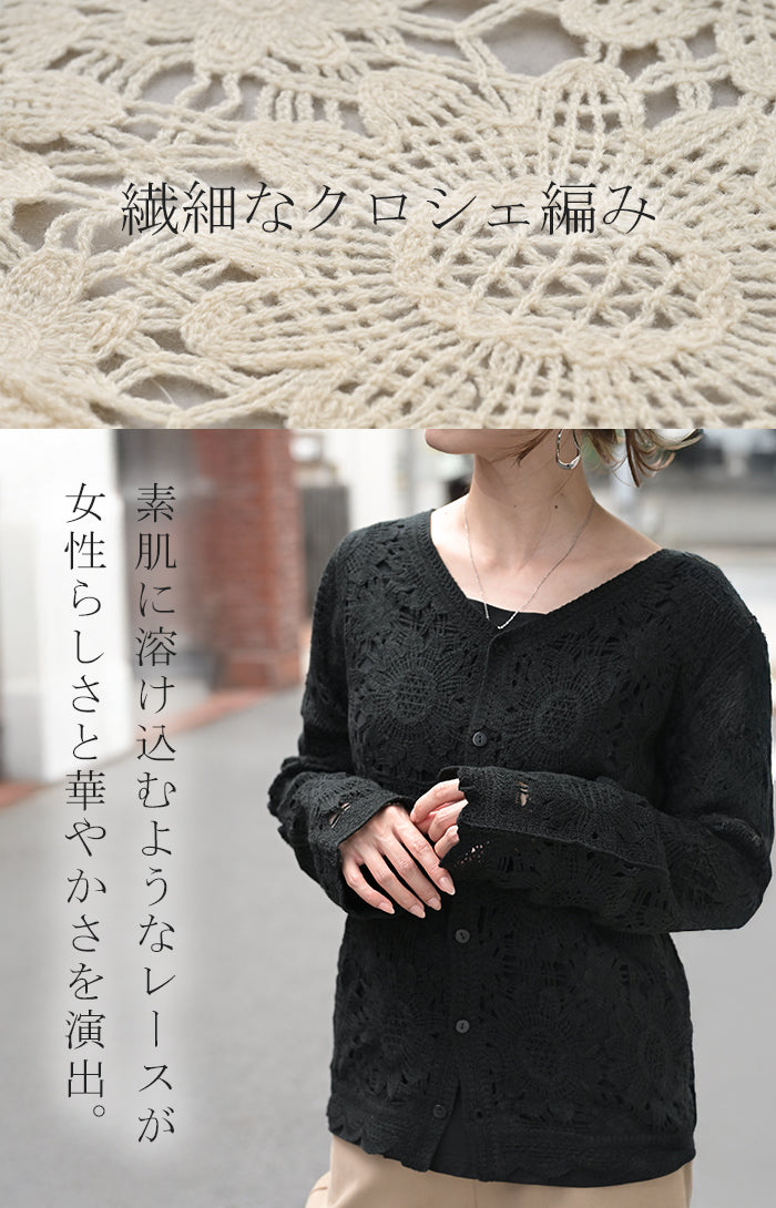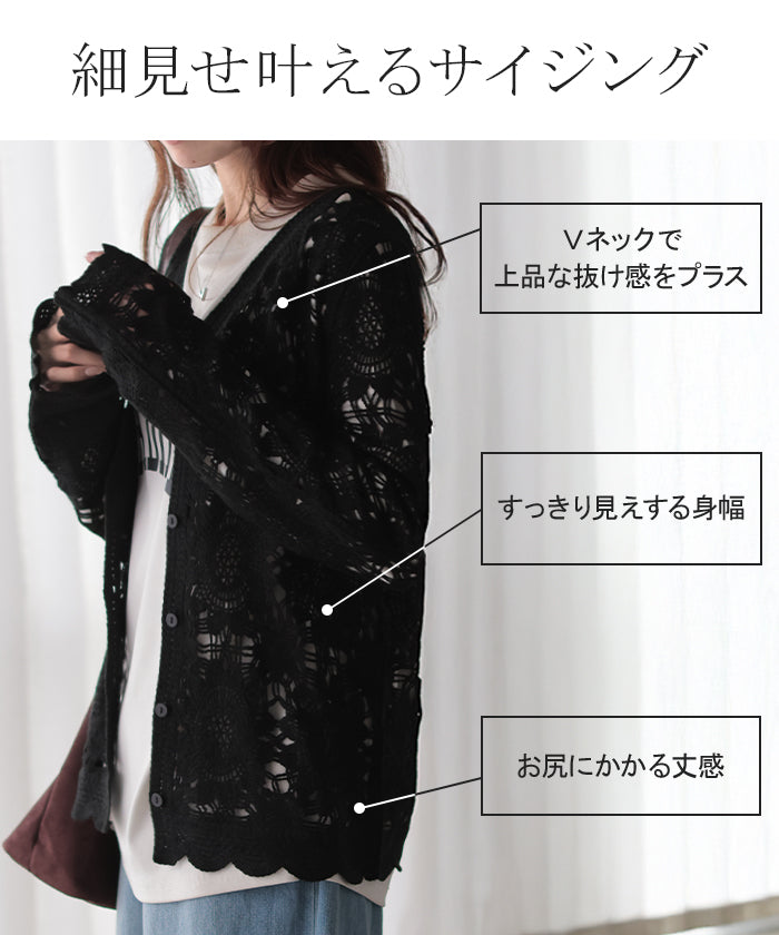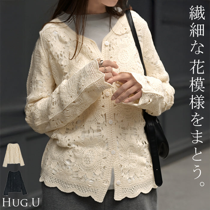 カーディガン レース 透かし編み レディース トップス カーデ セーター モヘアニット メッシュ ニットカーディガン 長袖 長い レイヤード 薄手 透け感 Vネック 総レース クロシェ編み 花柄 花柄レース 体型カバー ナチュラル 黒 アイボリー 秋 冬 HUG.U