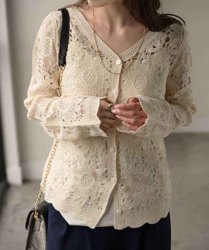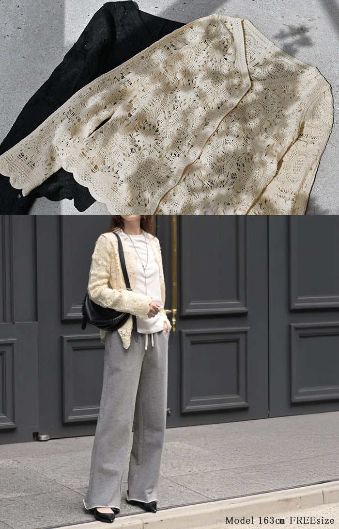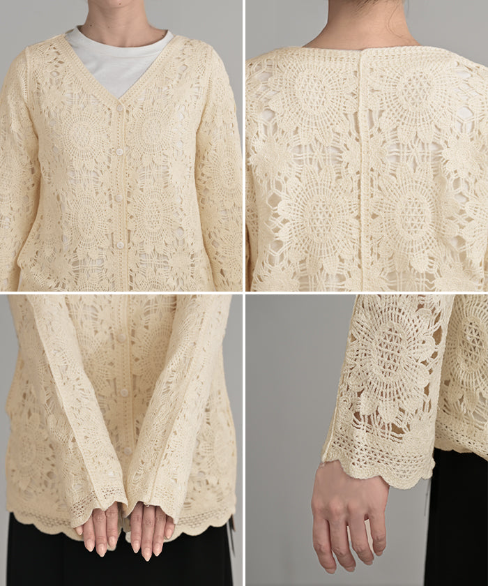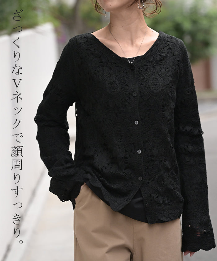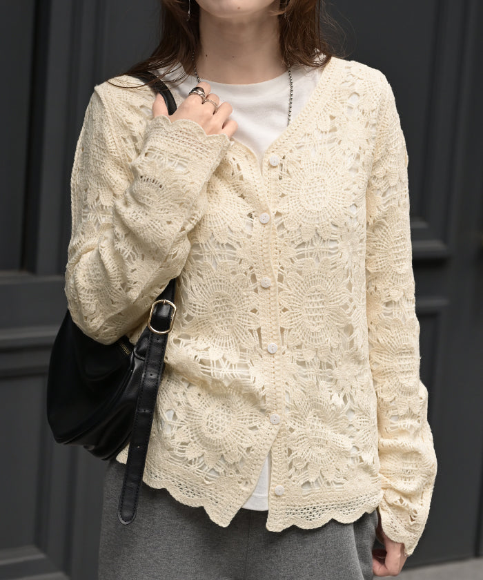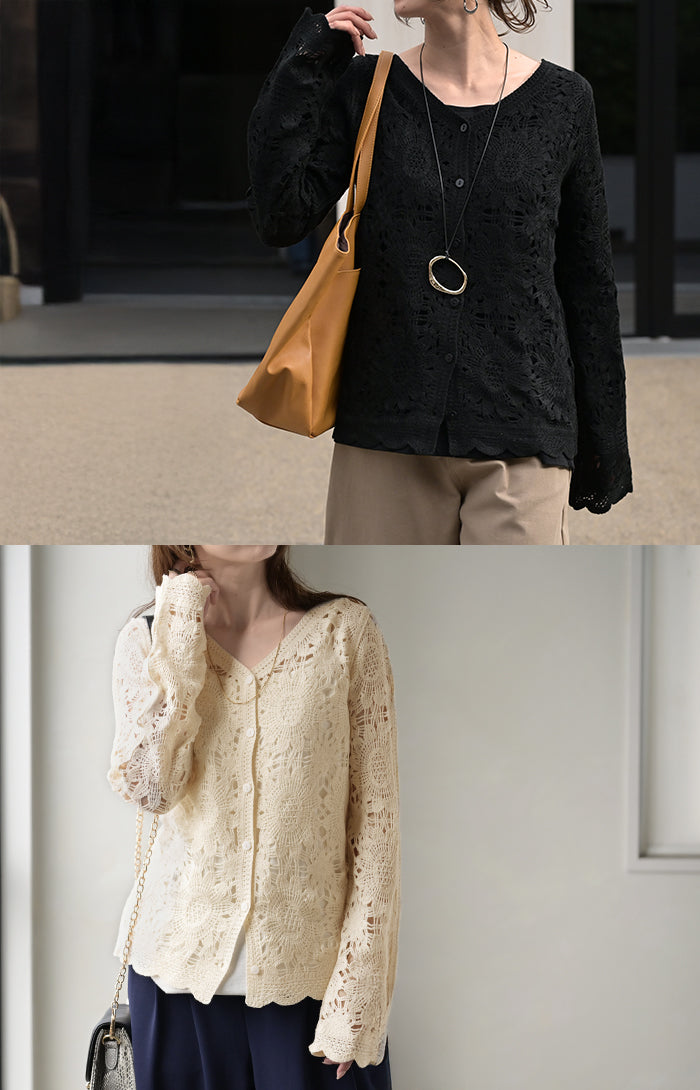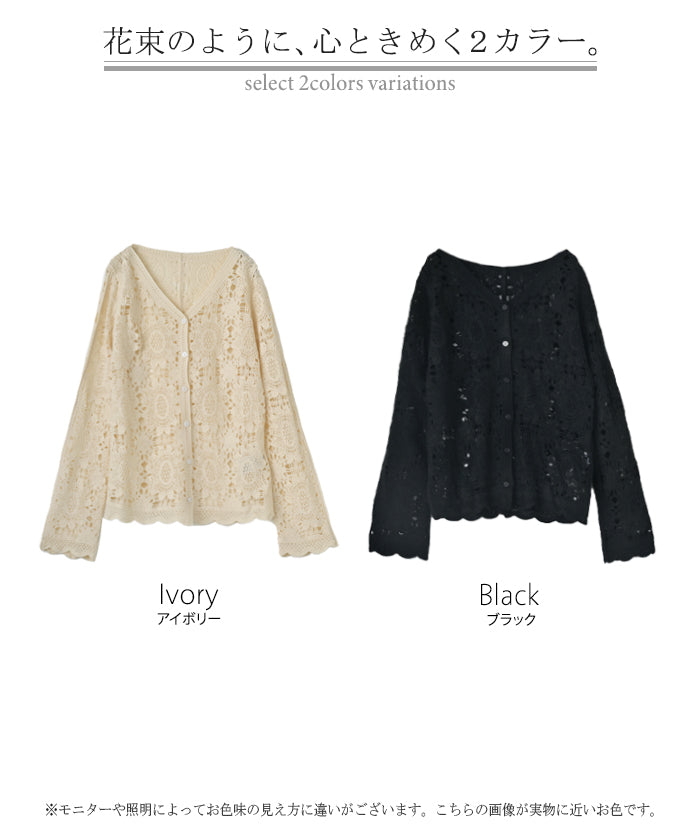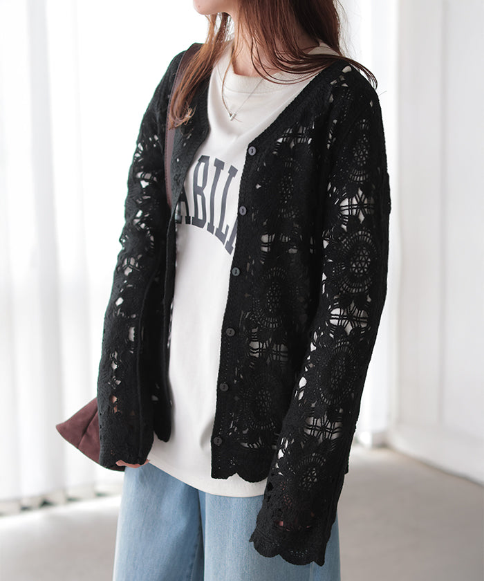 カーディガン レース 透かし編み レディース トップス カーデ セーター モヘアニット メッシュ ニットカーディガン 長袖 長い レイヤード 薄手 透け感 Vネック 総レース クロシェ編み 花柄 花柄レース 体型カバー ナチュラル 黒 アイボリー 秋 冬 HUG.U