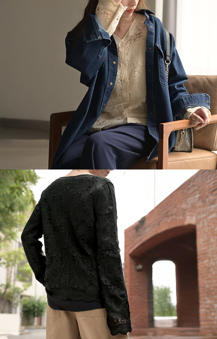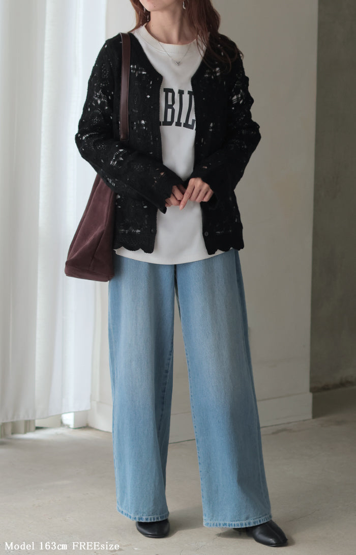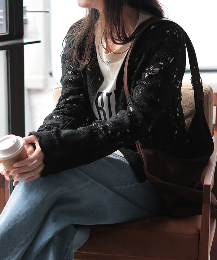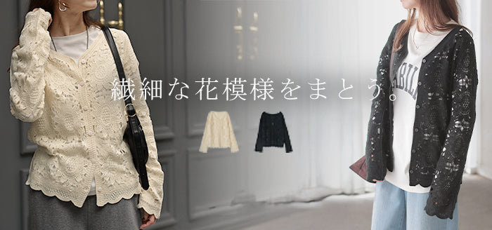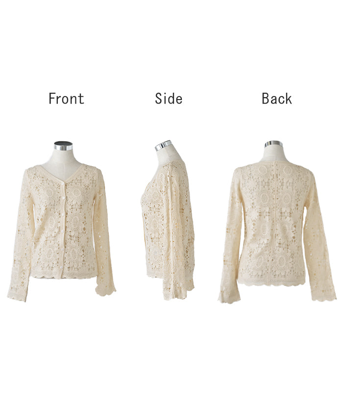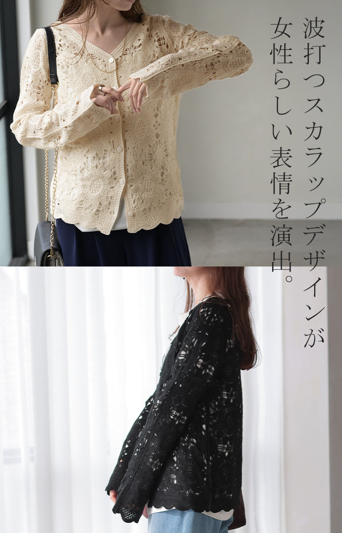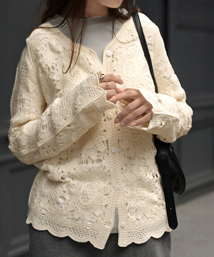 カーディガン レース 透かし編み レディース トップス カーデ セーター モヘアニット メッシュ ニットカーディガン 長袖 長い レイヤード 薄手 透け感 Vネック 総レース クロシェ編み 花柄 花柄レース 体型カバー ナチュラル 黒 アイボリー 秋 冬 HUG.U