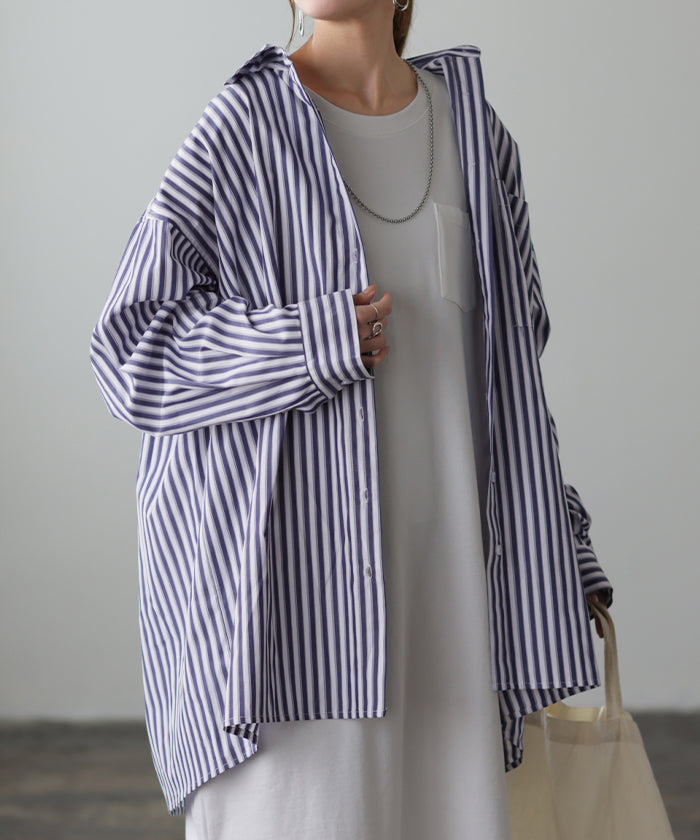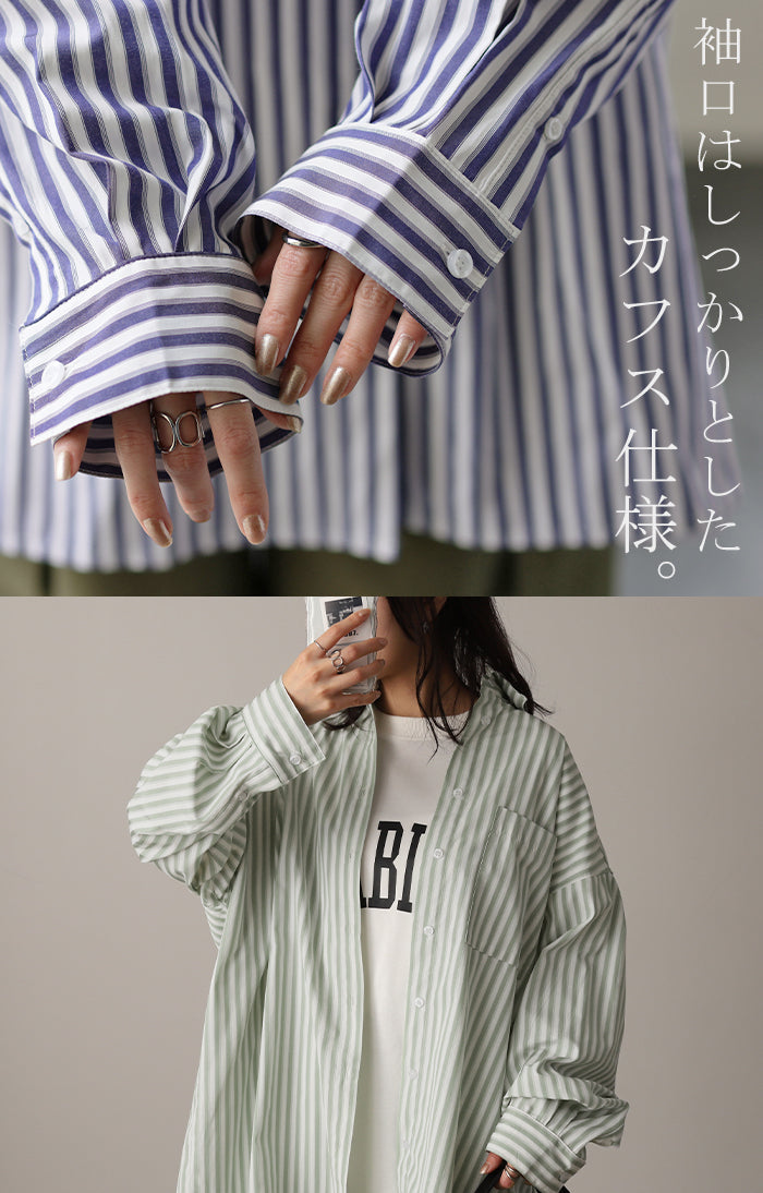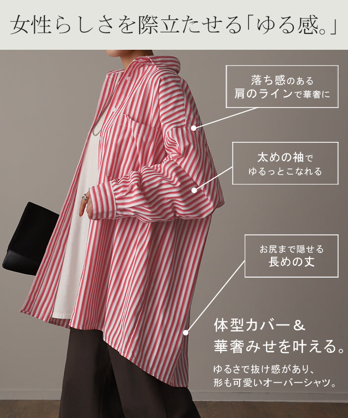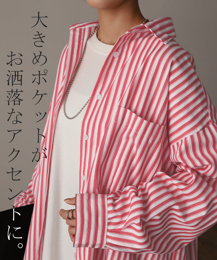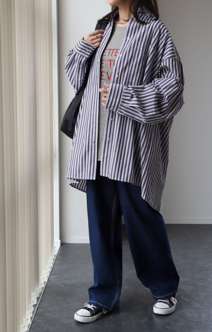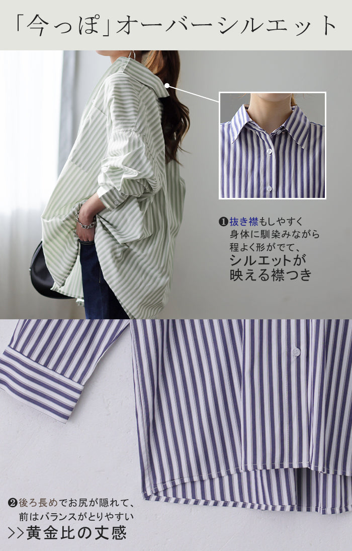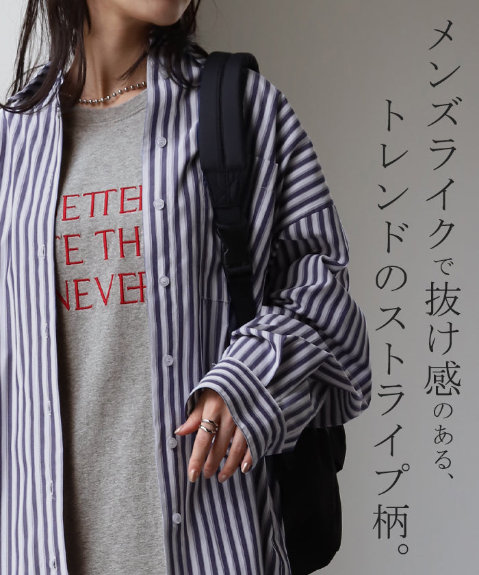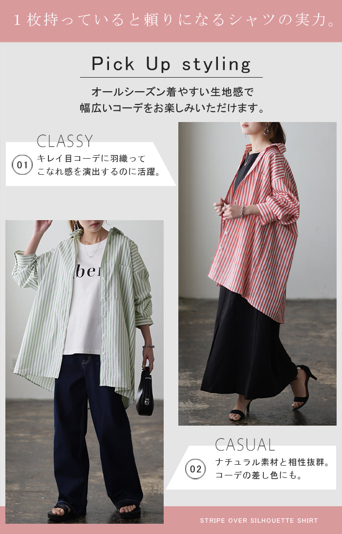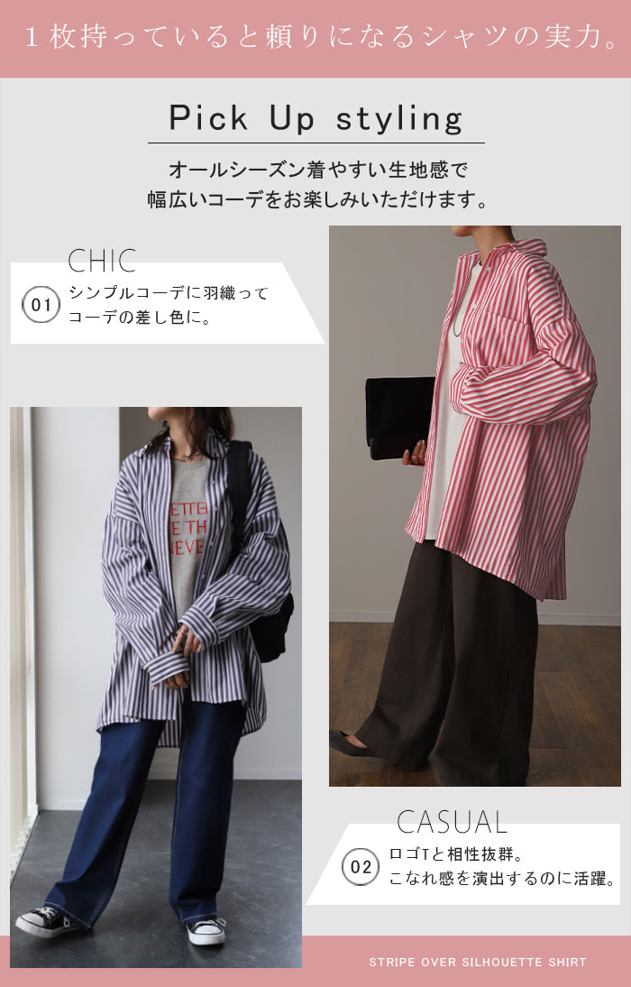 取り入れるだけでトレンド感もアップするオーバーサイズストライプシャツです。着るだけで自然と立体感が出てこなれた雰囲気に仕上げてくれる一着です。レイヤードでも一枚着でも着映えるので様々なシーンで活躍してくれるアイテムです。