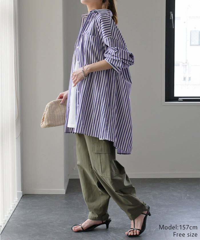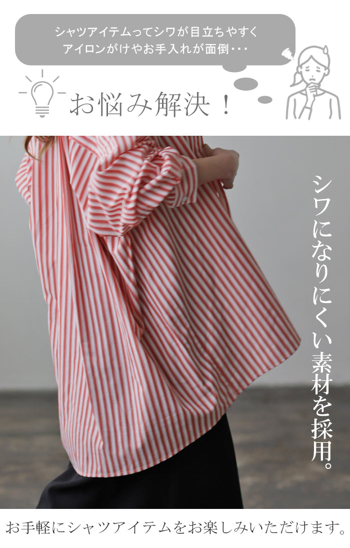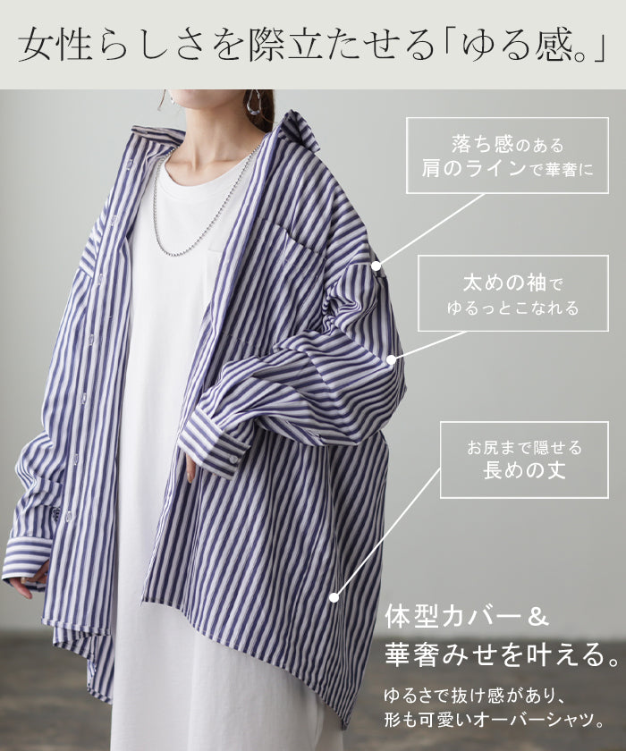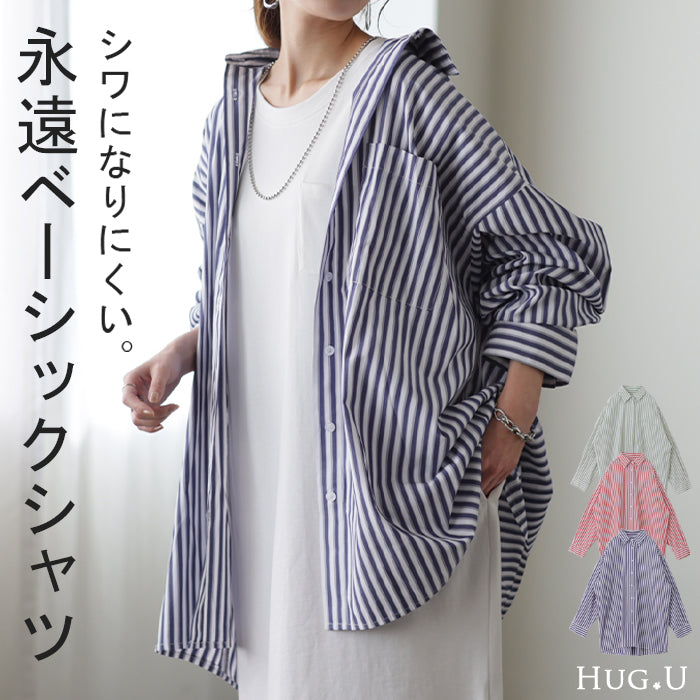 バサっと大きい『 長~く使える ストライプシャツ 』 体型カバー トップス レディース ストライプ シャツ シワになりにくい チュニック 長袖 カラーシャツ 大きいサイズ ロングシャツ ロング ブラウス 羽織 オーバーサイズ ブルー 重ね着 春 夏 HUG.U メール便