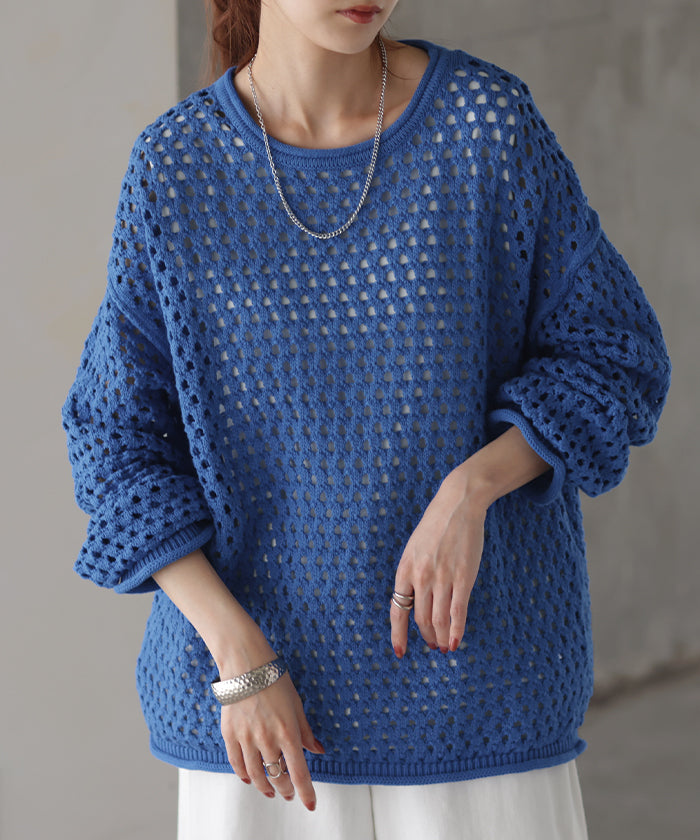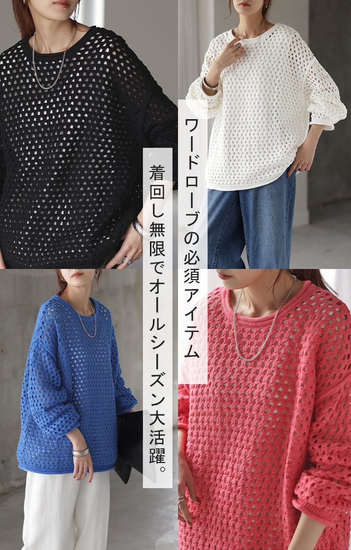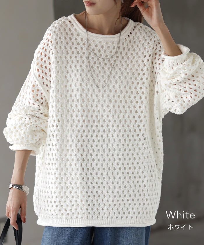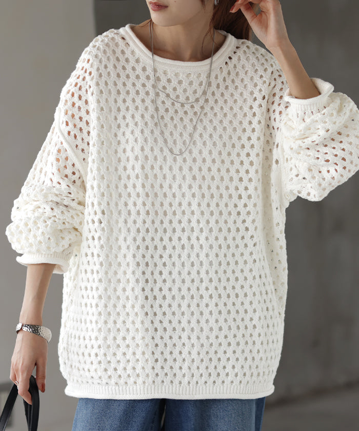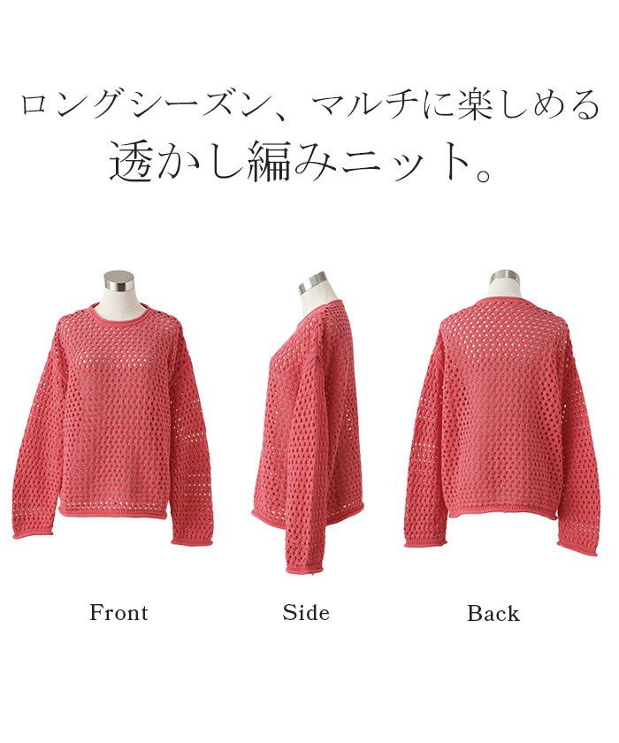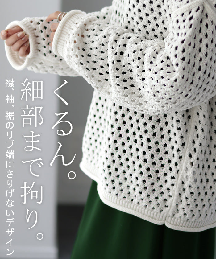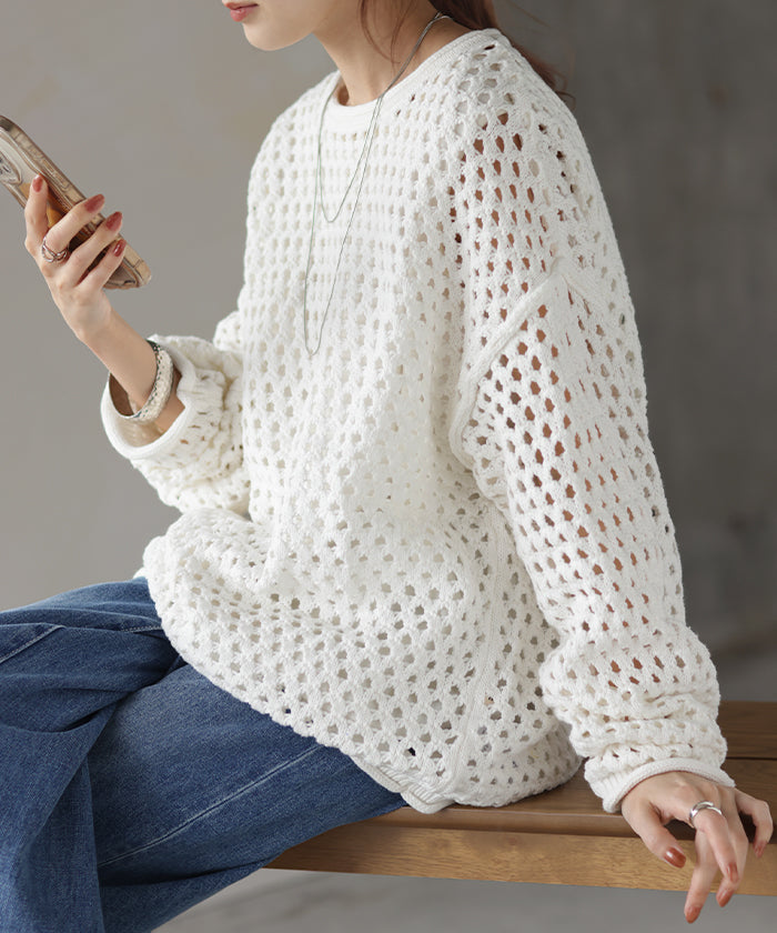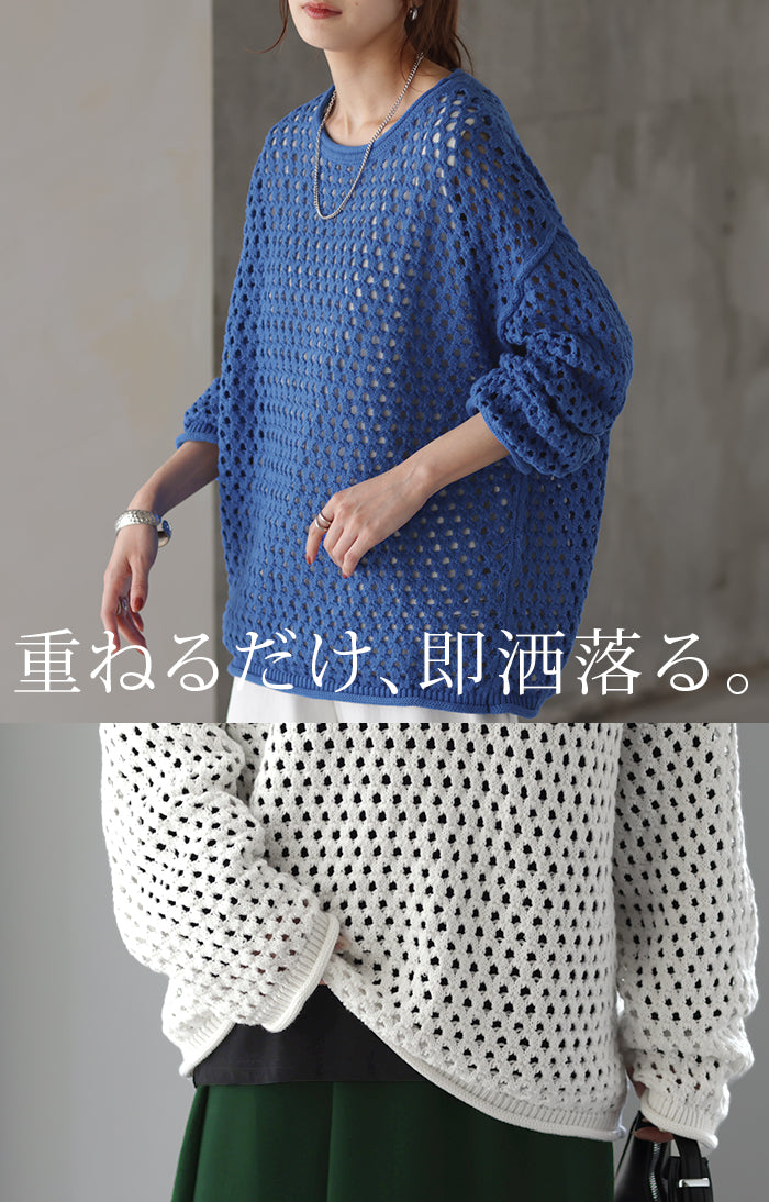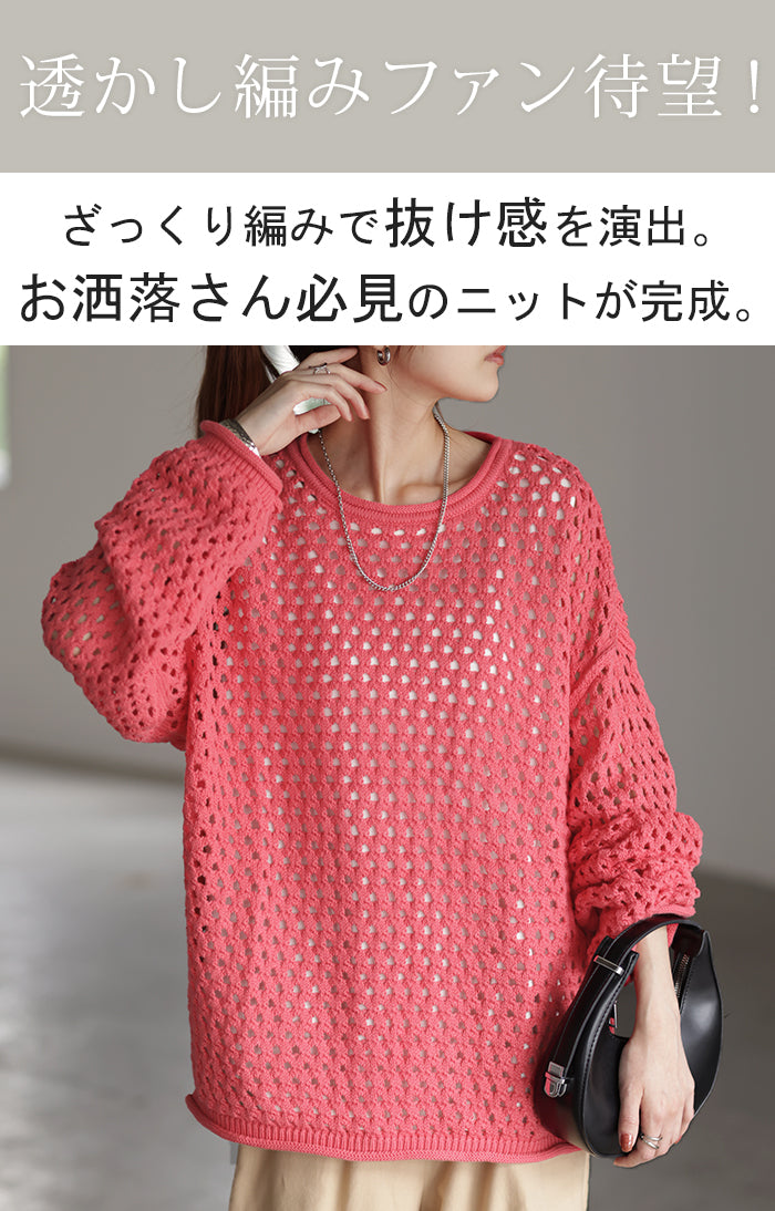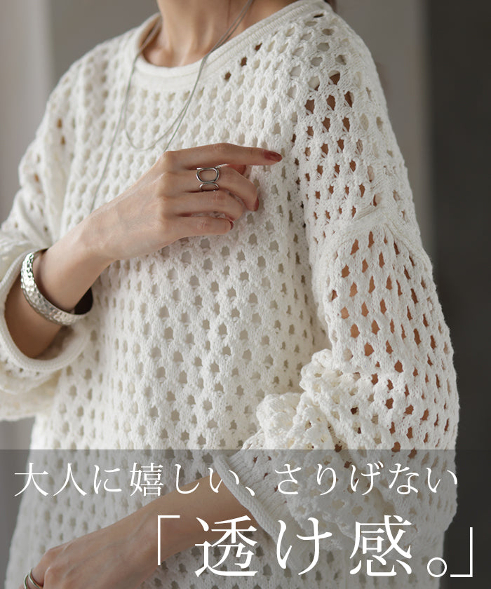 ざっくりと編まれた透かし編みがこなれ感あるニットトップスです。綿100%で柔らかな肌ざわりとふんわりナチュラルな風合いが◎。合わせるインナーによって表情がかわるレイヤードを楽しめる1枚です。※ニットの特性上、実際の製品の寸法とサイズ表記に差が生じることがございます。予めご了承下さいませ。