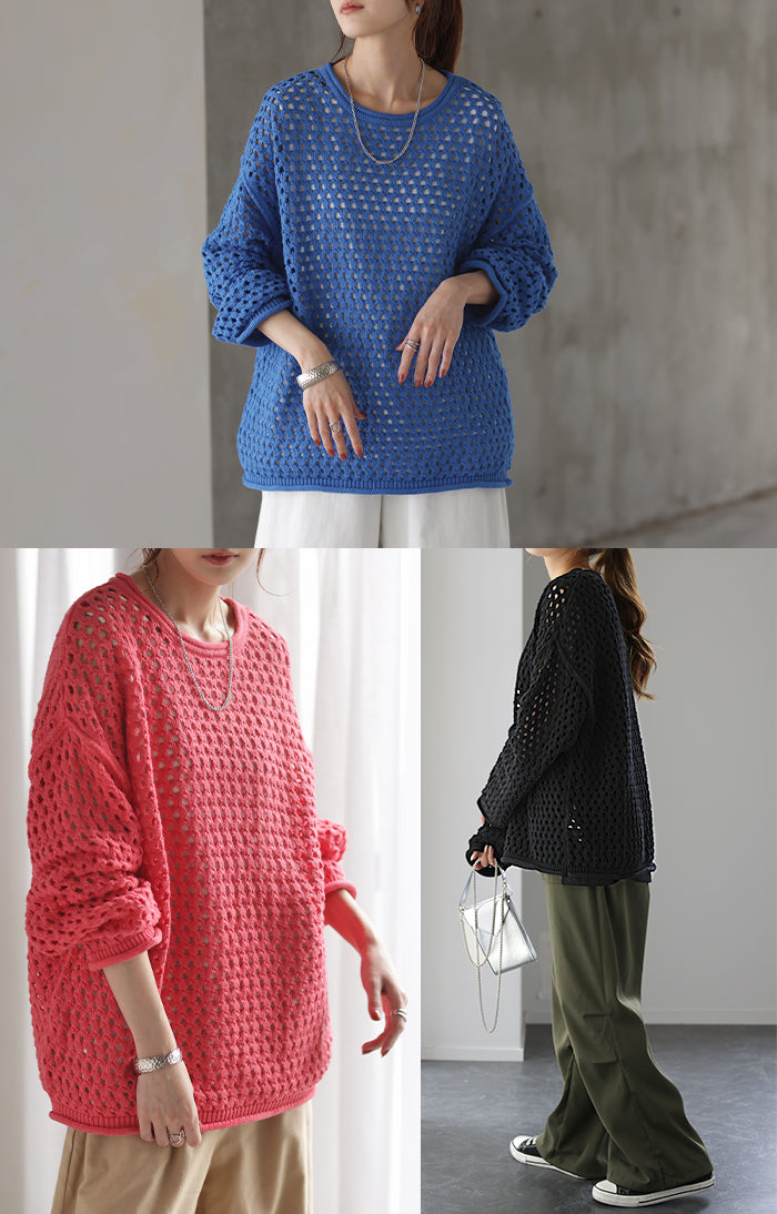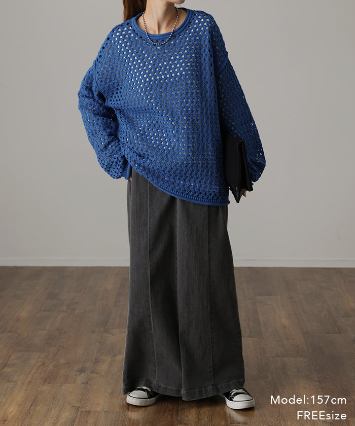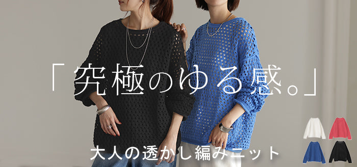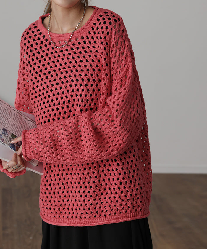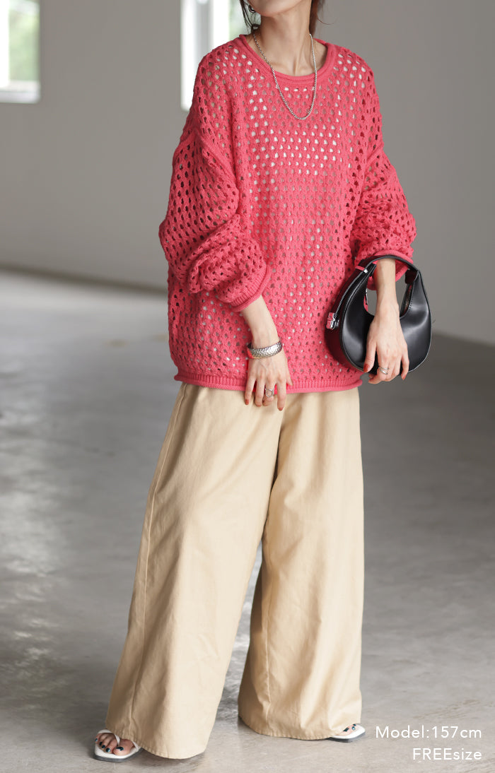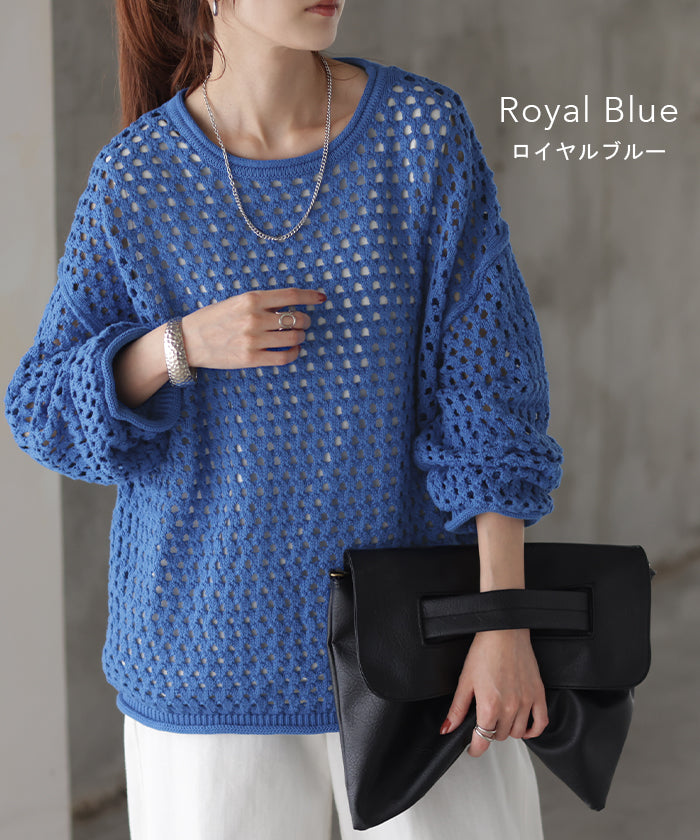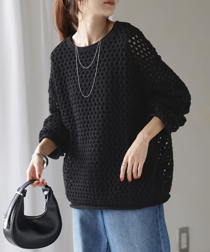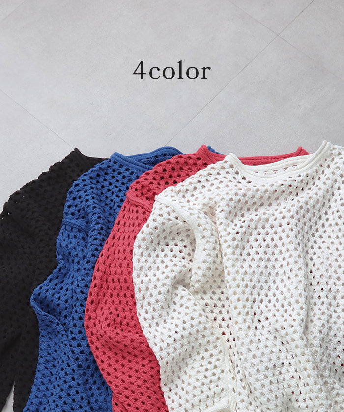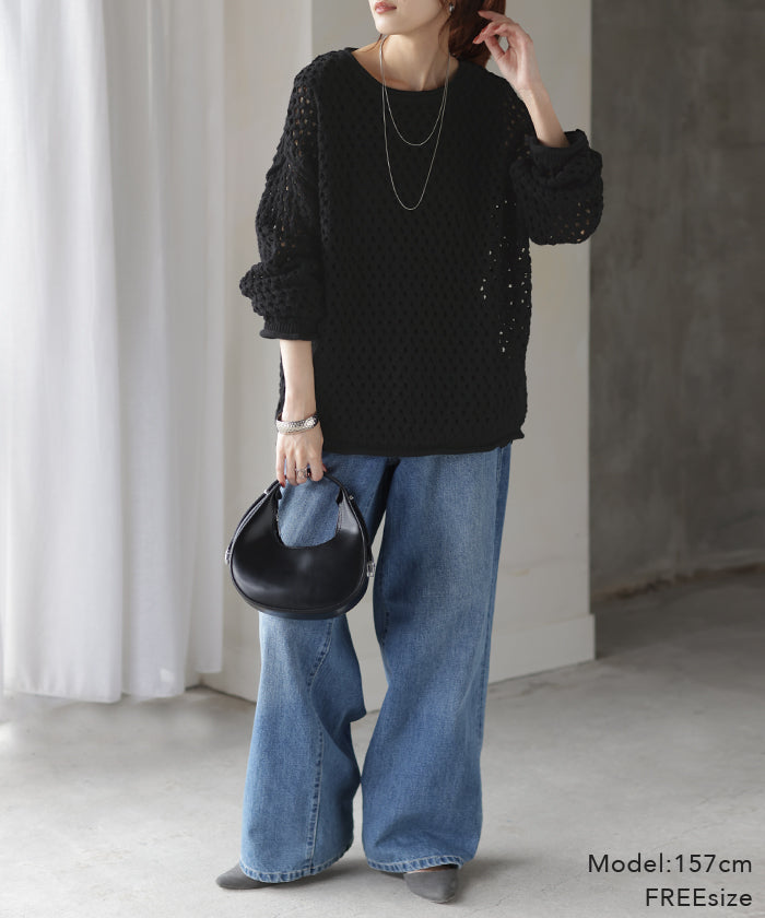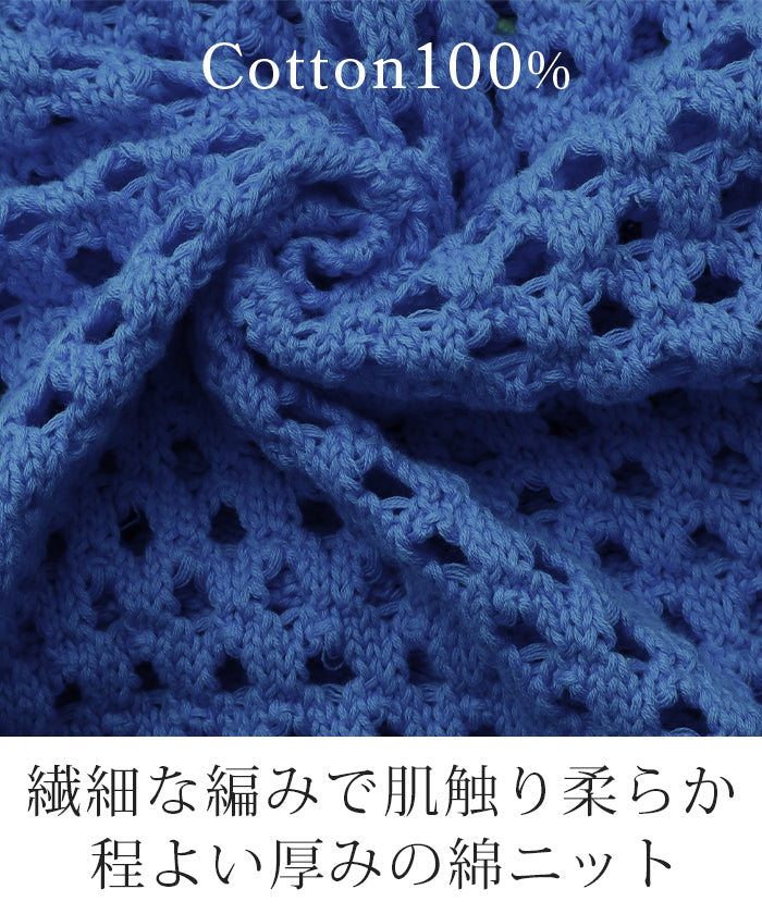 ざっくりと編まれた透かし編みがこなれ感あるニットトップスです。綿100%で柔らかな肌ざわりとふんわりナチュラルな風合いが◎。合わせるインナーによって表情がかわるレイヤードを楽しめる1枚です。※ニットの特性上、実際の製品の寸法とサイズ表記に差が生じることがございます。予めご了承下さいませ。