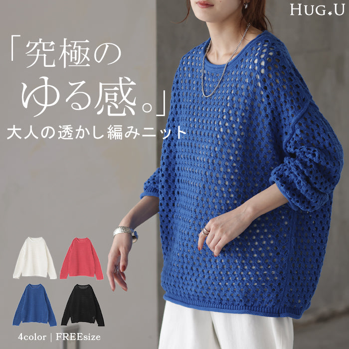 透かし編み 。ちくちくしない 綿。「 ざっくり 」 ニット プルオーバー ボーダー レディース セーター ぽわん袖 重ね 体型カバー トップス ゆる 長袖 二の腕カバー メッシュ レイヤード ロング Uネック ゆったり 大きいサイズ 青 ブラック 春 夏 HUG.U
