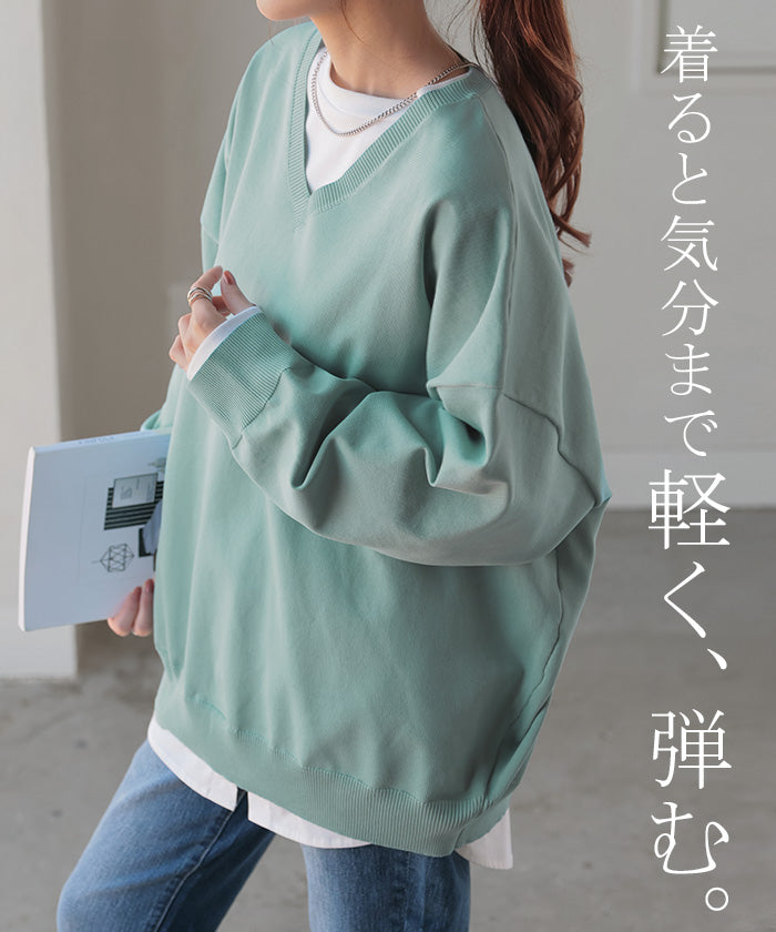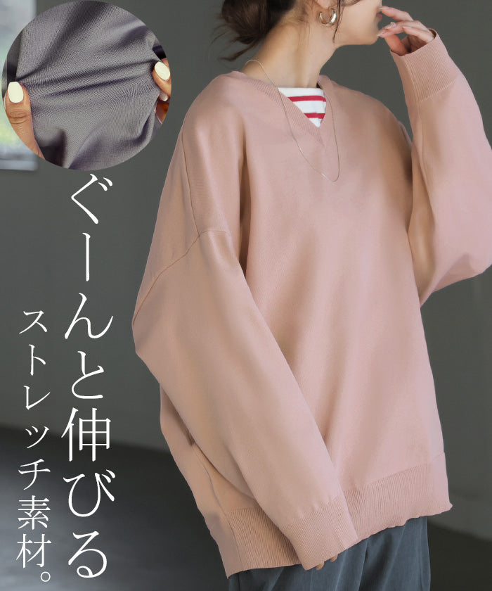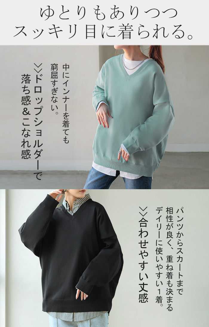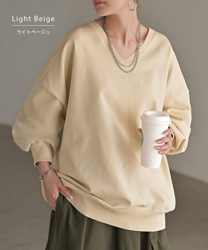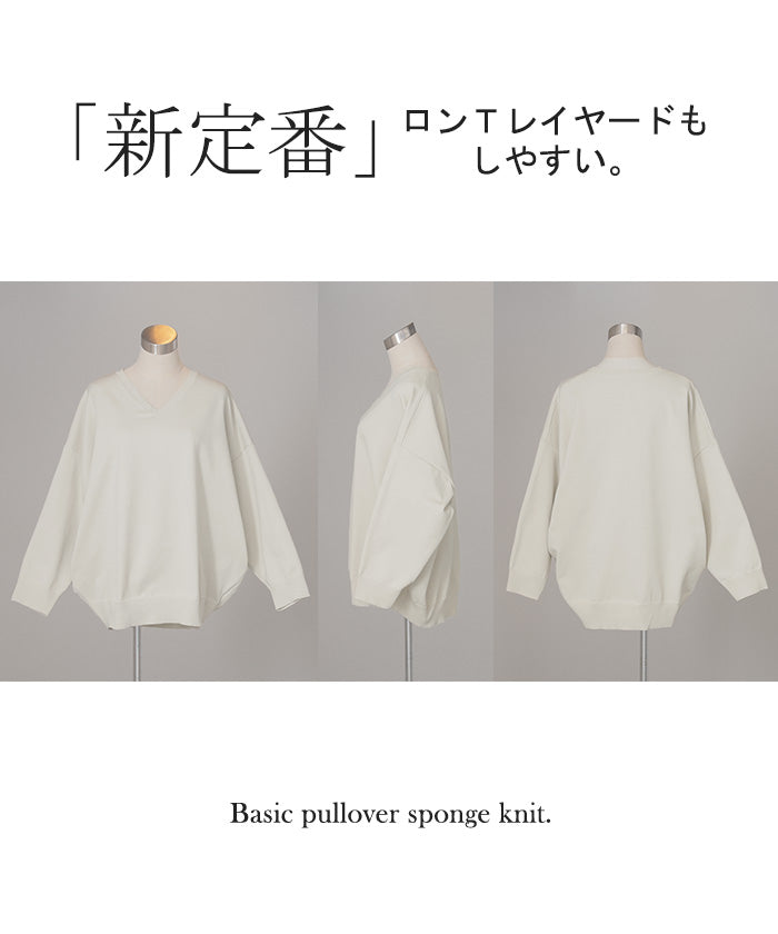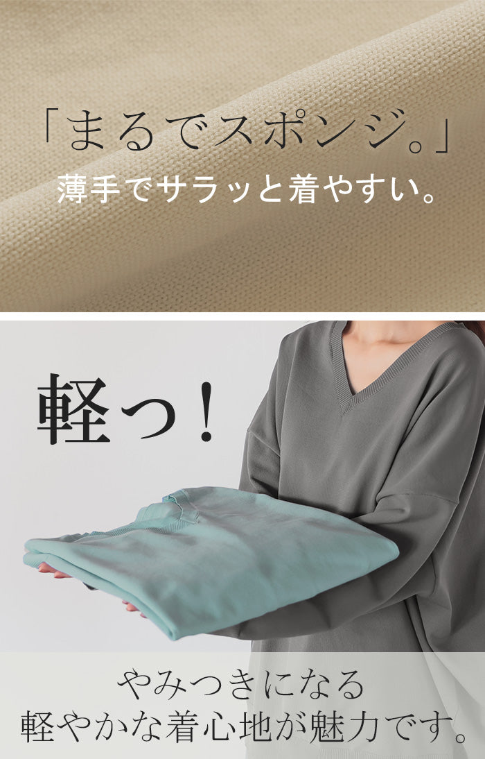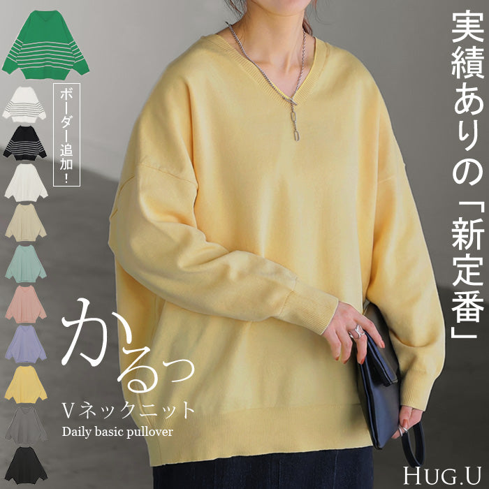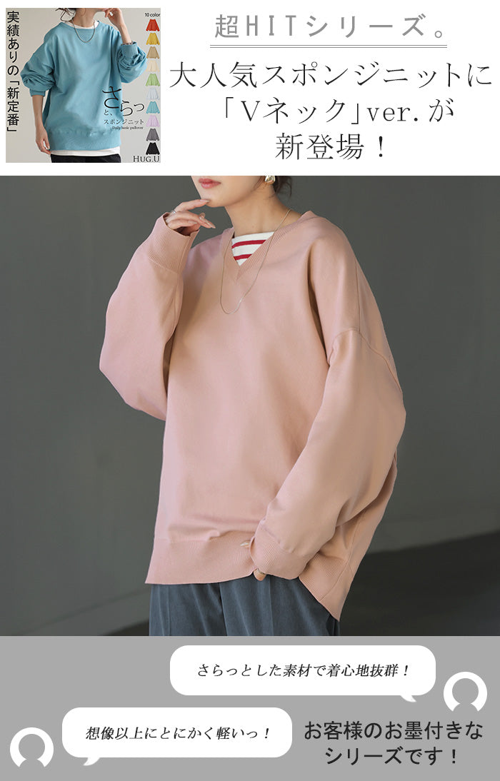 ニット チクチクしない スポンジニット ■一部1月中旬入荷 レディース トップス セーター トレーナー オーバー プルオーバー ロング 長袖 長い ボリュームスリーブ Vネック リブ ゆったり 体型カバー お尻が隠れる 軽量 カジュアル 青 黒 春 夏 HUG.U