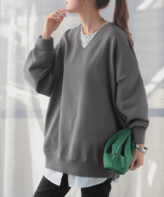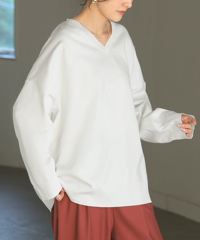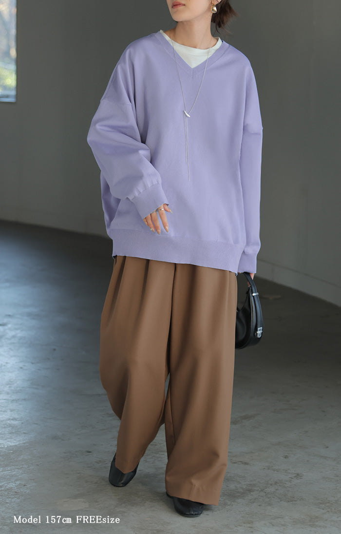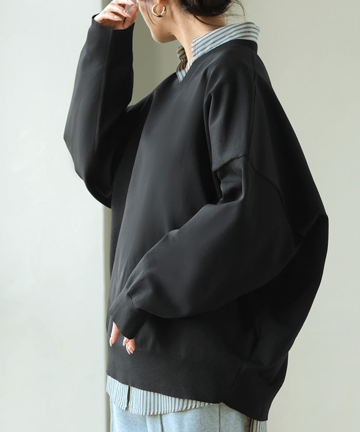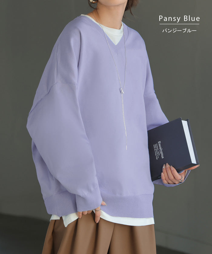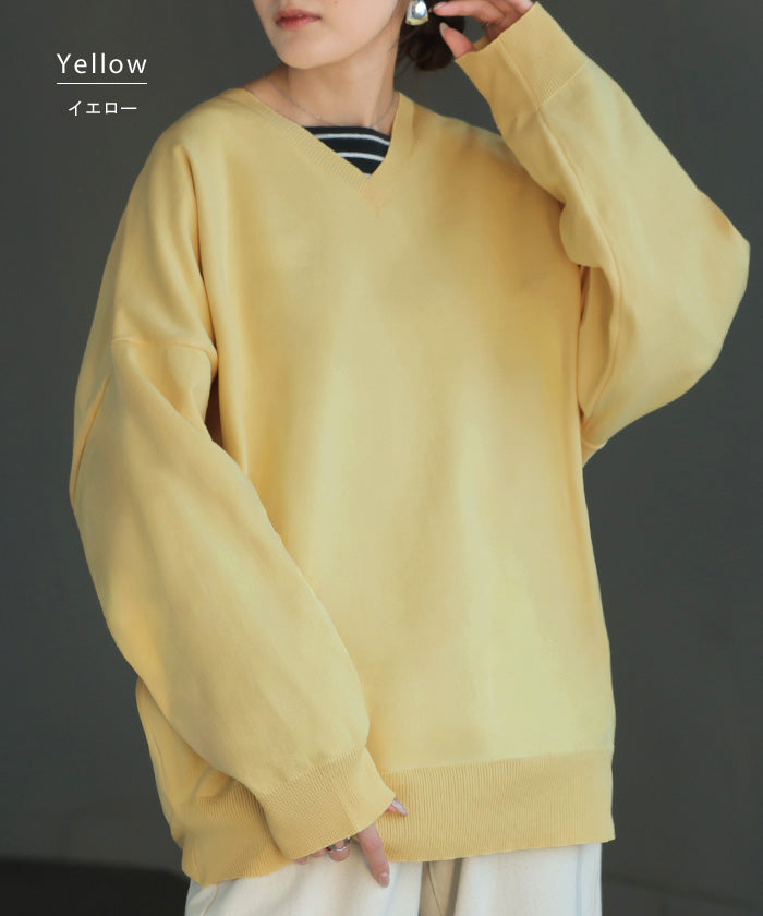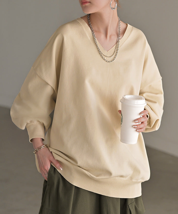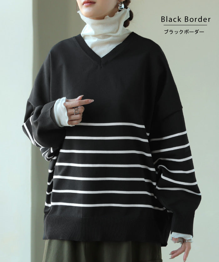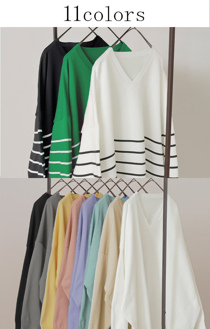 ニット チクチクしない スポンジニット ■一部1月中旬入荷 レディース トップス セーター トレーナー オーバー プルオーバー ロング 長袖 長い ボリュームスリーブ Vネック リブ ゆったり 体型カバー お尻が隠れる 軽量 カジュアル 青 黒 春 夏 HUG.U