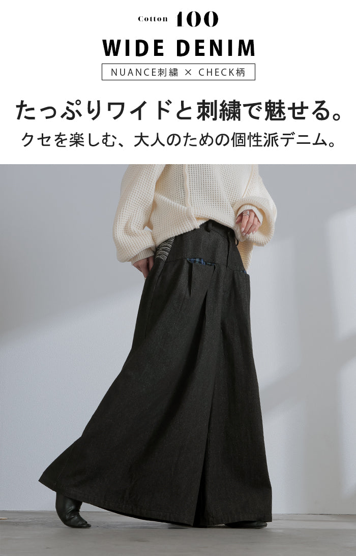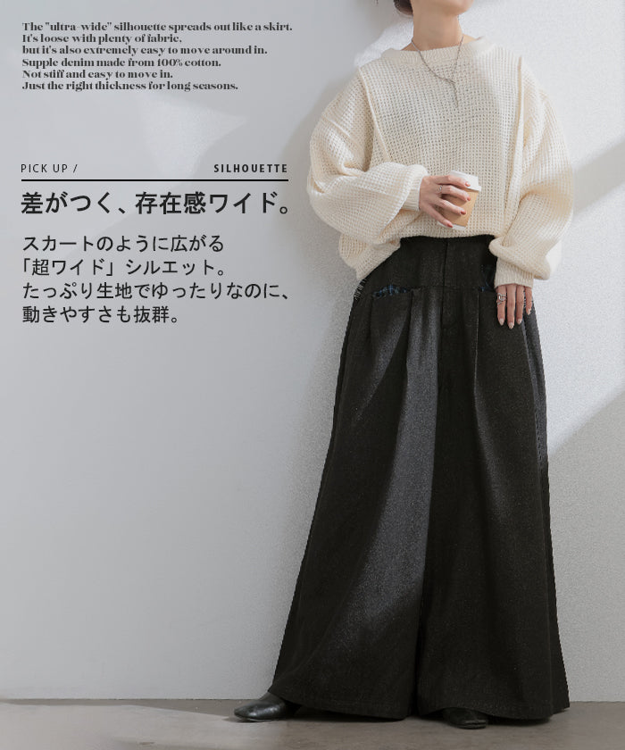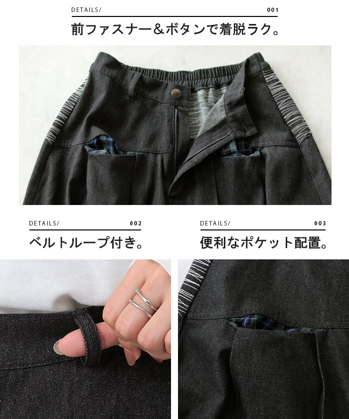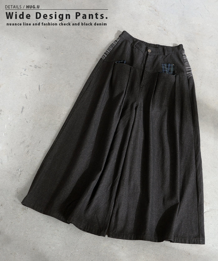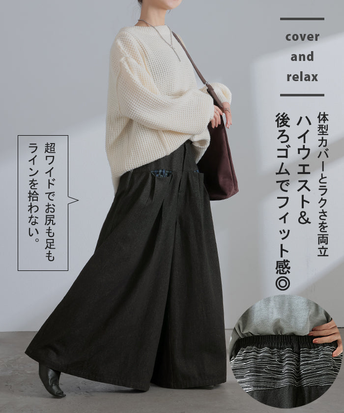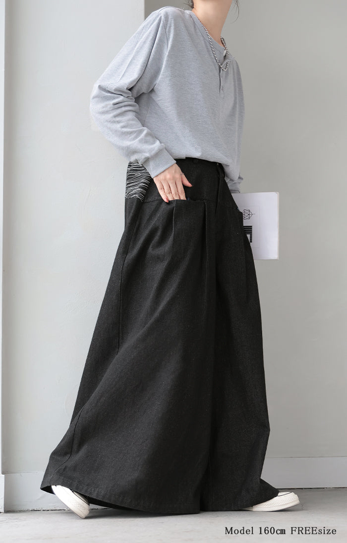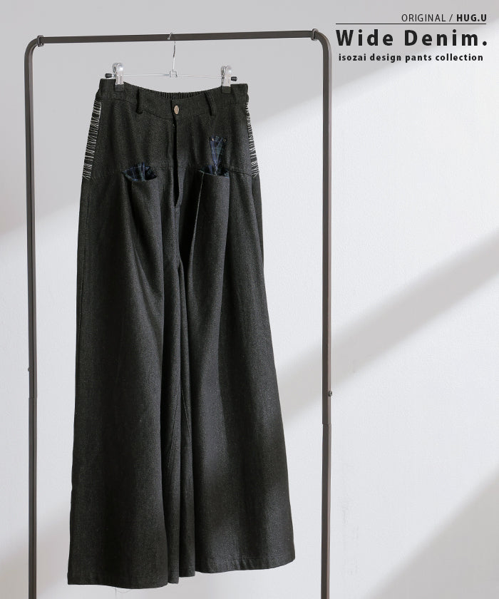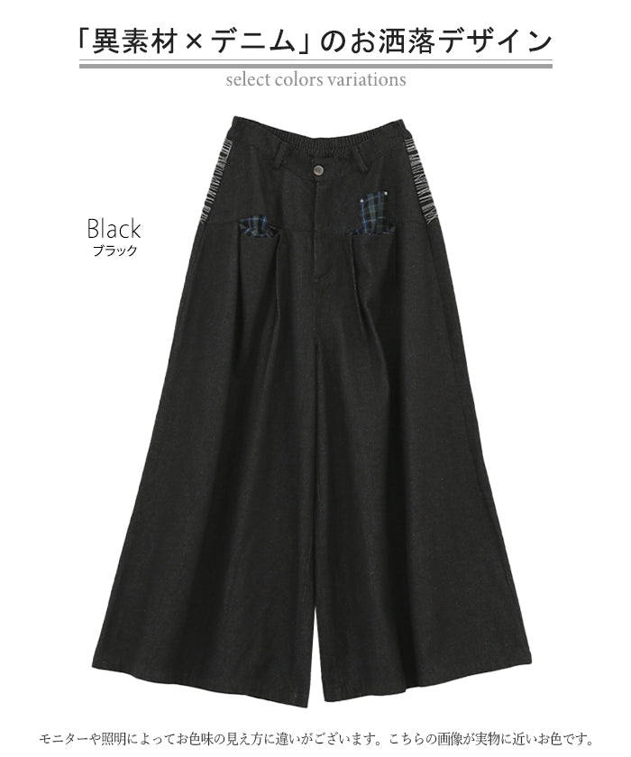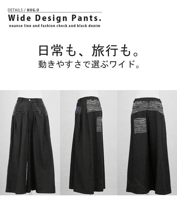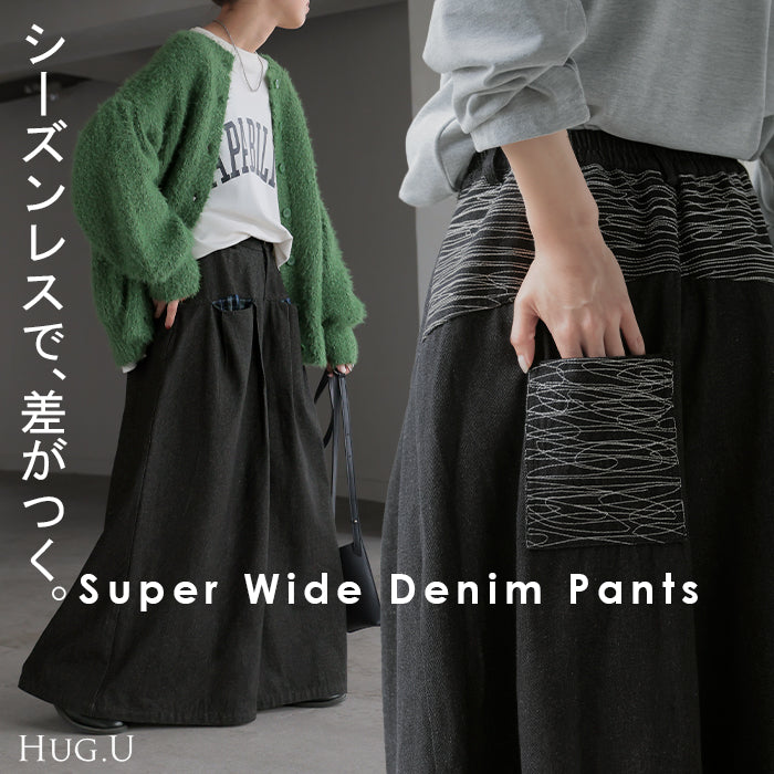 デニム パンツ 異素材 ワイド デニムパンツ レディース 綿100% ワイドパンツ ジーンズ ジーパン 体型カバー ボトムス ボトム ストレート ズボン ゆったり ハイウエスト 伸びる ゴム 美脚 大きいサイズ カジュアル ブラック 黒 春 夏 HUG.U