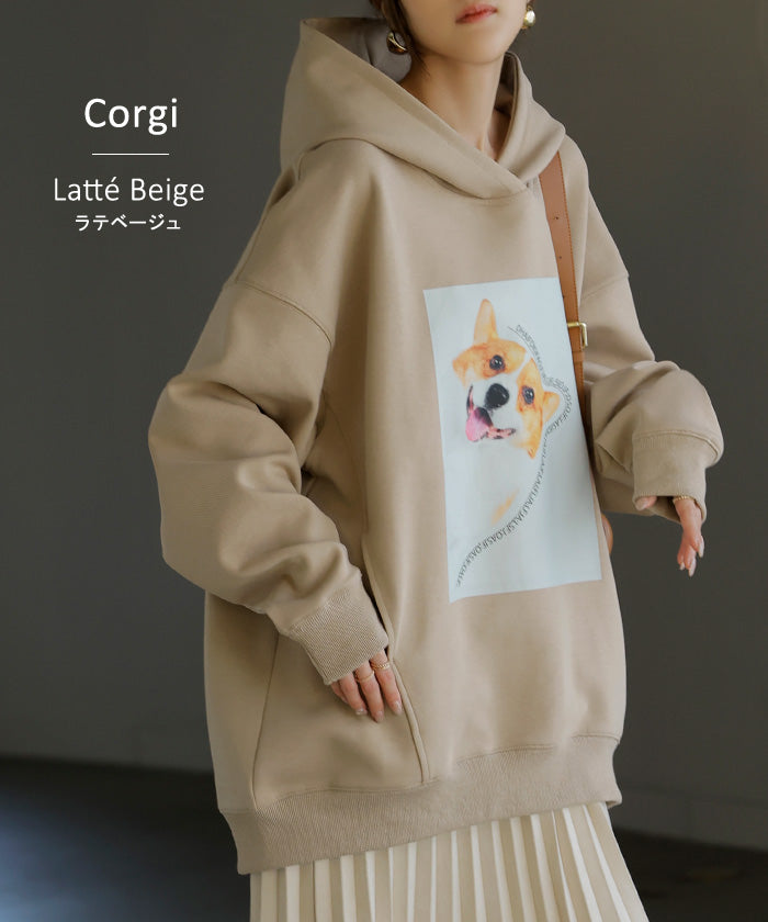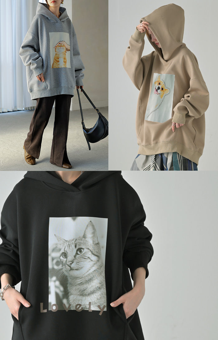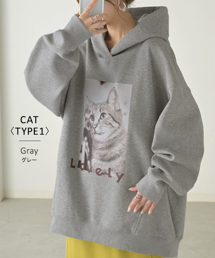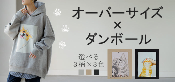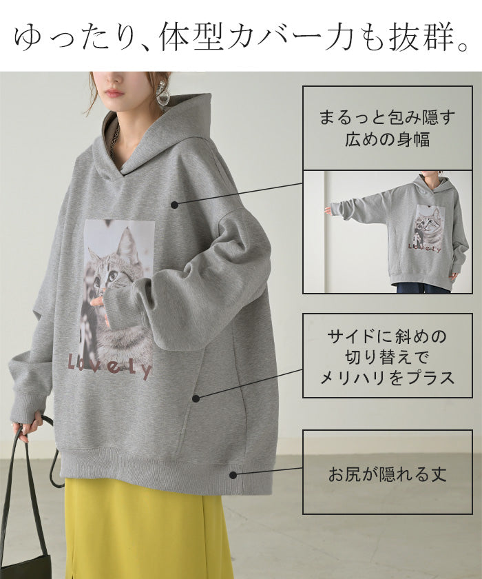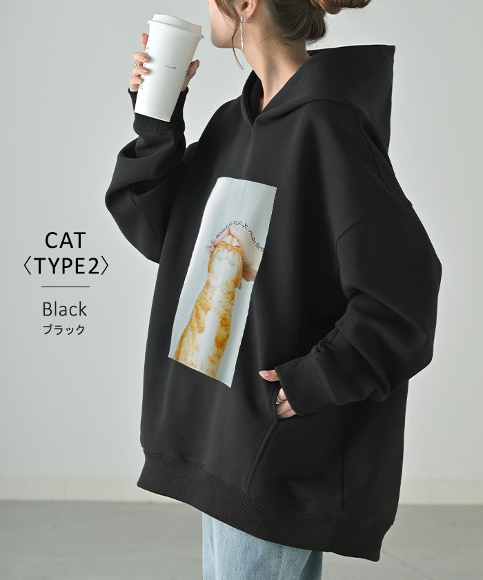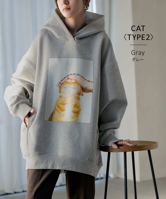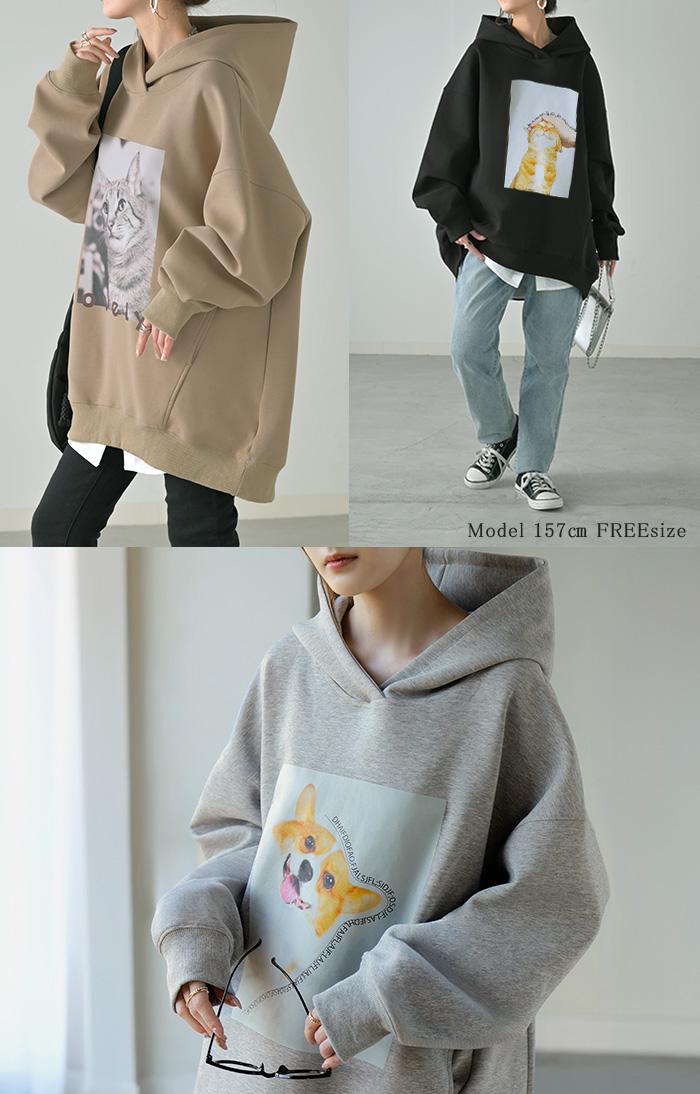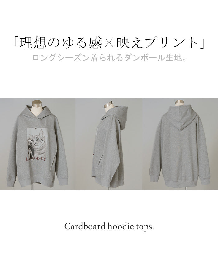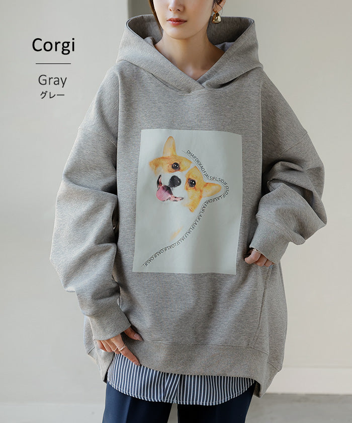 パーカー 猫 ダンボール レディース トップス ■一部1月中旬入荷 トレーナー プリント シワになりにくい ロング ロングパーカー プルオーバー フード ビッグ お尻が隠れる ゆったり オーバーサイズ 体型カバー 大きいサイズ 猫柄 猫グッズ コーギー ネコ 犬 イヌ グレー 黒 秋 冬 HUG.U
