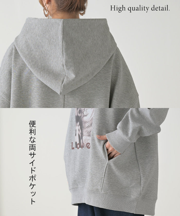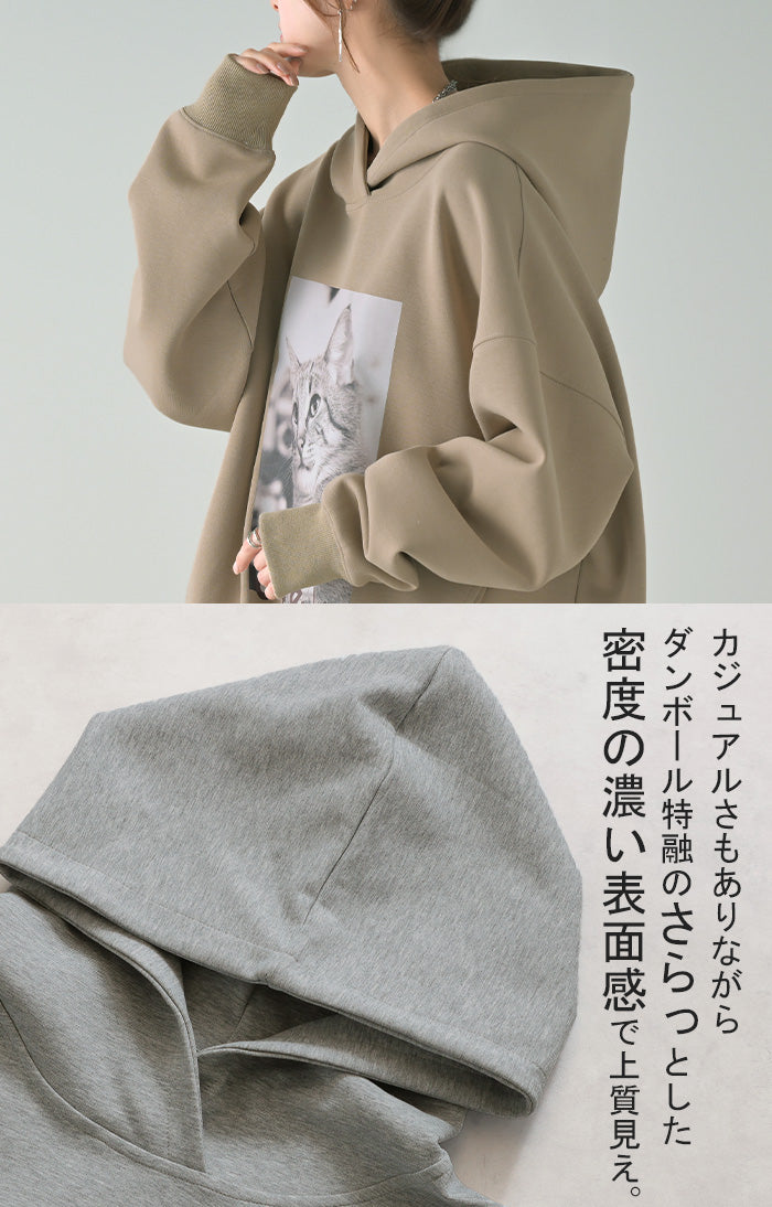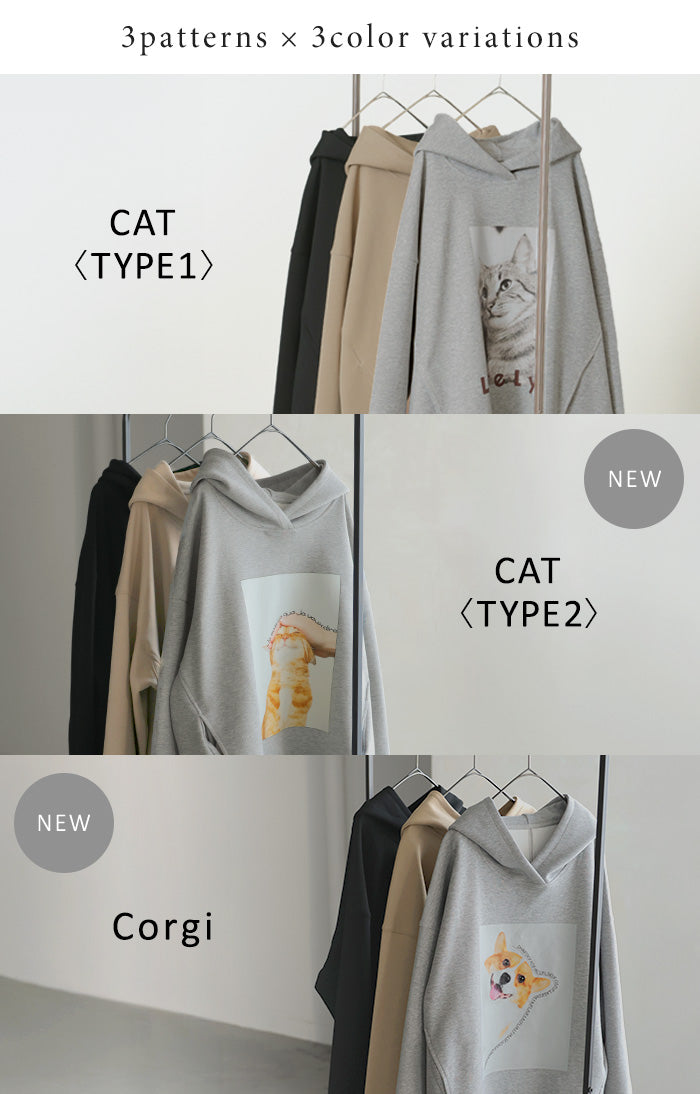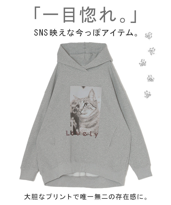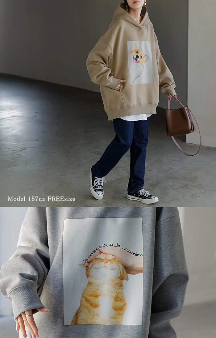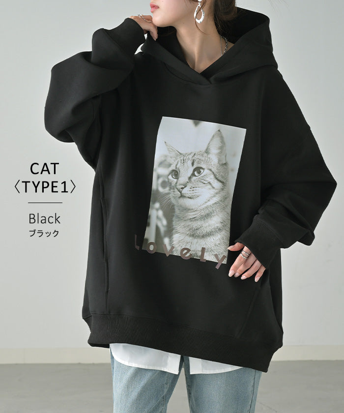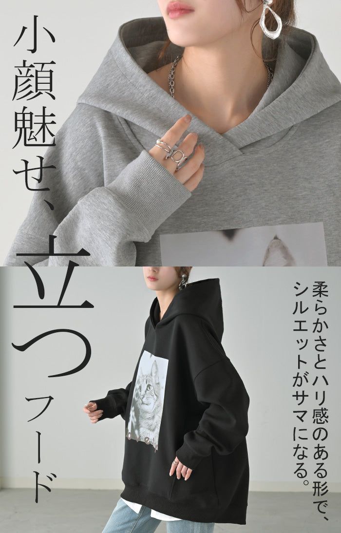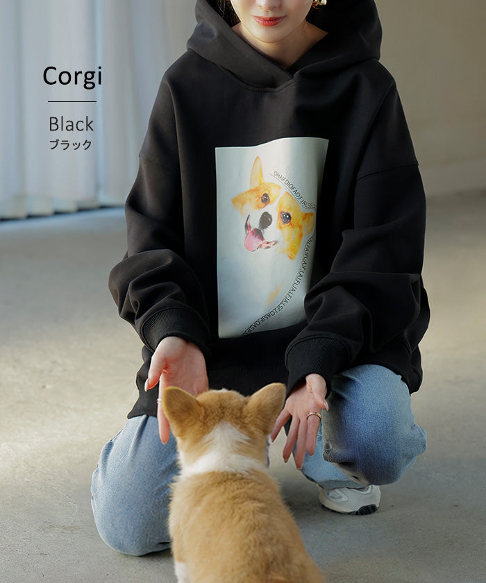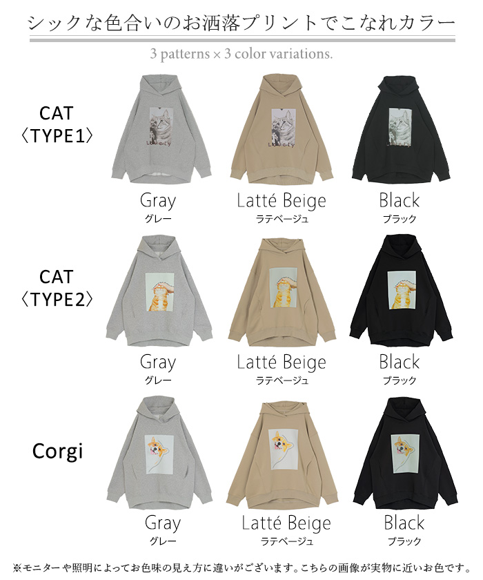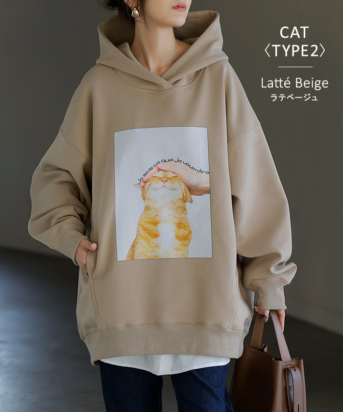 パーカー 猫 ダンボール レディース トップス ■一部1月中旬入荷 トレーナー プリント シワになりにくい ロング ロングパーカー プルオーバー フード ビッグ お尻が隠れる ゆったり オーバーサイズ 体型カバー 大きいサイズ 猫柄 猫グッズ コーギー ネコ 犬 イヌ グレー 黒 秋 冬 HUG.U