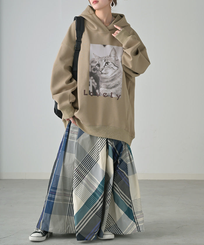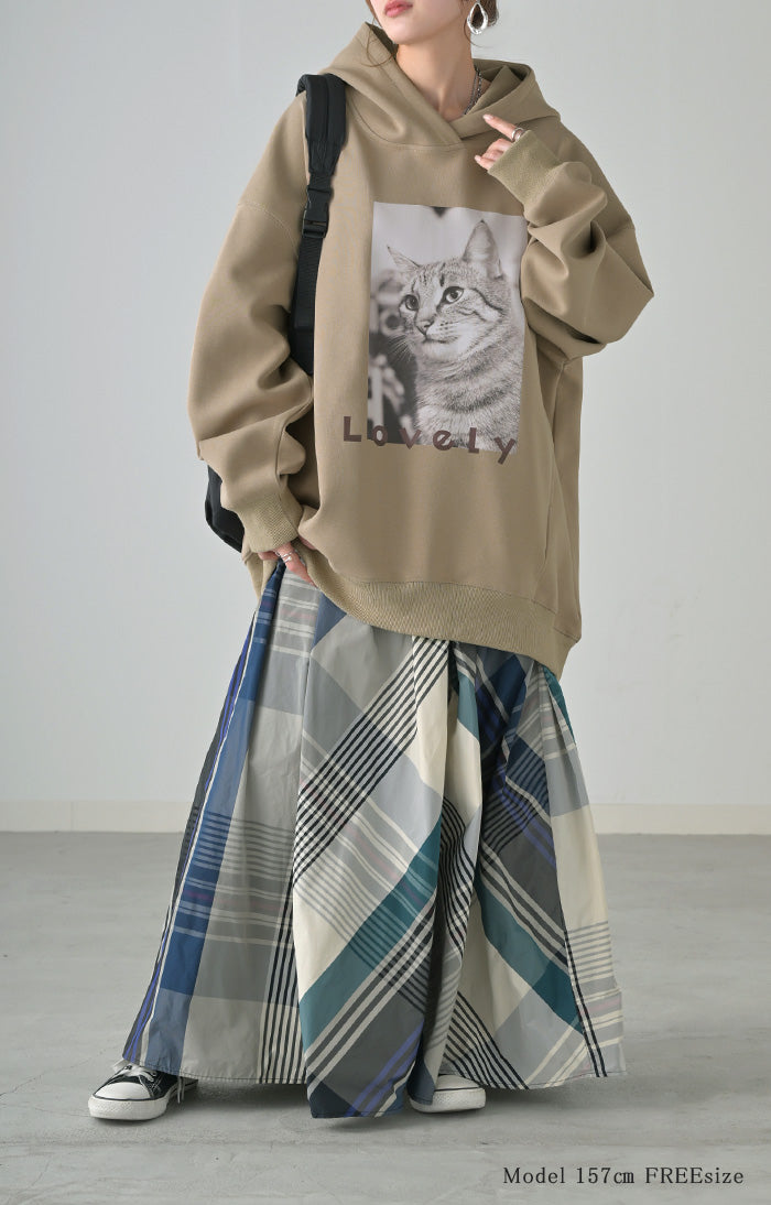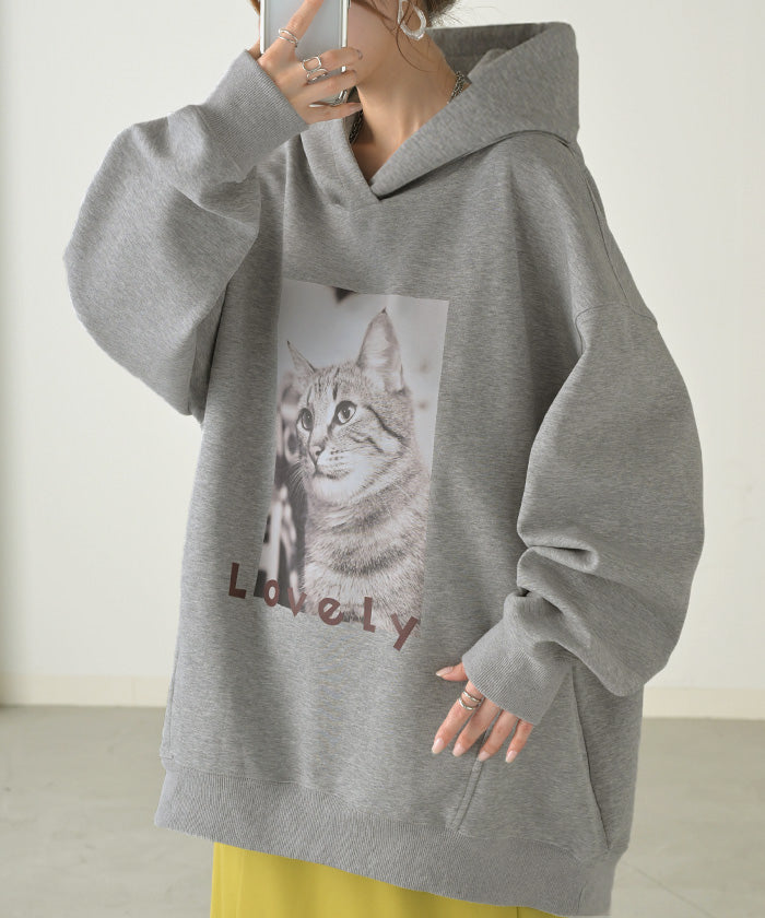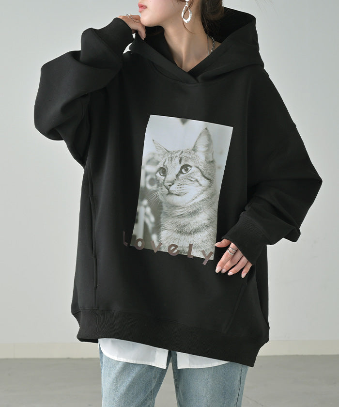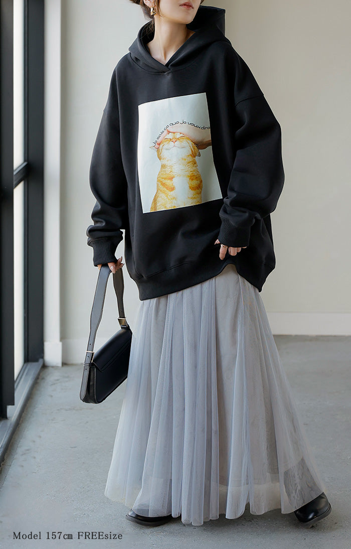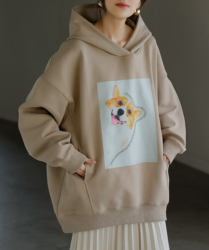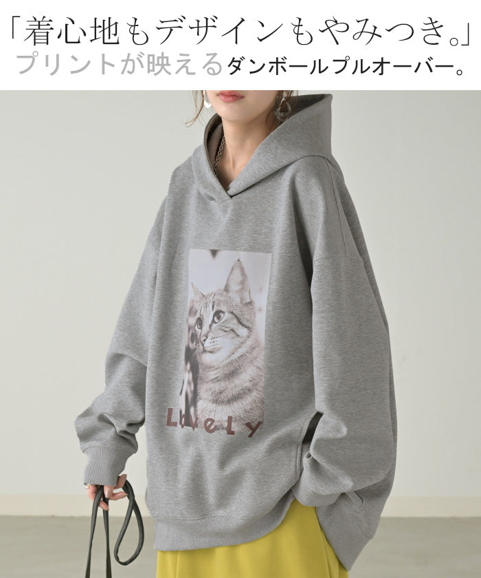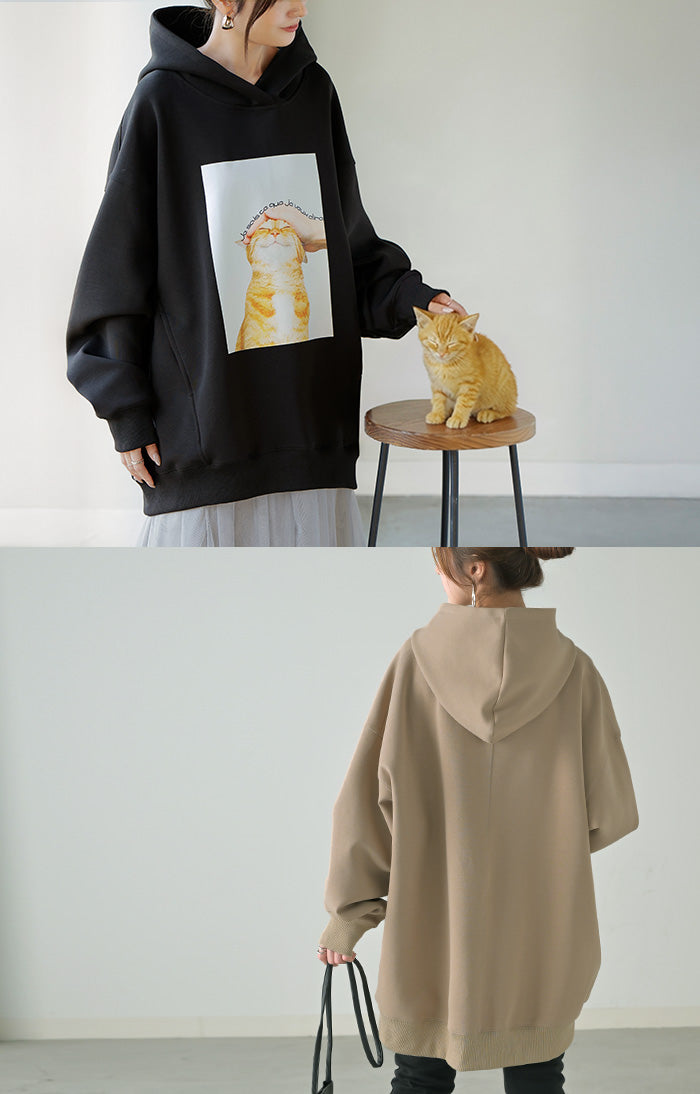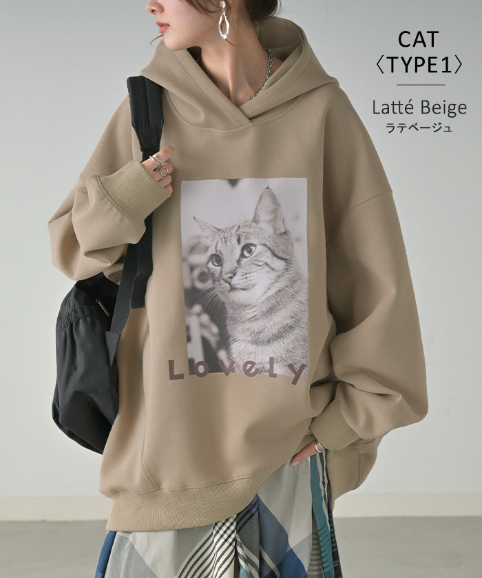 パーカー 猫 ダンボール レディース トップス ■一部1月中旬入荷 トレーナー プリント シワになりにくい ロング ロングパーカー プルオーバー フード ビッグ お尻が隠れる ゆったり オーバーサイズ 体型カバー 大きいサイズ 猫柄 猫グッズ コーギー ネコ 犬 イヌ グレー 黒 秋 冬 HUG.U