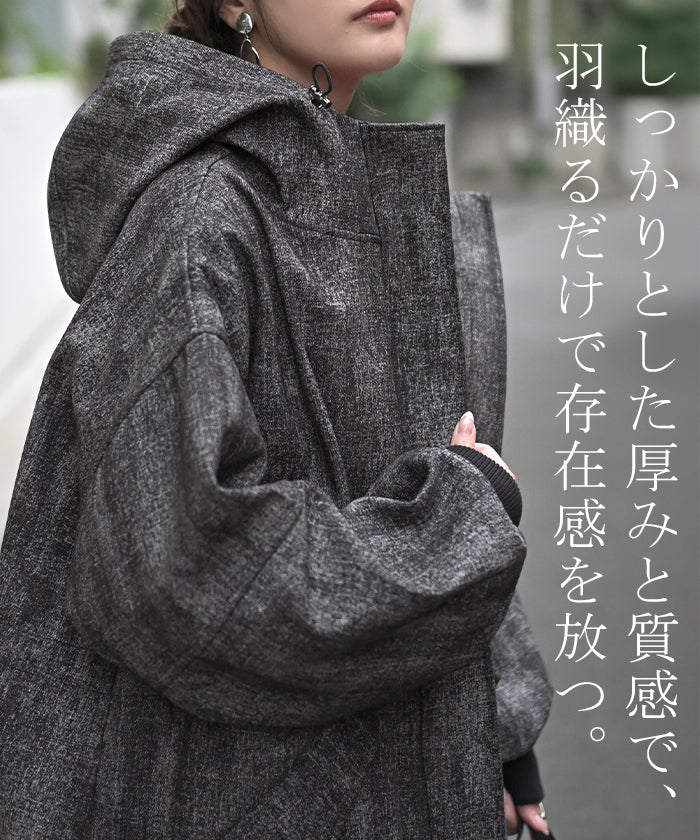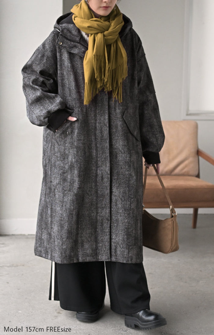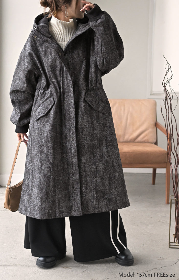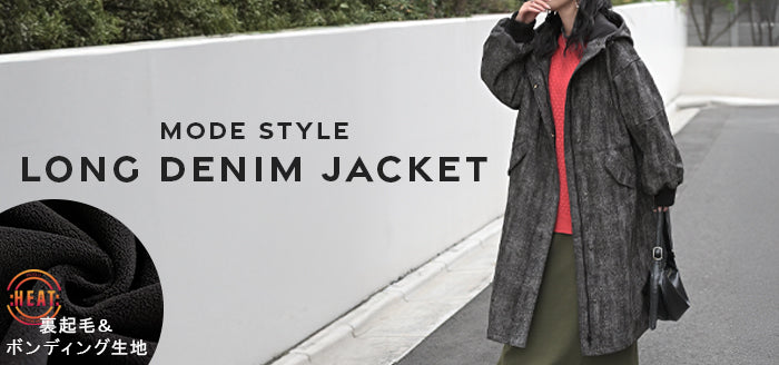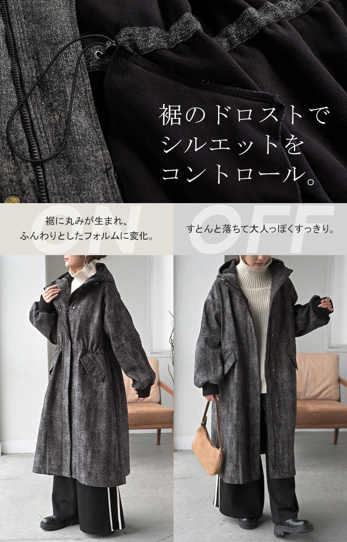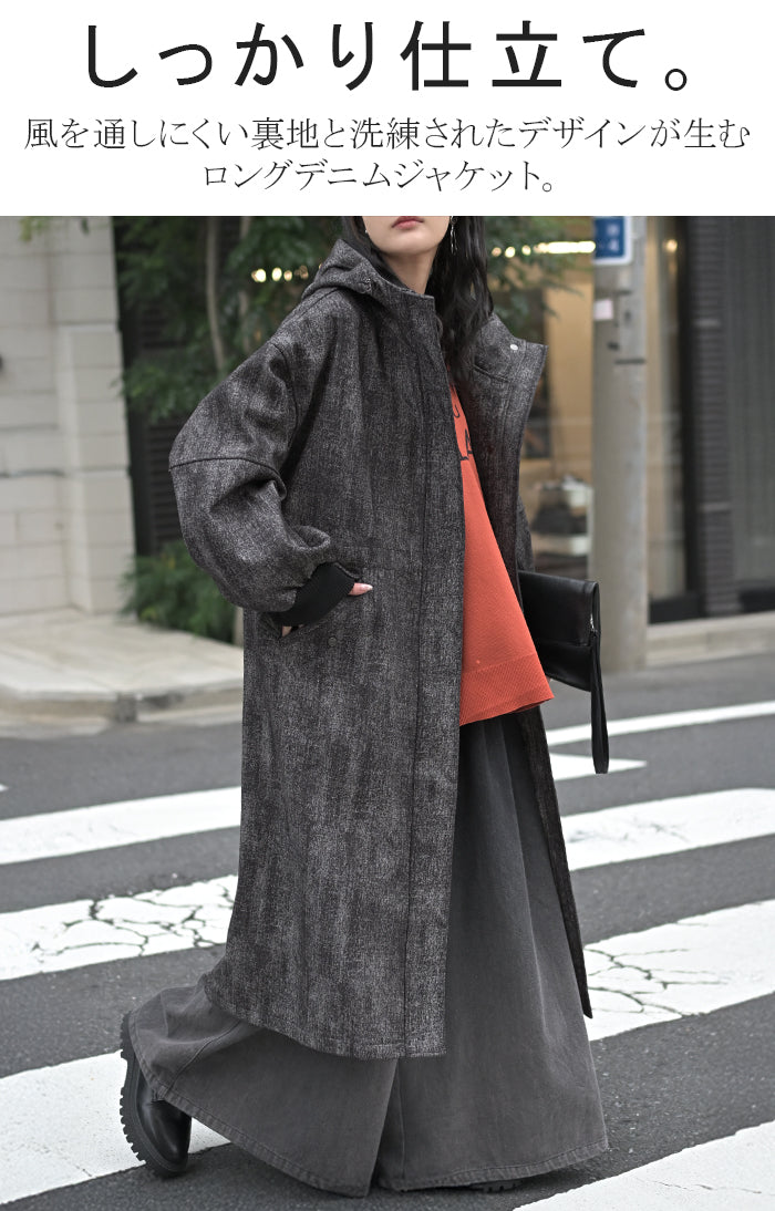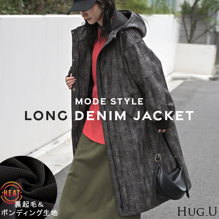 2025AW新作 アウター ロング パーカー ■12月中旬入荷 デニム 裏起毛 レディース ジャケット オーバー 長袖 羽織 チュニック ジーンズ フード ヴィンテージ 風 ドロスト リブ あったか 綿100 オーバーサイズ 大きいサイズ 体型カバー お尻が隠れる カジュアル 黒 ブラック 秋 冬 HUG.U