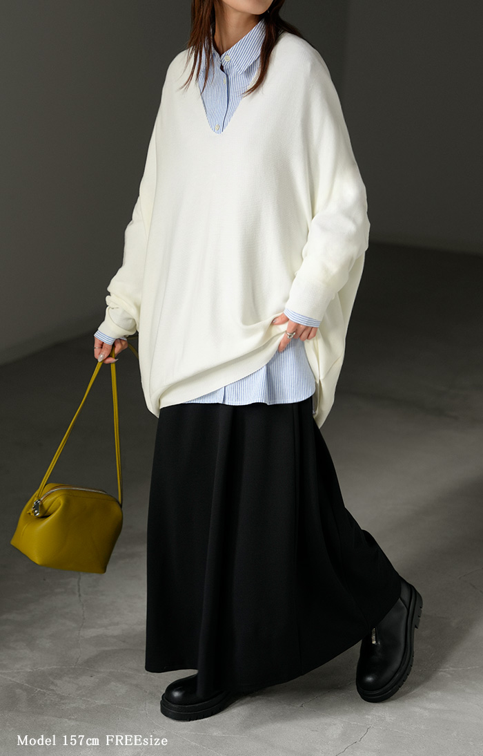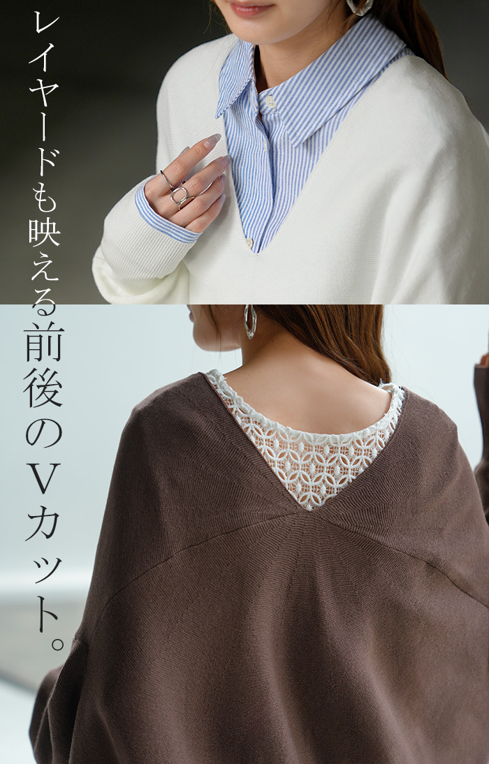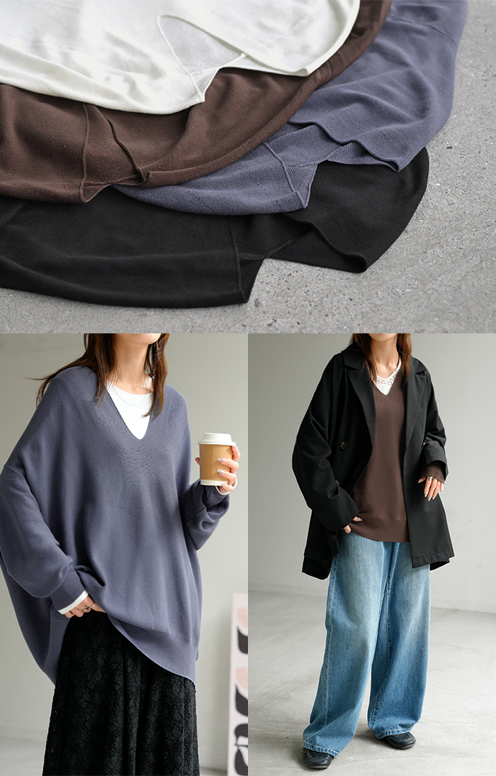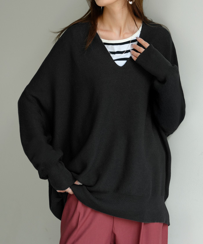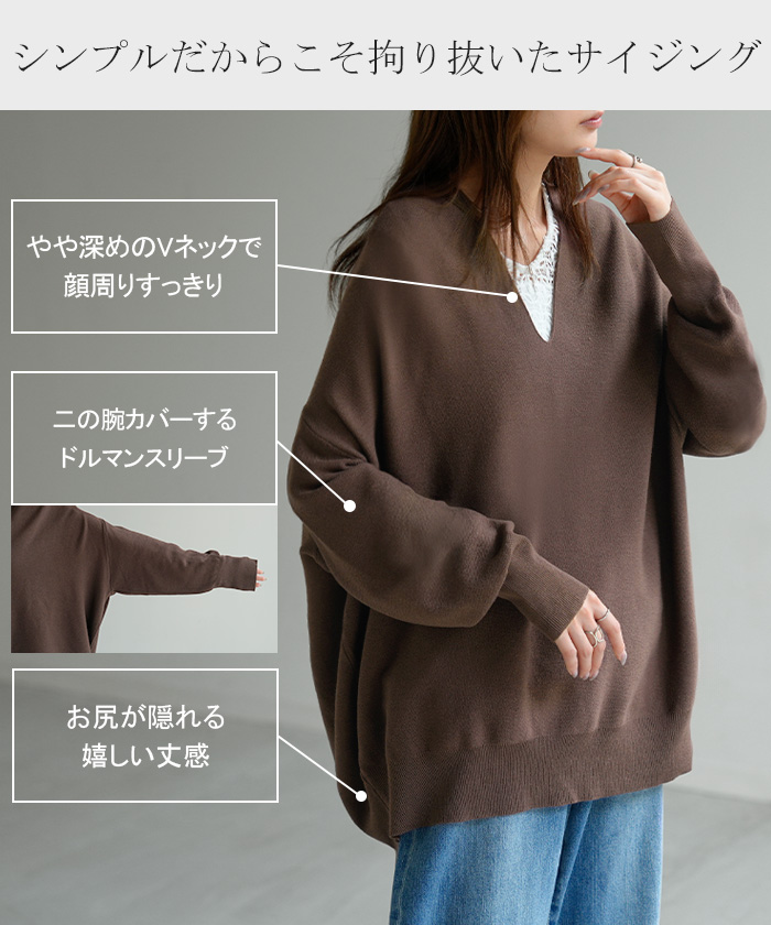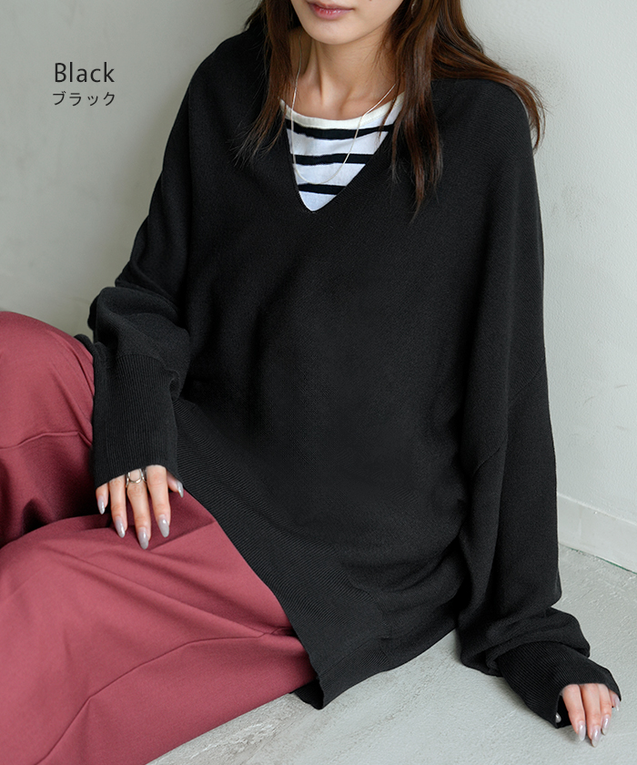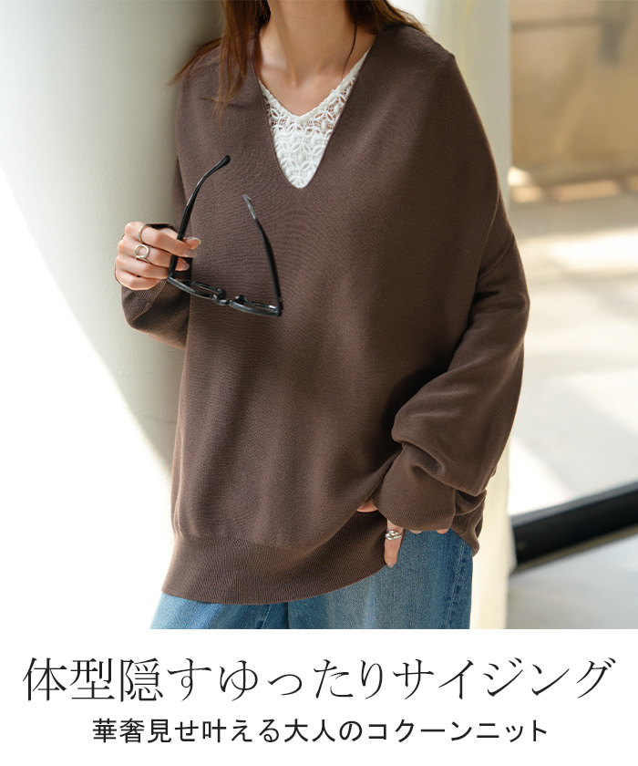 2025AW新作 ニット Vネック コクーン ■10月中旬入荷 レディース トップス ロング セーター オーバー プルオーバー 長袖 長い レイヤード リブ チュニック ドルマン チクチクしない ゆったり 薄い 柔らかい 体型カバー 大きいサイズ お尻が隠れる カジュアル 黒 白 秋 冬 HUG.U