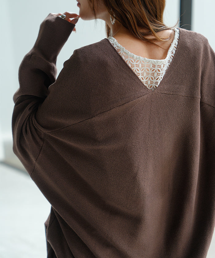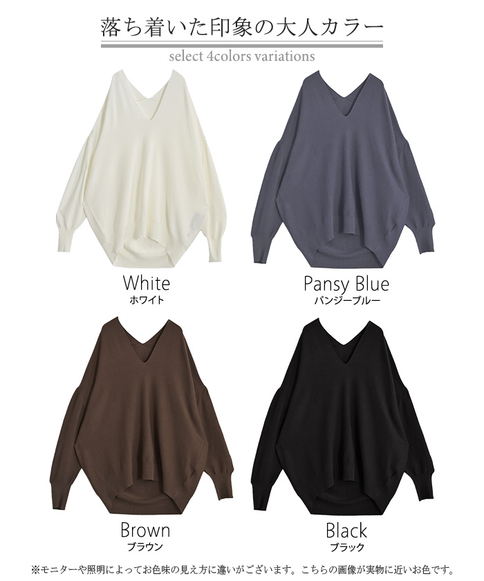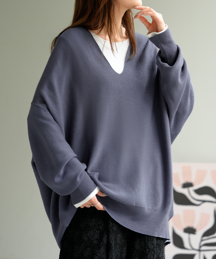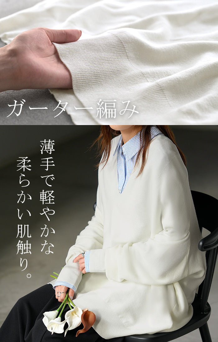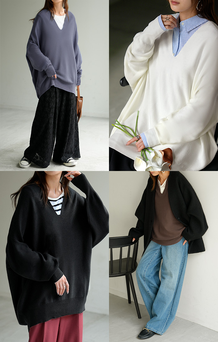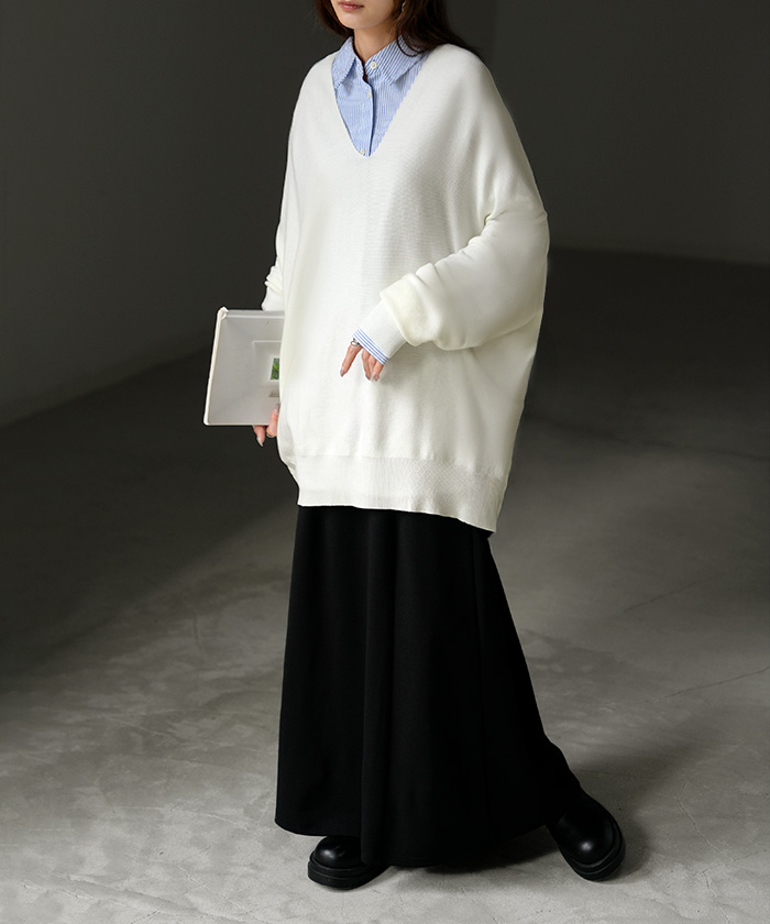 2025AW新作 ニット Vネック コクーン ■10月中旬入荷 レディース トップス ロング セーター オーバー プルオーバー 長袖 長い レイヤード リブ チュニック ドルマン チクチクしない ゆったり 薄い 柔らかい 体型カバー 大きいサイズ お尻が隠れる カジュアル 黒 白 秋 冬 HUG.U