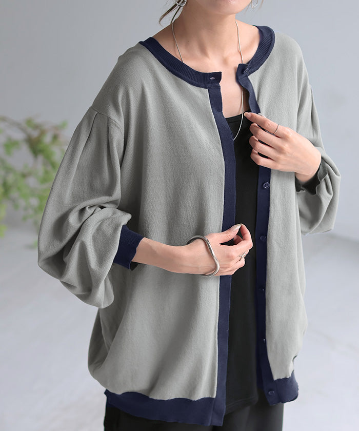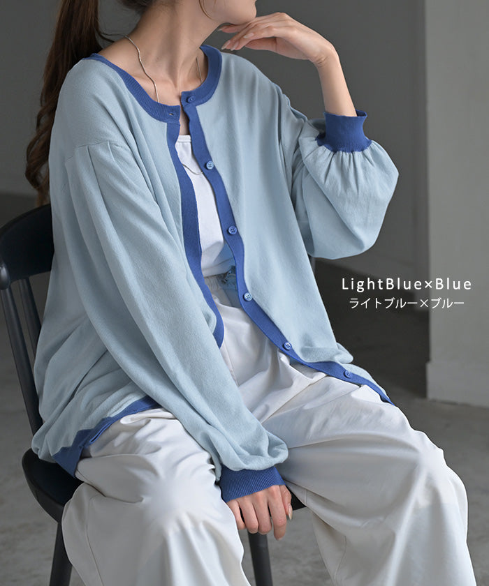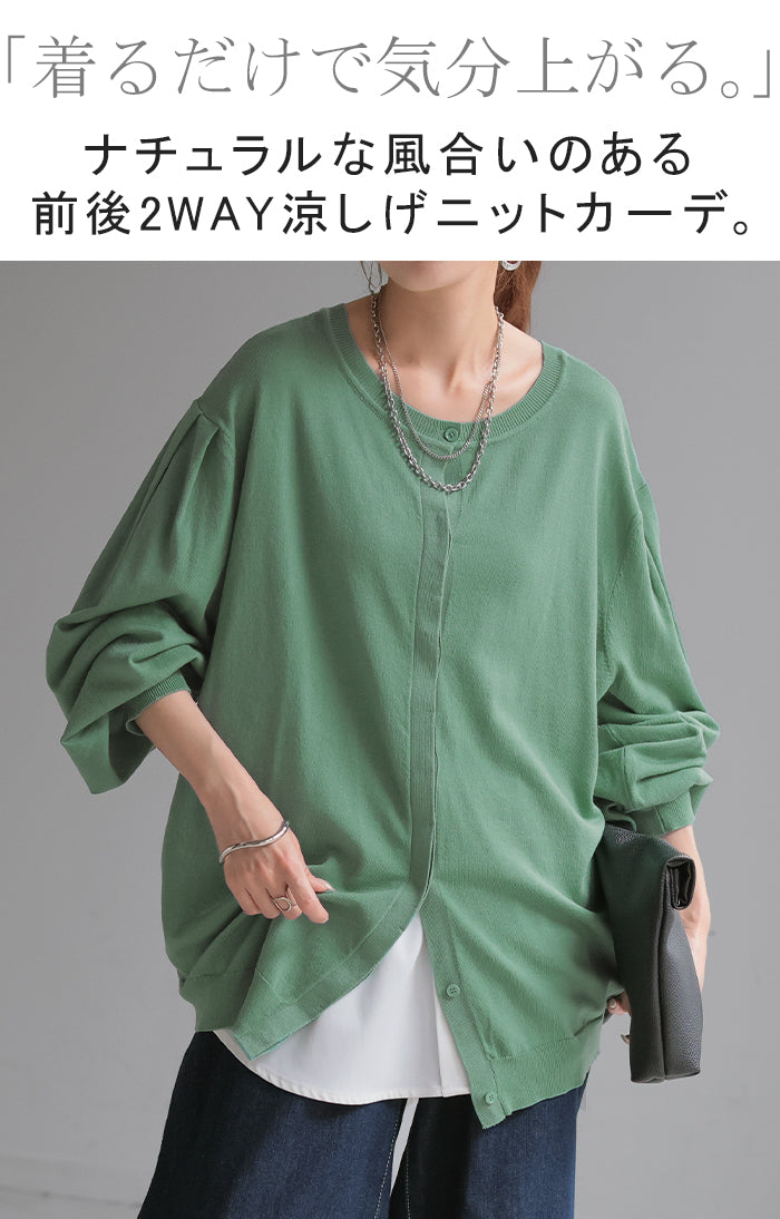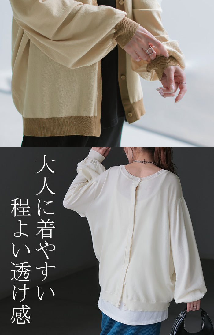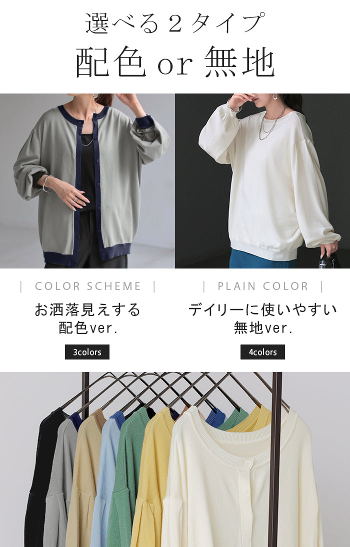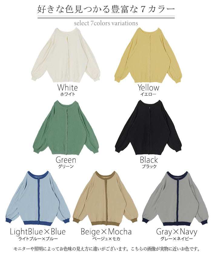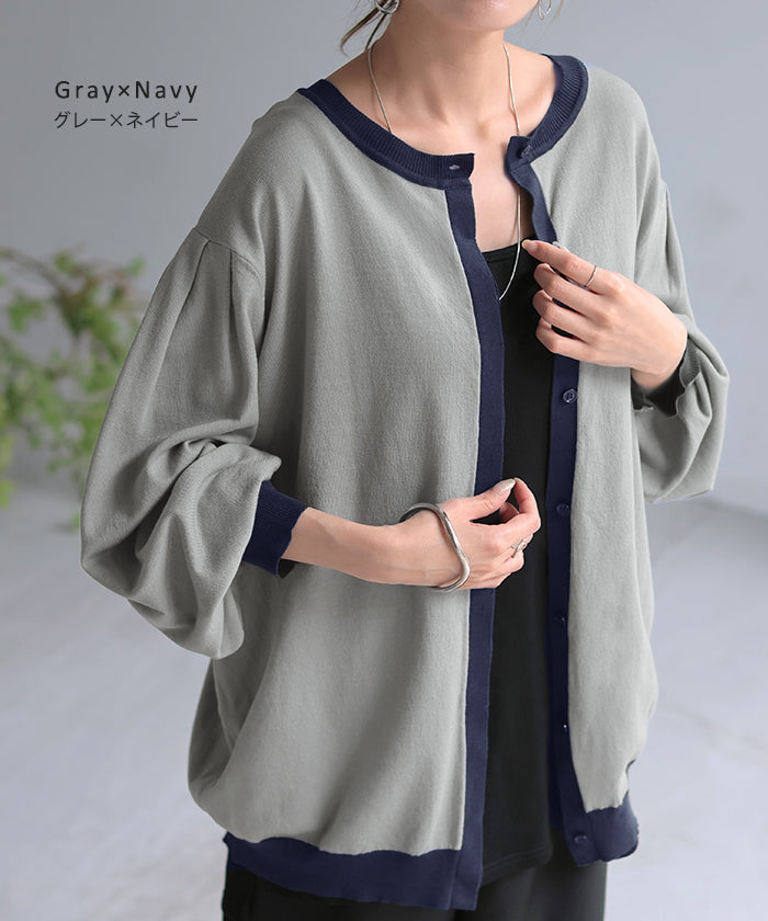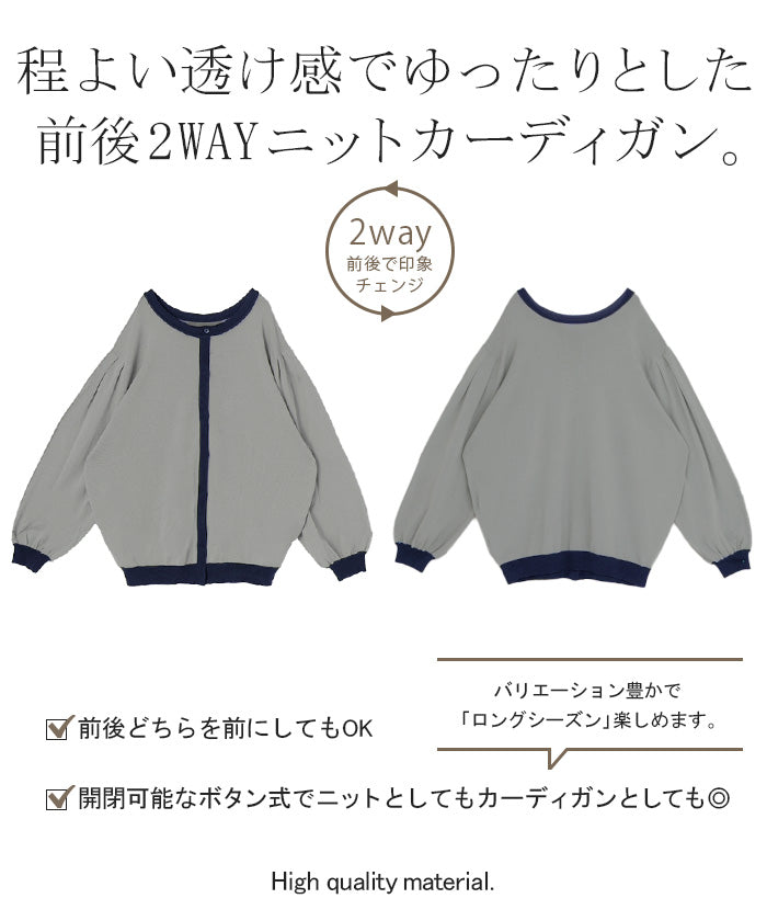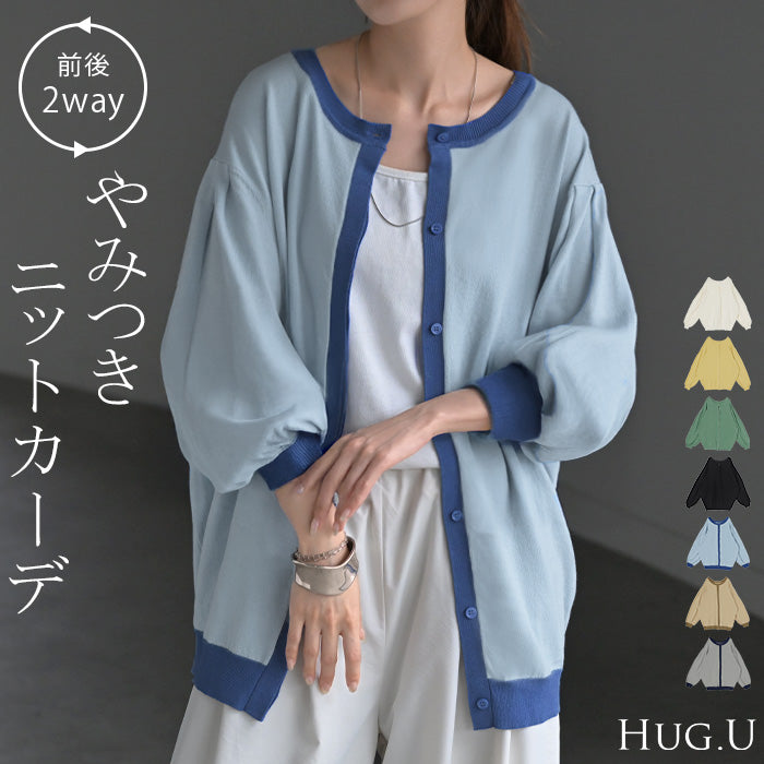 ニット カーディガン 前後2way レディース カーデ トップス セーター オーバー プルオーバー ニットカーディガン ロング 長袖 長い ボリュームスリーブ クルーネック リブ ゆったり 体型カバー 大きいサイズ お尻が隠れる 配色 無地 黒 春 夏 HUG.U