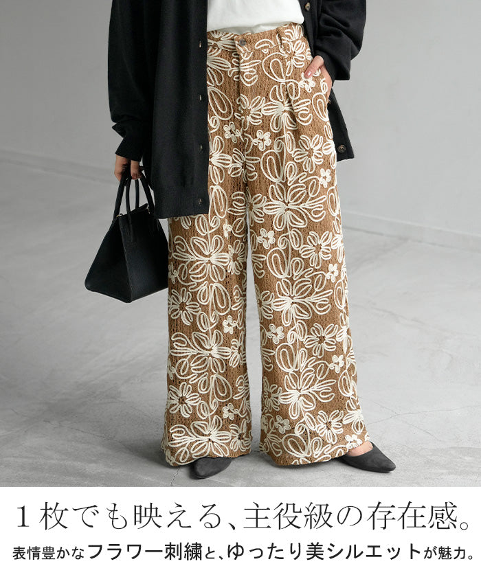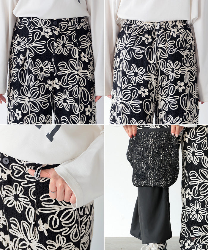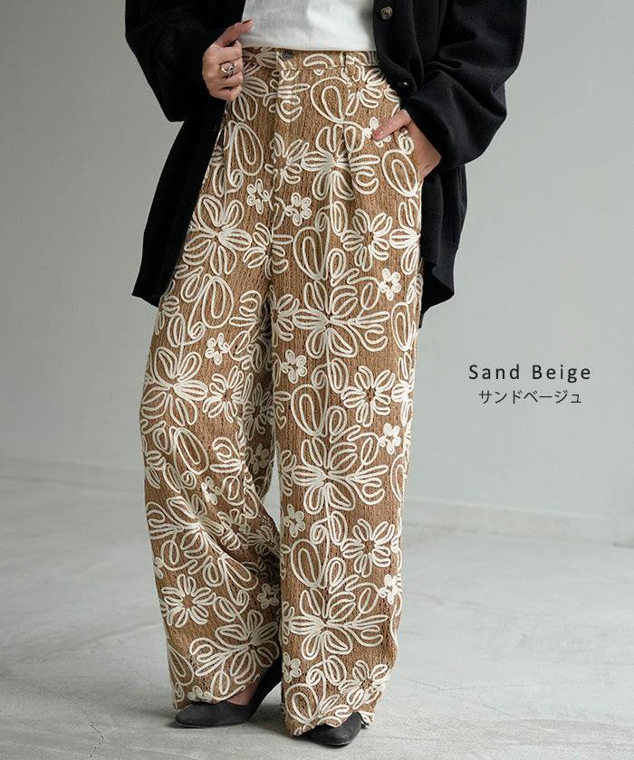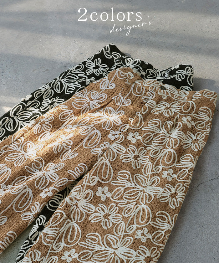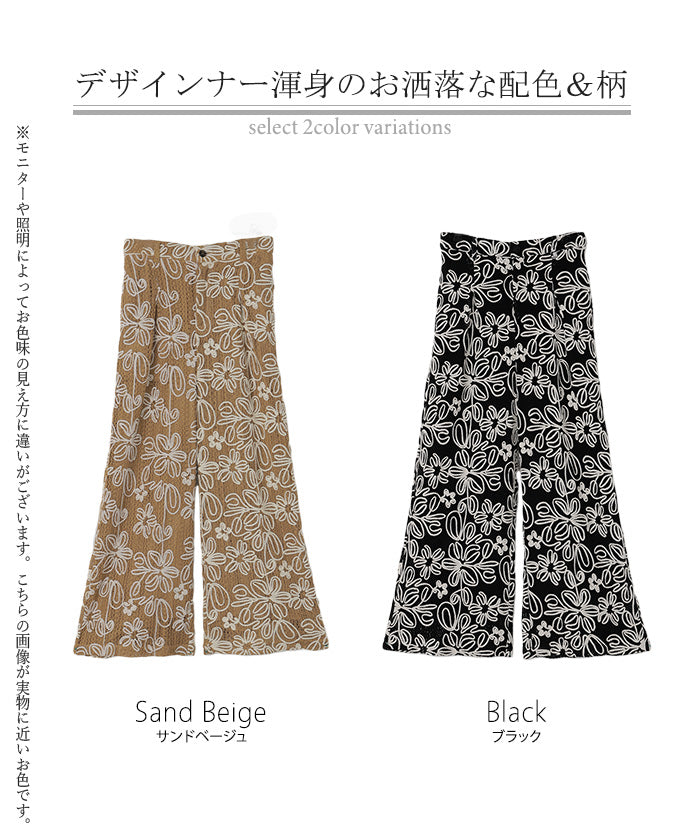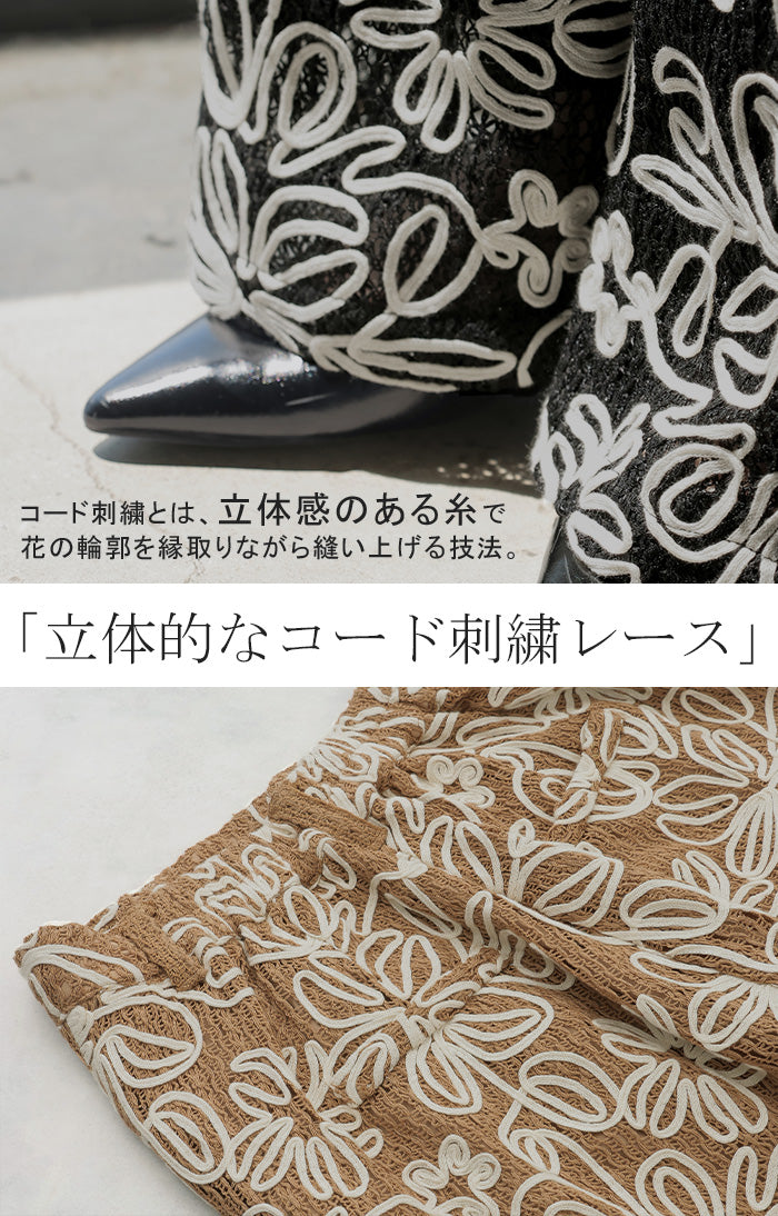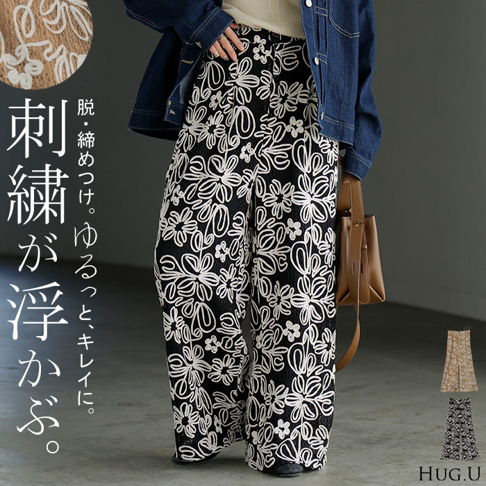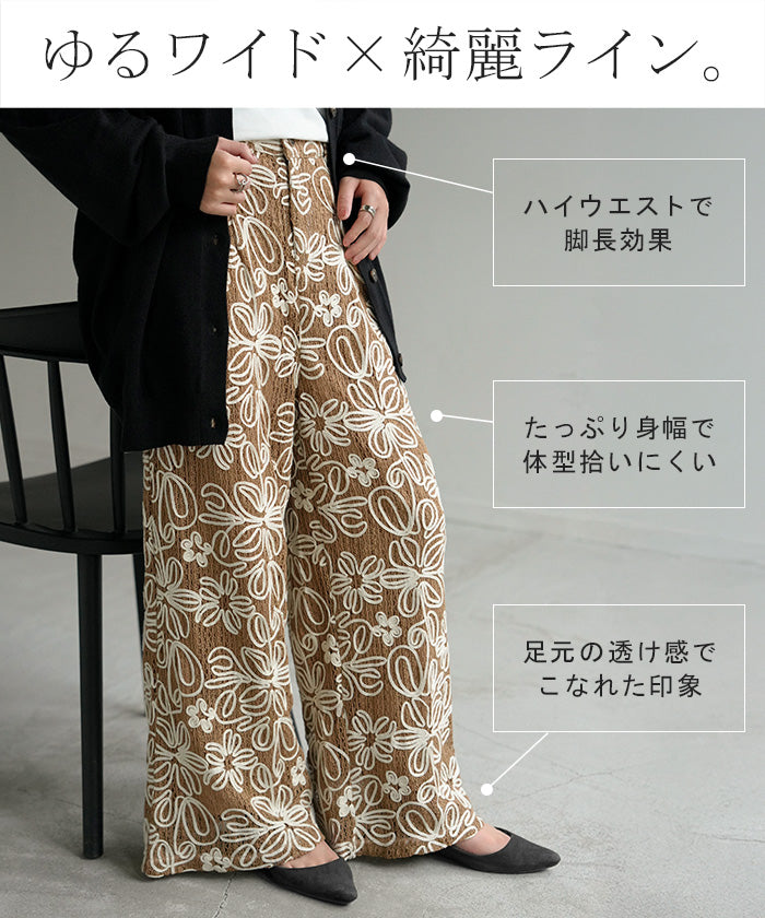 パンツ ワイド コード刺繡 総柄 透かし編み レディース ワイドパンツ 花柄 刺繍 立体 ロング ロングパンツ アート 体型カバー ボトムス ボトム ストレート ズボン ゆったり ハイウエスト 透け 美脚 大きいサイズ きれいめ 黒 ベージュ 春 夏 HUG.U