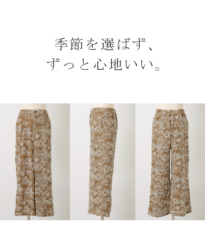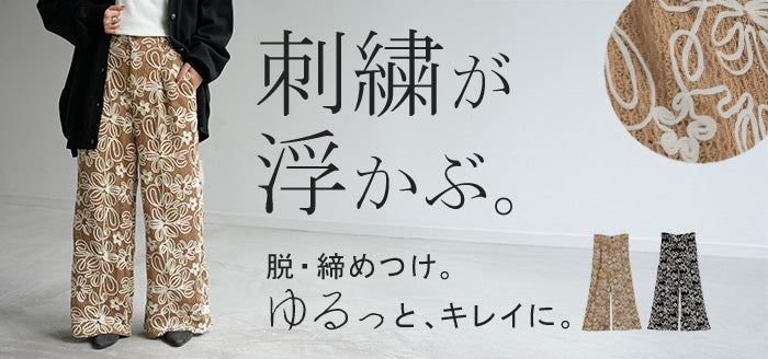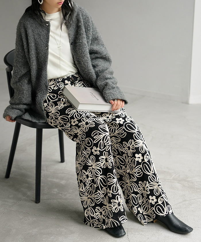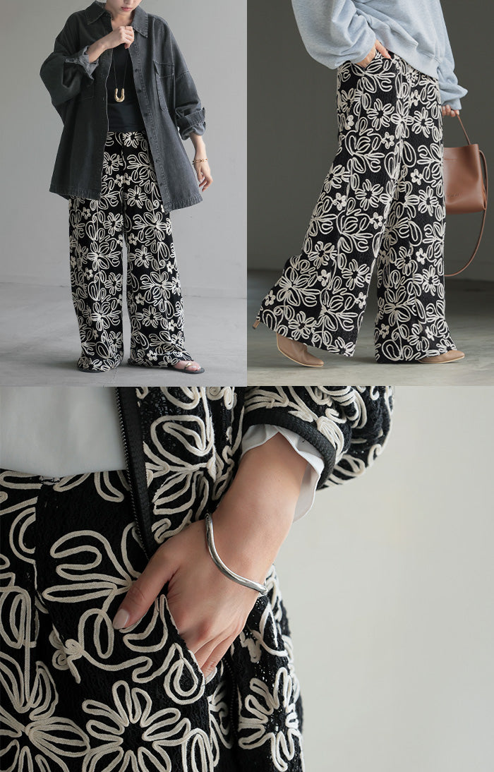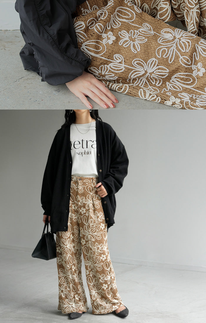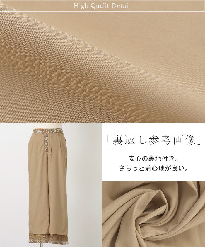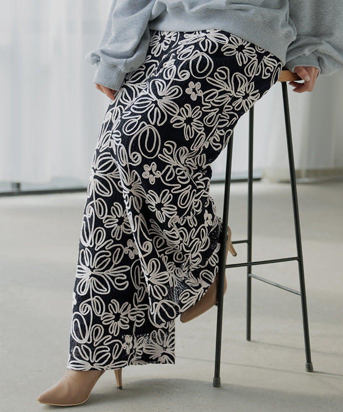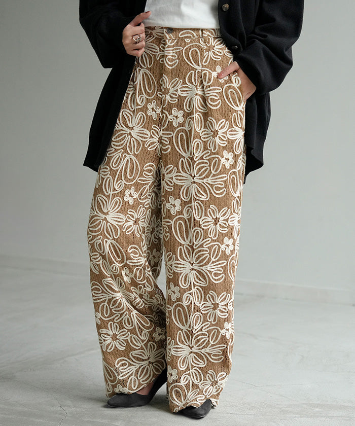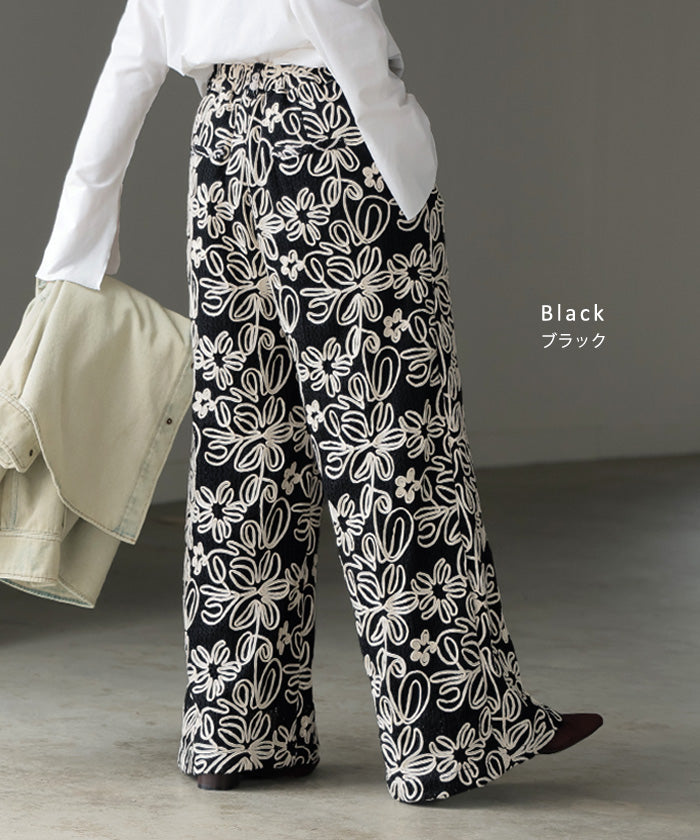パンツ ワイド コード刺繡 総柄 透かし編み レディース ワイドパンツ 花柄 刺繍 立体 ロング ロングパンツ アート 体型カバー ボトムス ボトム ストレート ズボン ゆったり ハイウエスト 透け 美脚 大きいサイズ きれいめ 黒 ベージュ 春 夏 HUG.U