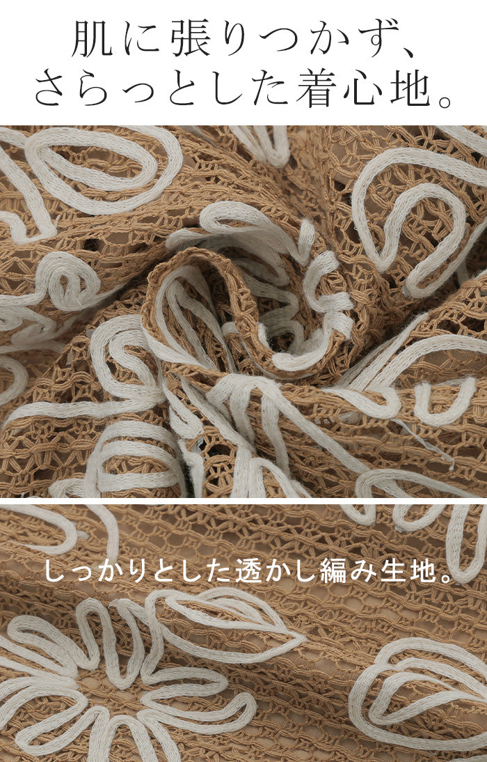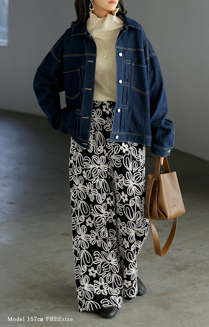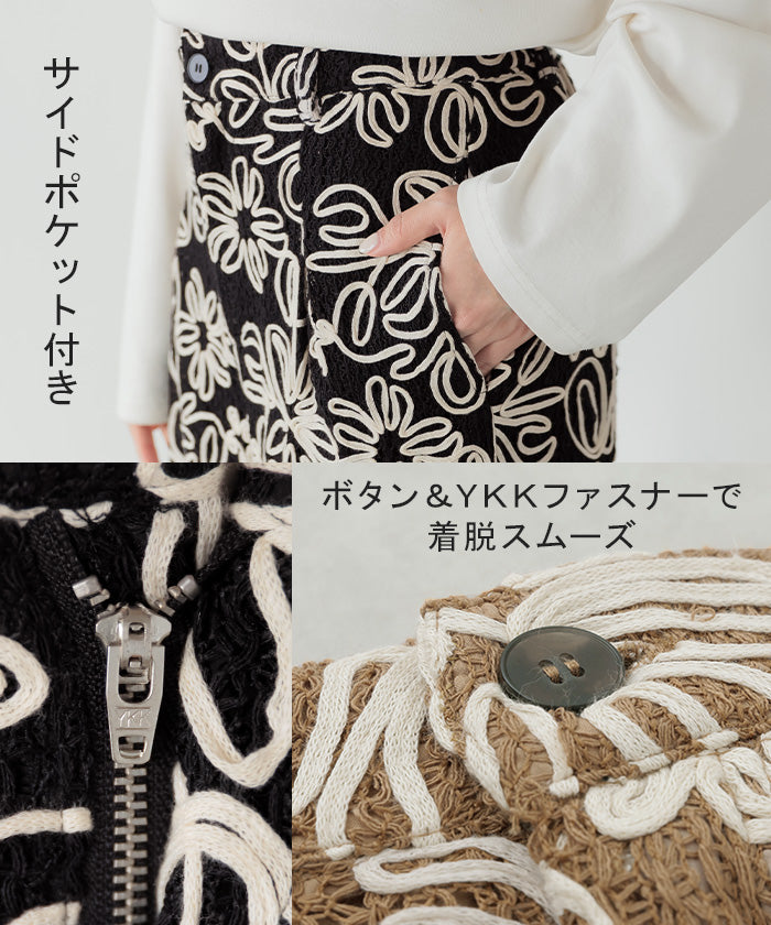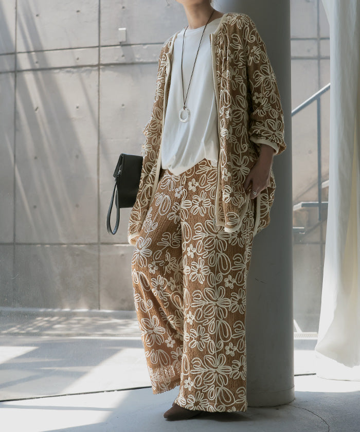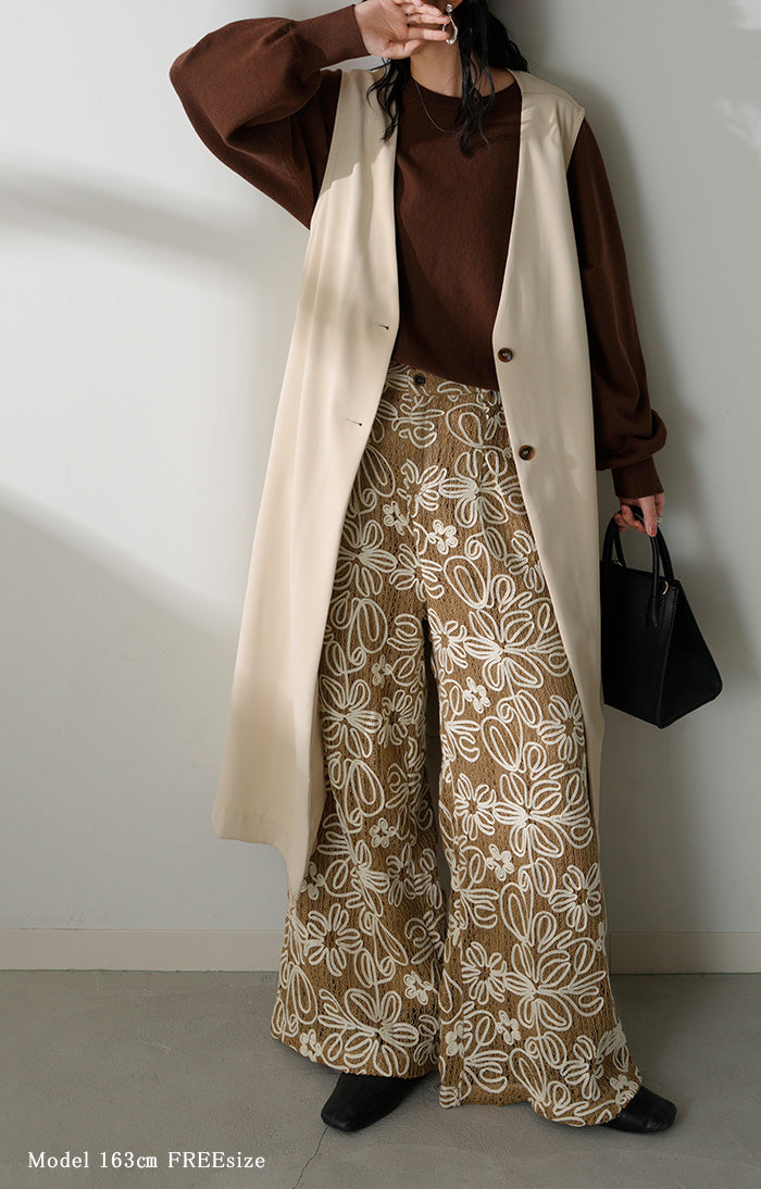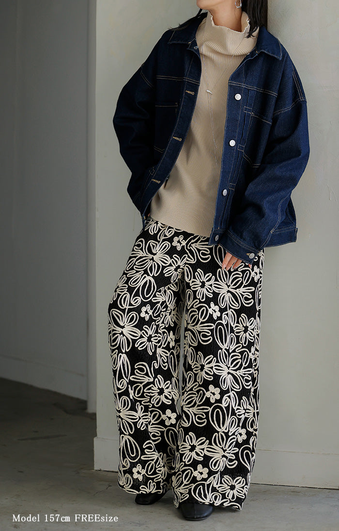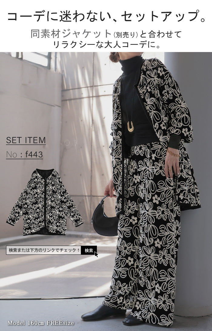 パンツ ワイド コード刺繡 総柄 透かし編み レディース ワイドパンツ 花柄 刺繍 立体 ロング ロングパンツ アート 体型カバー ボトムス ボトム ストレート ズボン ゆったり ハイウエスト 透け 美脚 大きいサイズ きれいめ 黒 ベージュ 春 夏 HUG.U