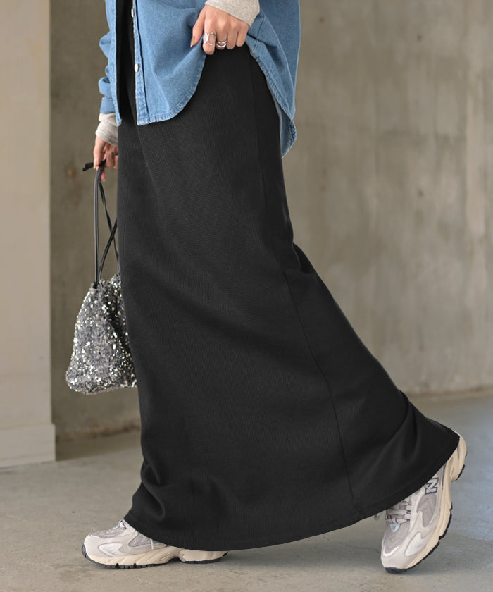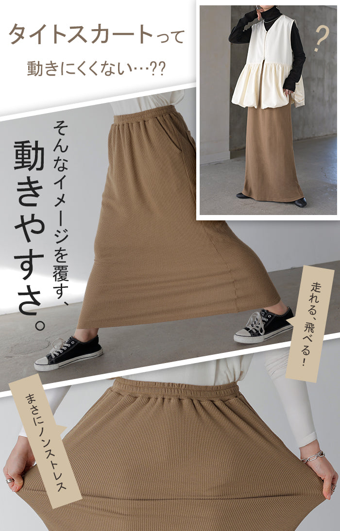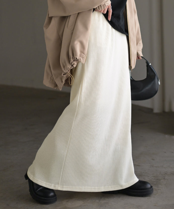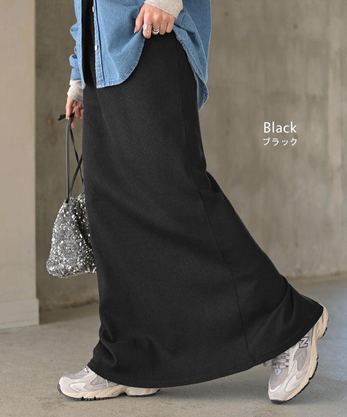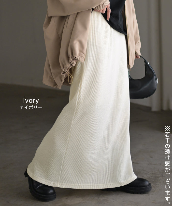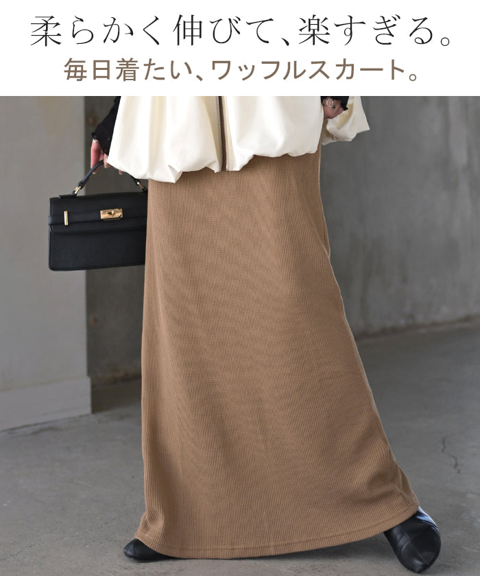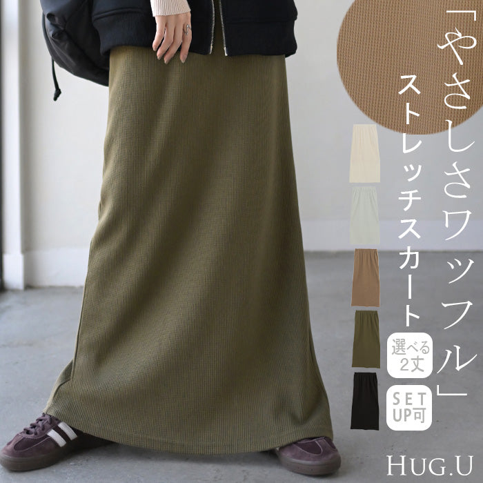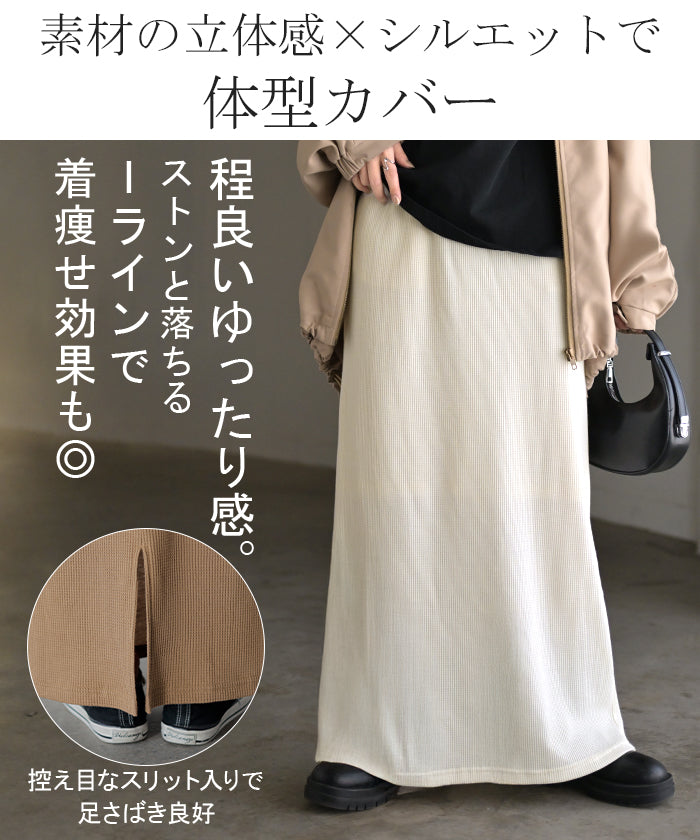 スカート ワッフル タイトスカート レディース ボトムス 無地 ナロースカート ストレッチ ウエストゴム 着痩せ Iライン ロング ロングスカート 裏地 マキシ 綿 混 別売り セットアップ 可 体型カバー ポケット 大きいサイズ 白 黒 春 夏 HUG.U