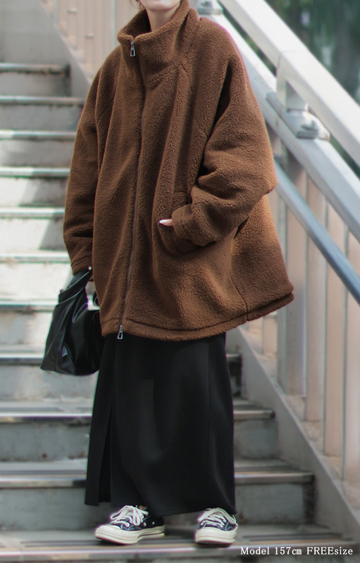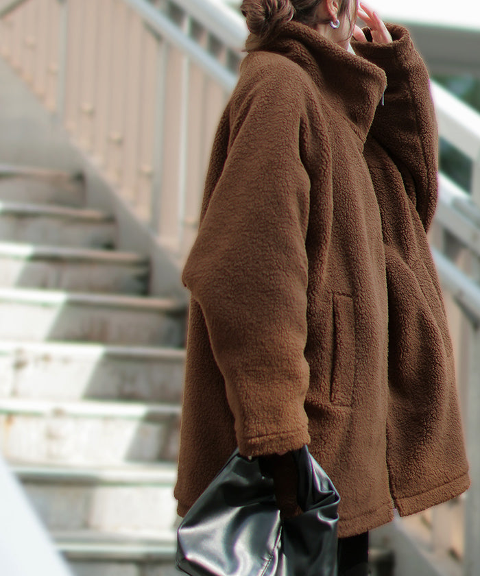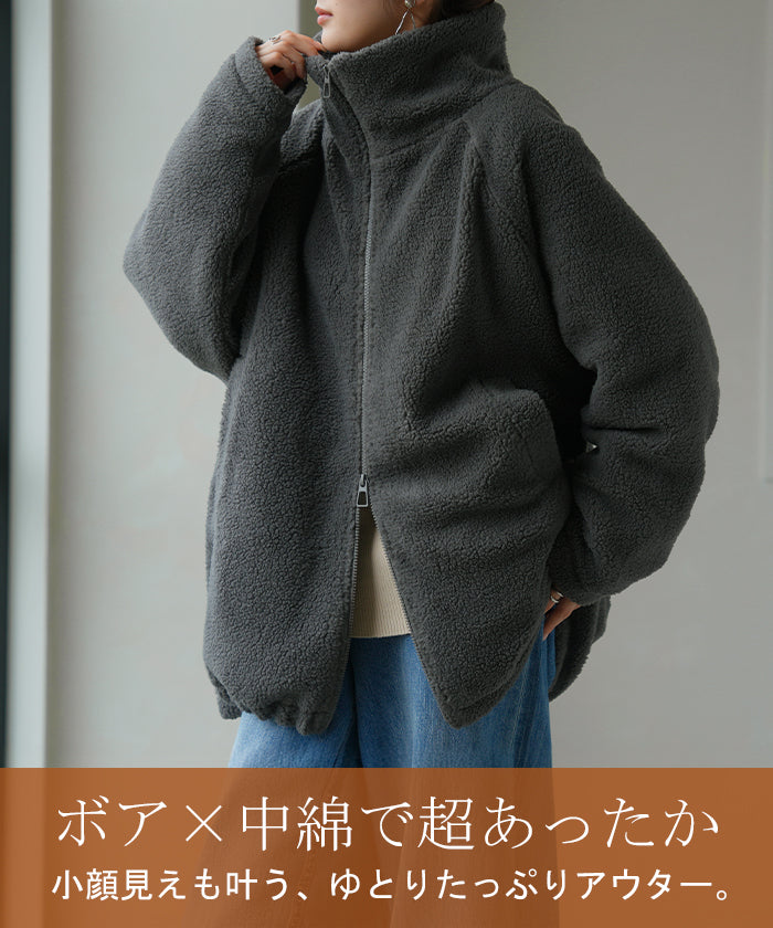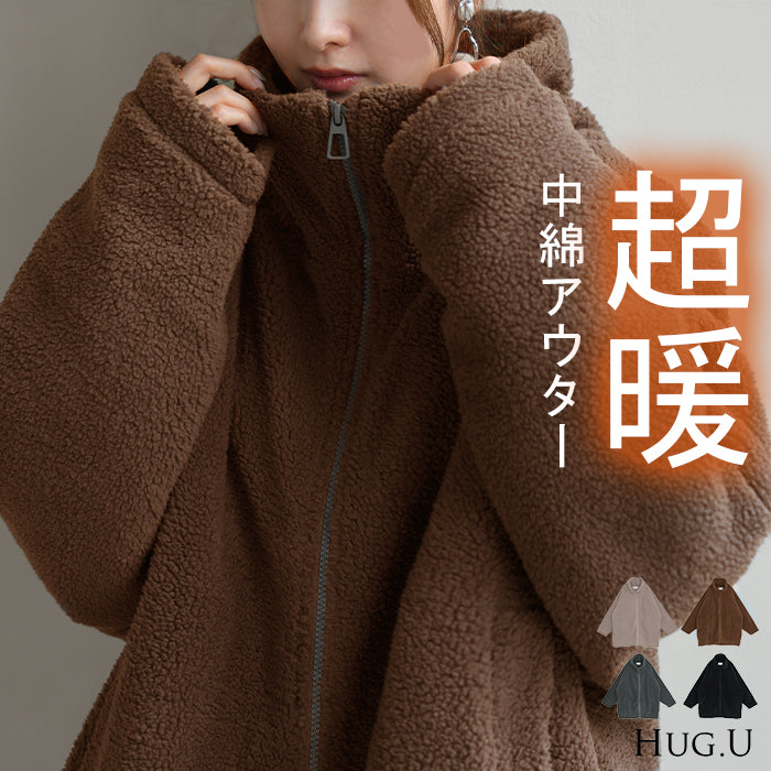 2025AW新作 コート ボア 中綿 ドルマンスリーブ アウター レディース ボアアウター 中綿アウター 中綿コートドルマン ドロスト 長袖 オーバーサイズ 裏地 大きいサイズ 重ね着 体型カバー 二の腕カバー カジュアル 防寒 グレー ブラック 秋 冬 HUG.U