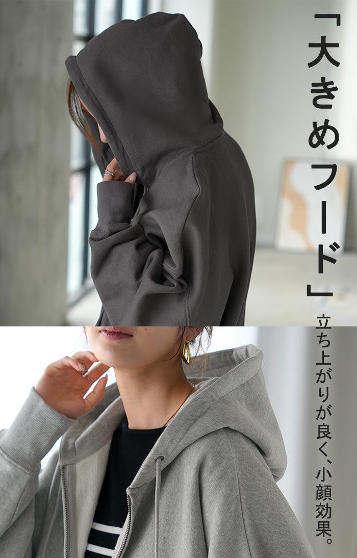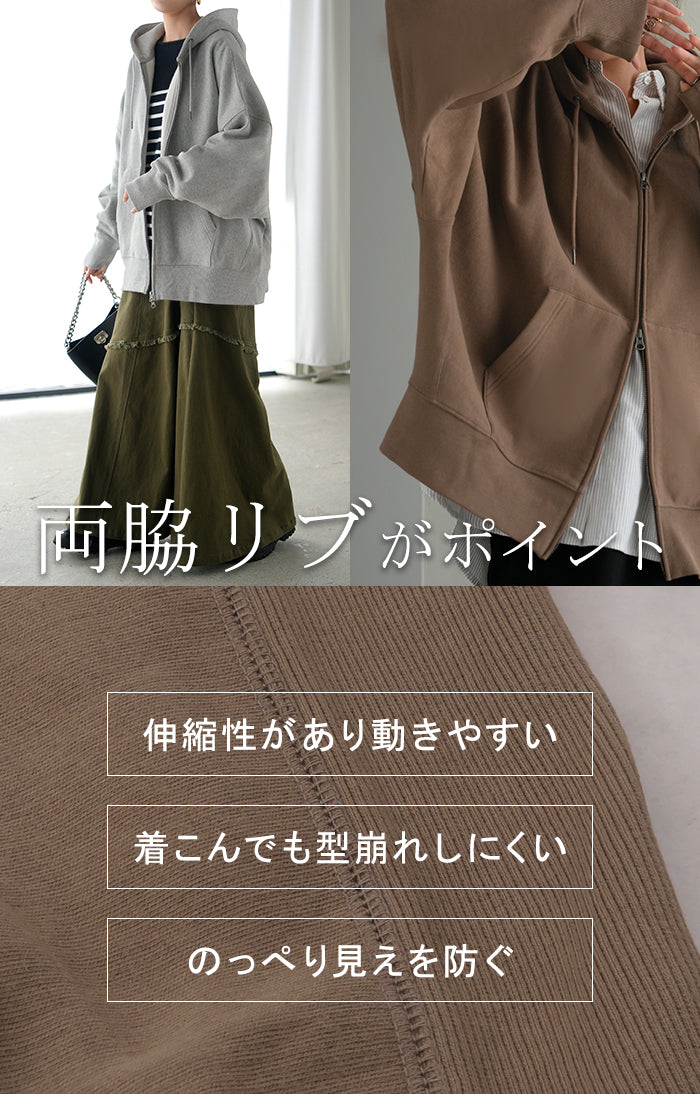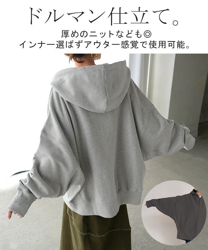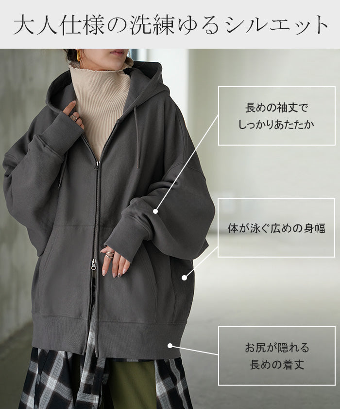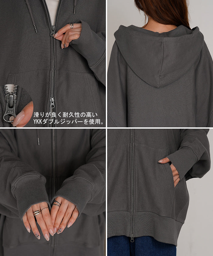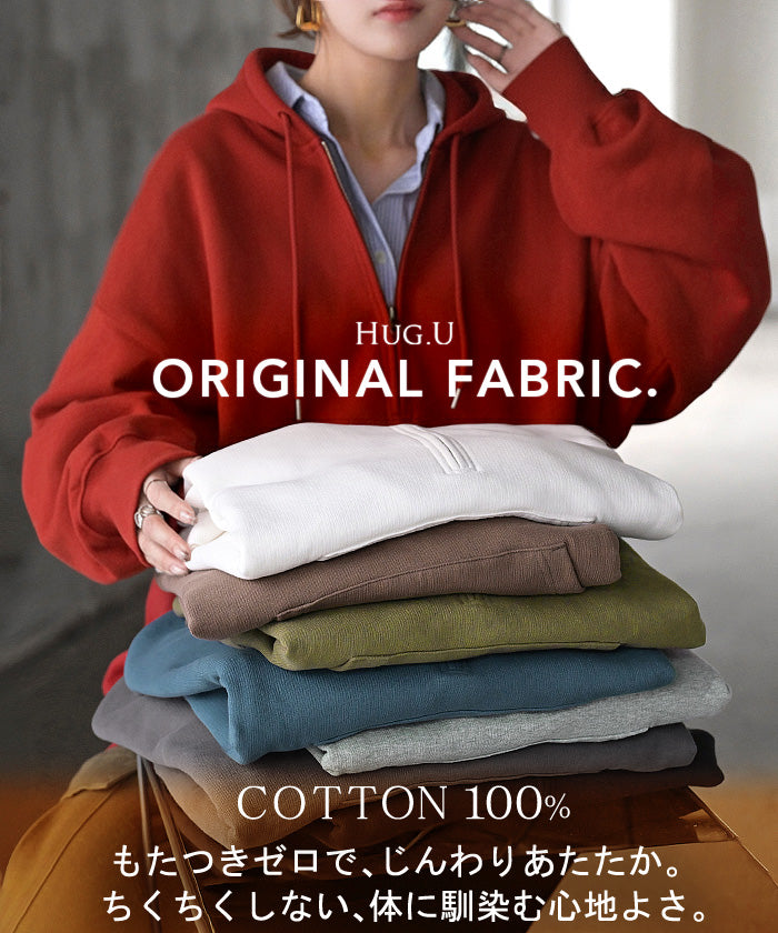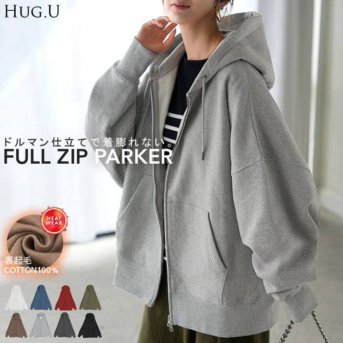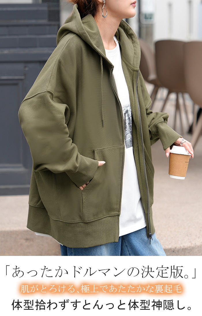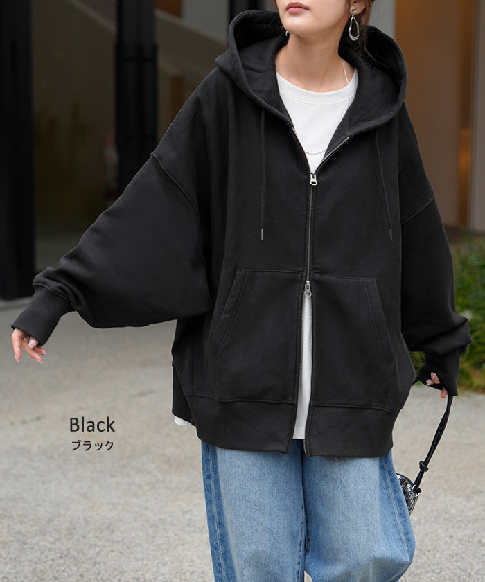 2025AW新作 パーカー スウェット 裏起毛 綿100 レディース アウター トップス トレーナー プルオーバー フード フーディー ドルマン ライトアウター 抗菌 消臭 ファスナー ビッグ ゆったり オーバーサイズ 羽織 体型カバー 大きいサイズ お尻が隠れる 黒 白 秋 冬 HUG.U