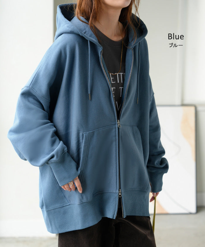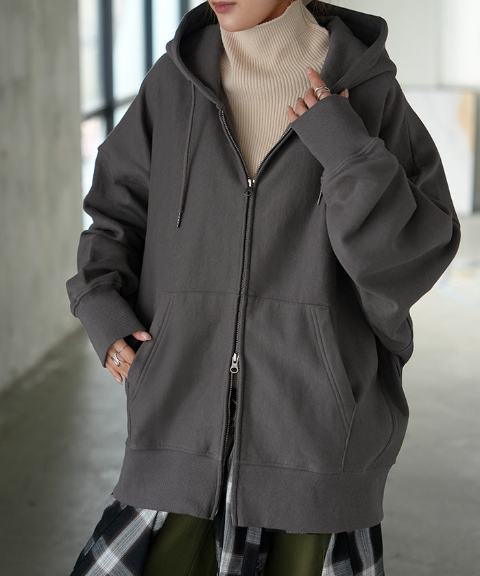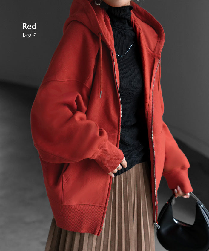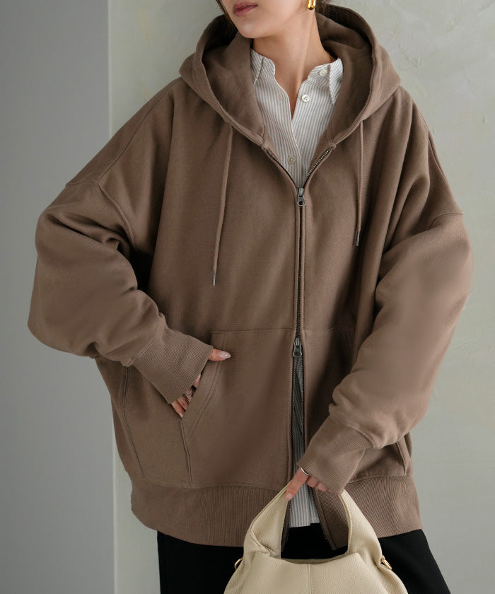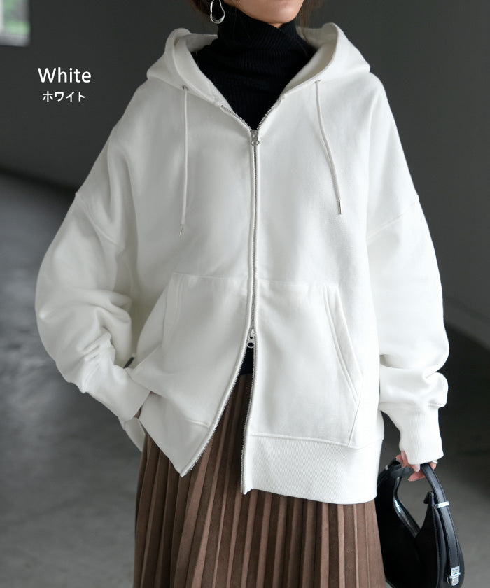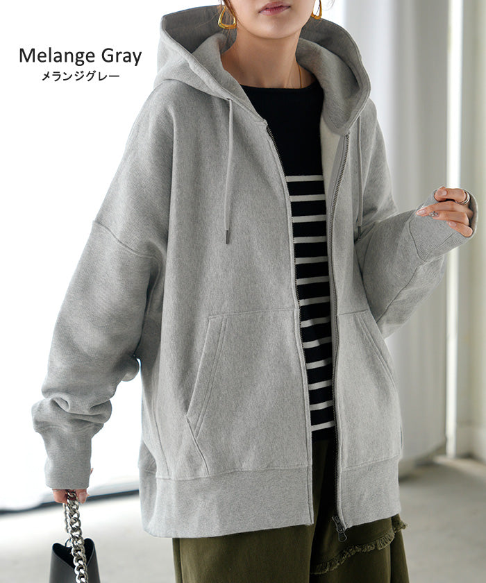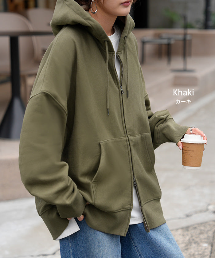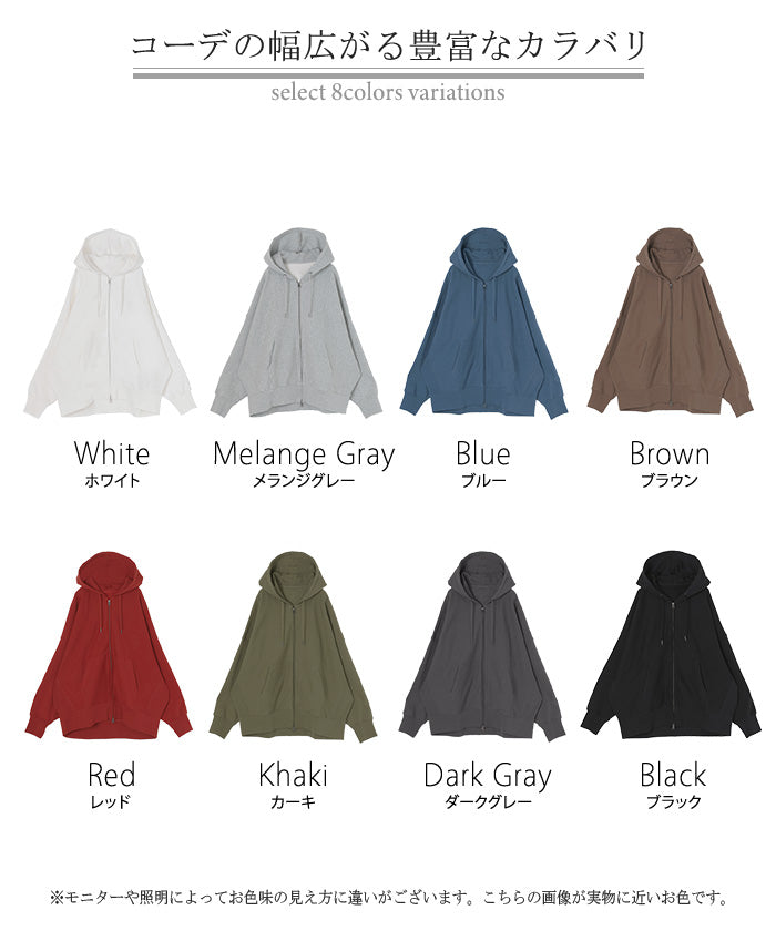 2025AW新作 パーカー スウェット 裏起毛 綿100 レディース アウター トップス トレーナー プルオーバー フード フーディー ドルマン ライトアウター 抗菌 消臭 ファスナー ビッグ ゆったり オーバーサイズ 羽織 体型カバー 大きいサイズ お尻が隠れる 黒 白 秋 冬 HUG.U