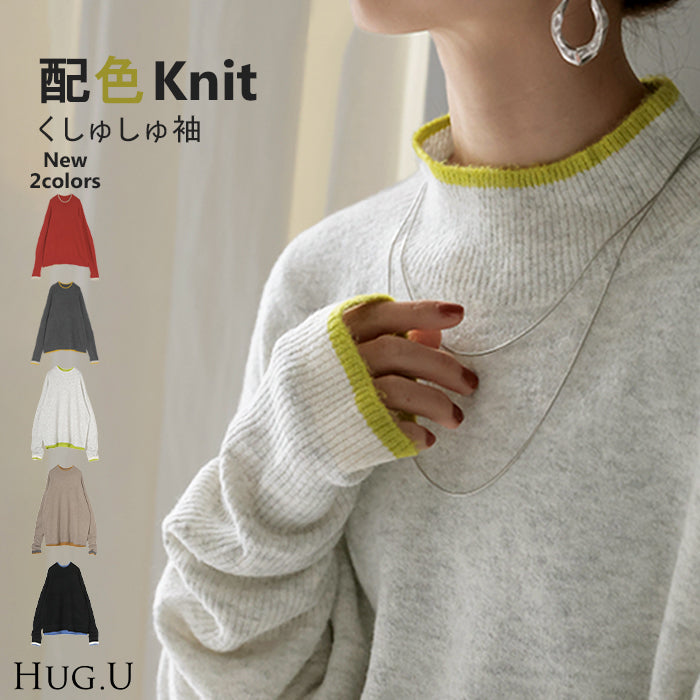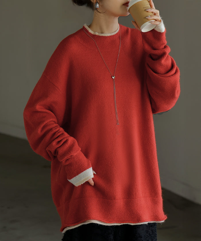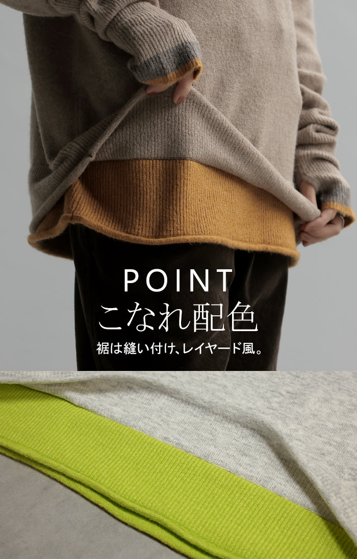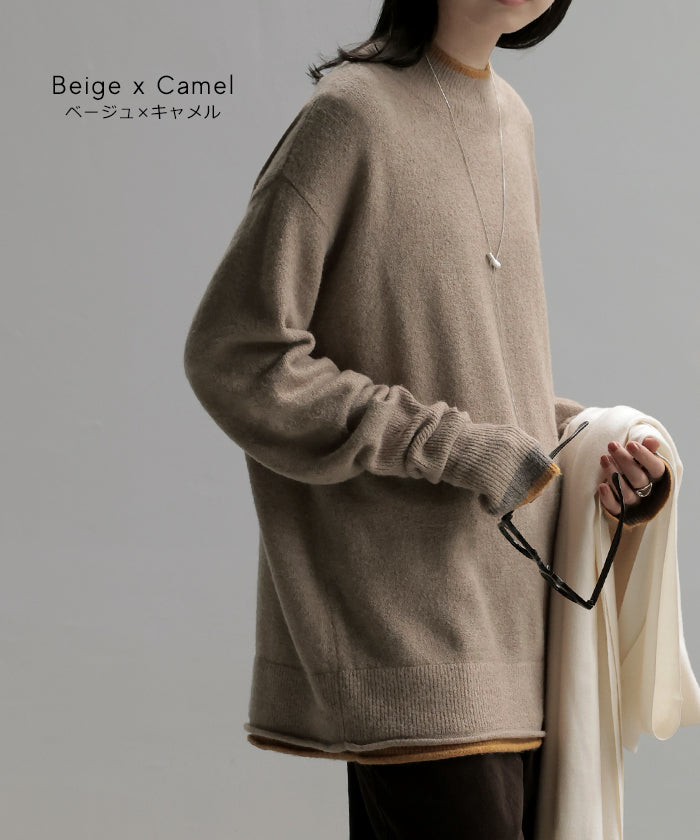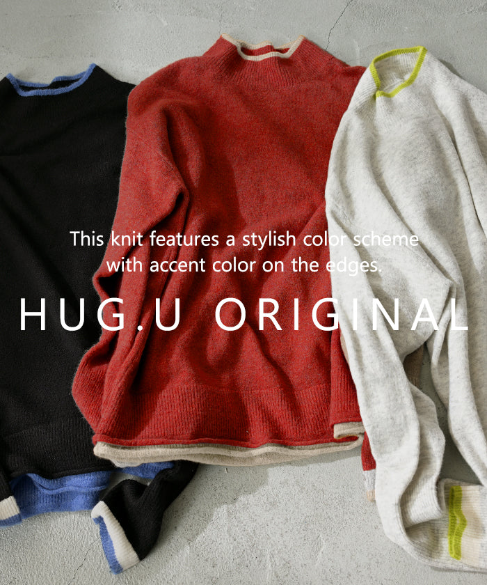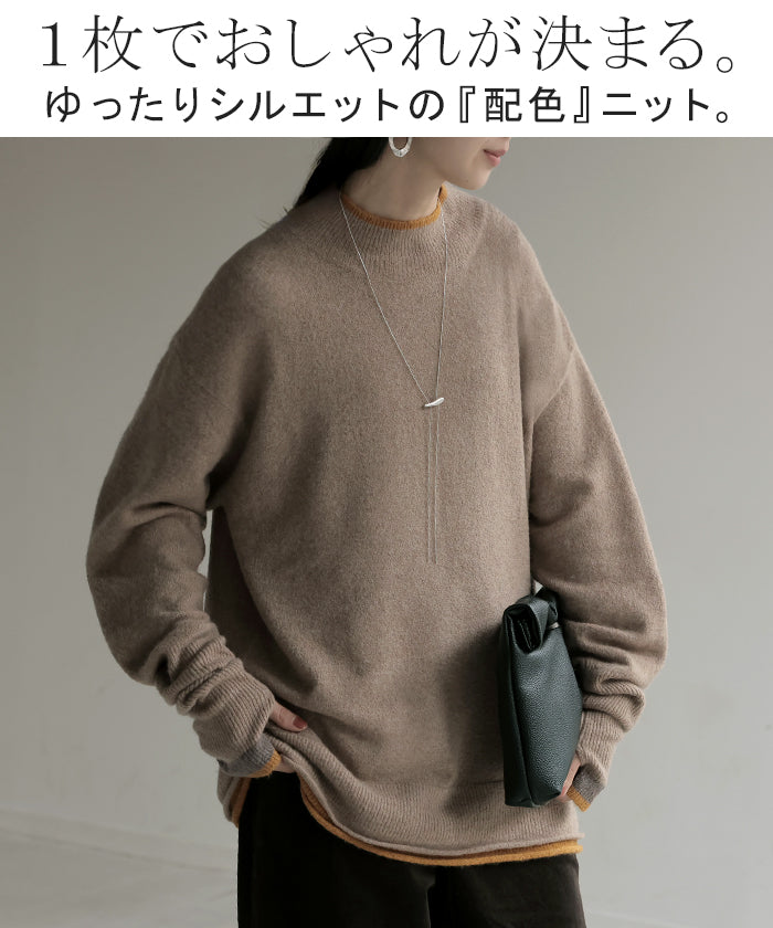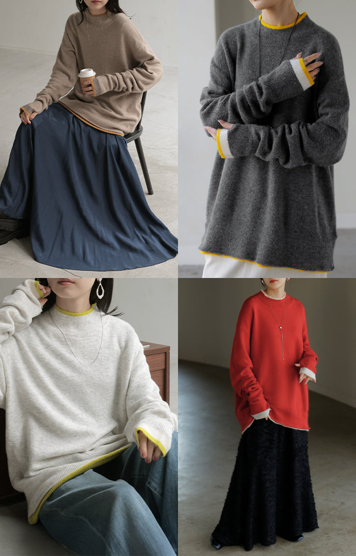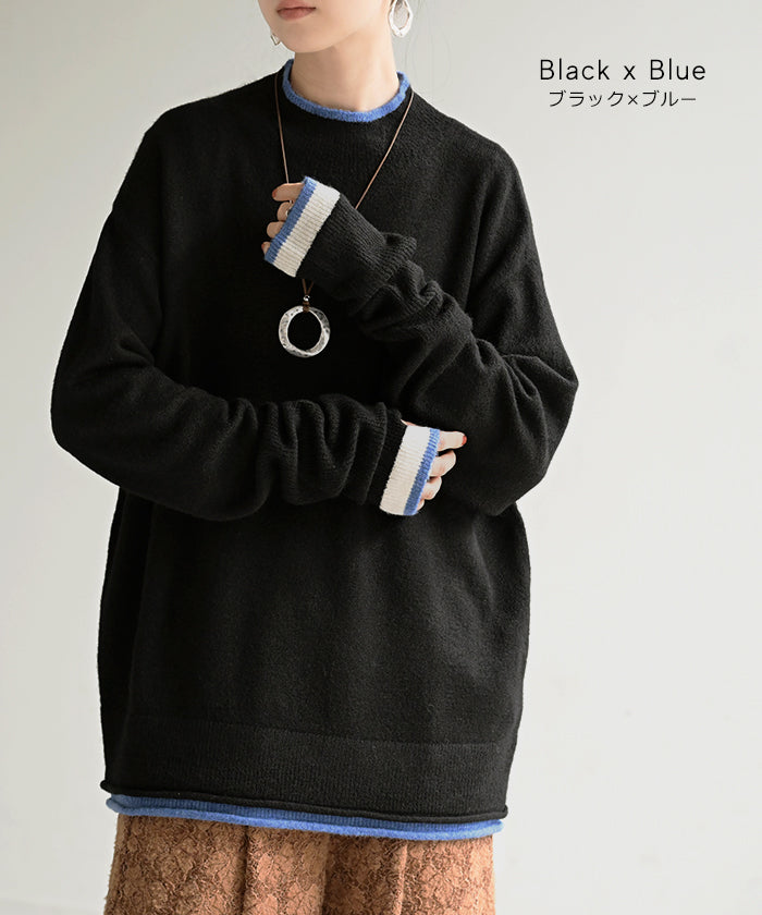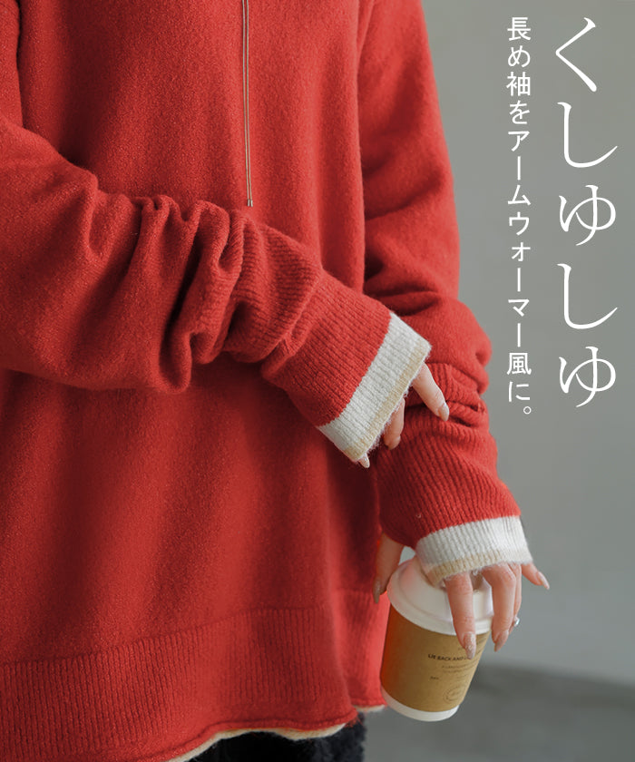 2025AW新作 ニット 配色 トップス ロング レディース セーター オーバー プルオーバー タートルネック ハイネック 長袖 長い 指穴 リブ チュニック ゆったり インナー レイヤード ストレッチ 体型カバー 大きいサイズ お尻が隠れる カジュアル 黒 ベージュ 秋 冬 HUG.U