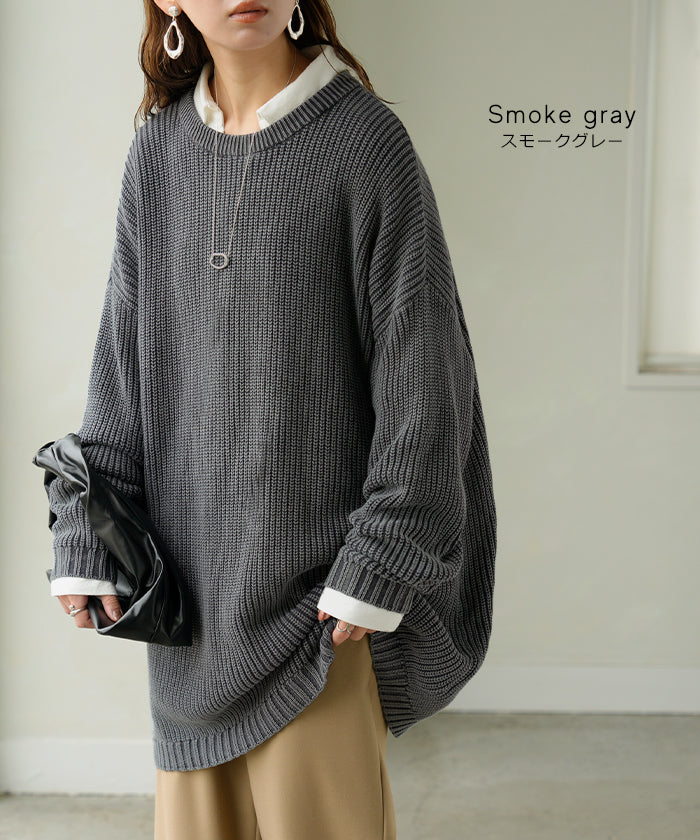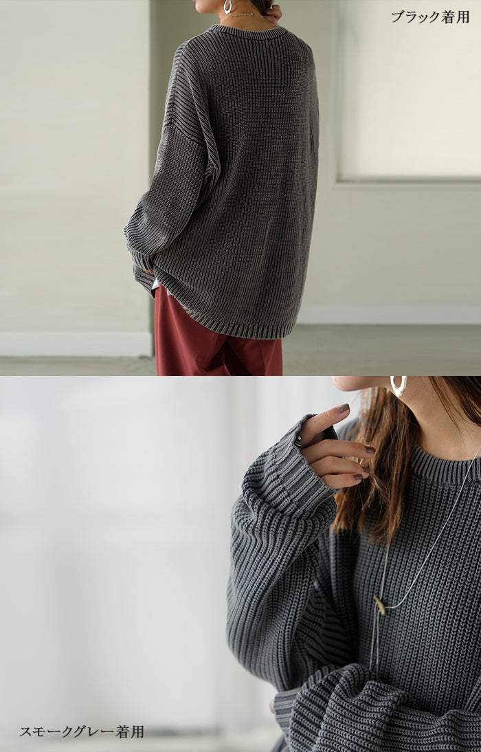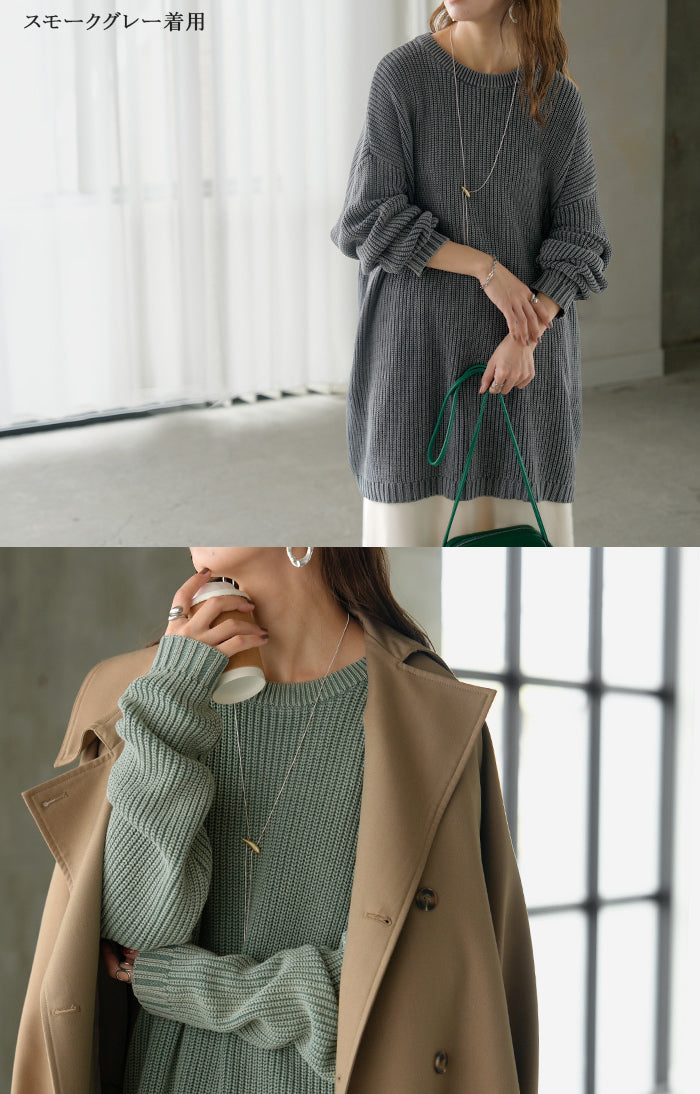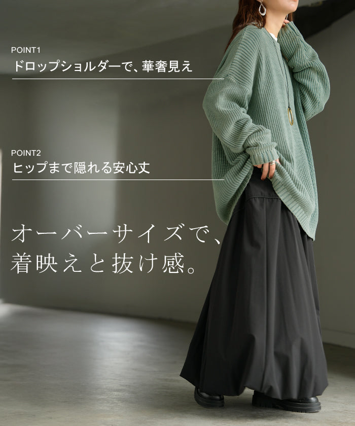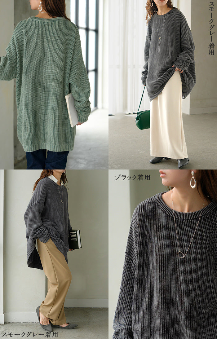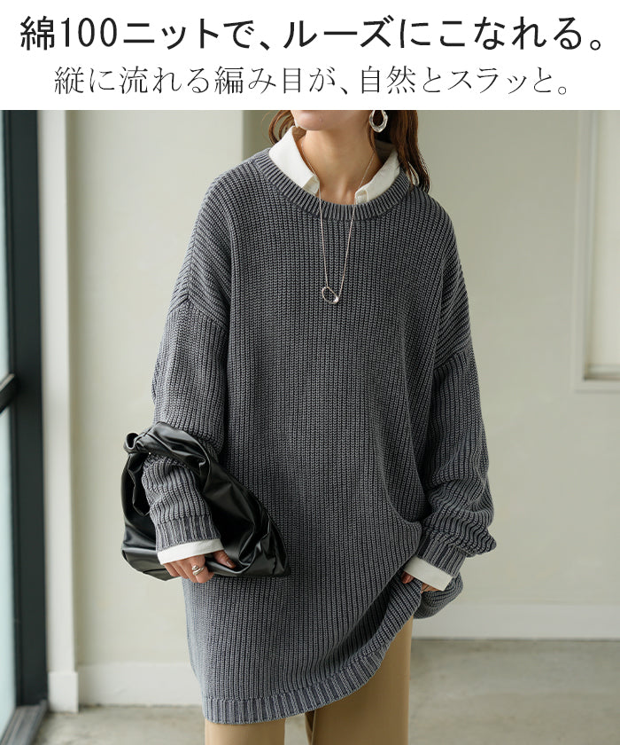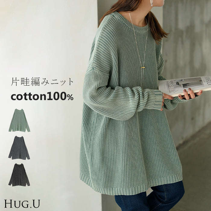 2025AW新作 ニット 片畦編み 綿100 ■一部11月上旬入荷 プルオーバー レディース ロング トップス セーター オーバー 長袖 長い ドルマン クルーネック 無地 リブ ストレッチ チュニック ゆったり 体型カバー 大きいサイズ お尻が隠れる レイヤード カジュアル 黒 グレー 秋 冬 HUG.U