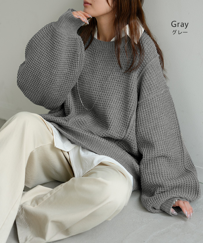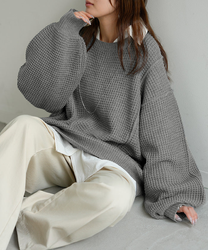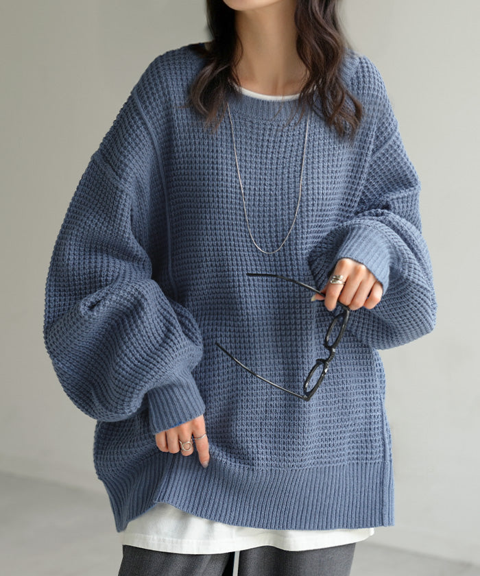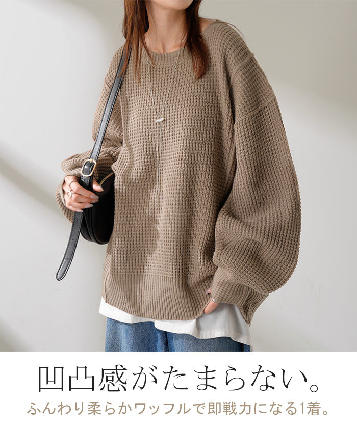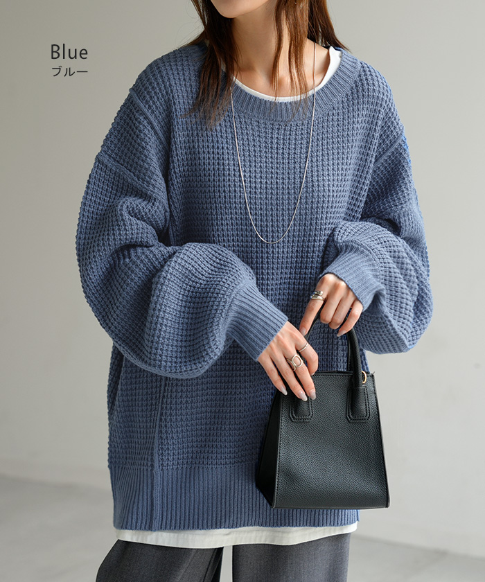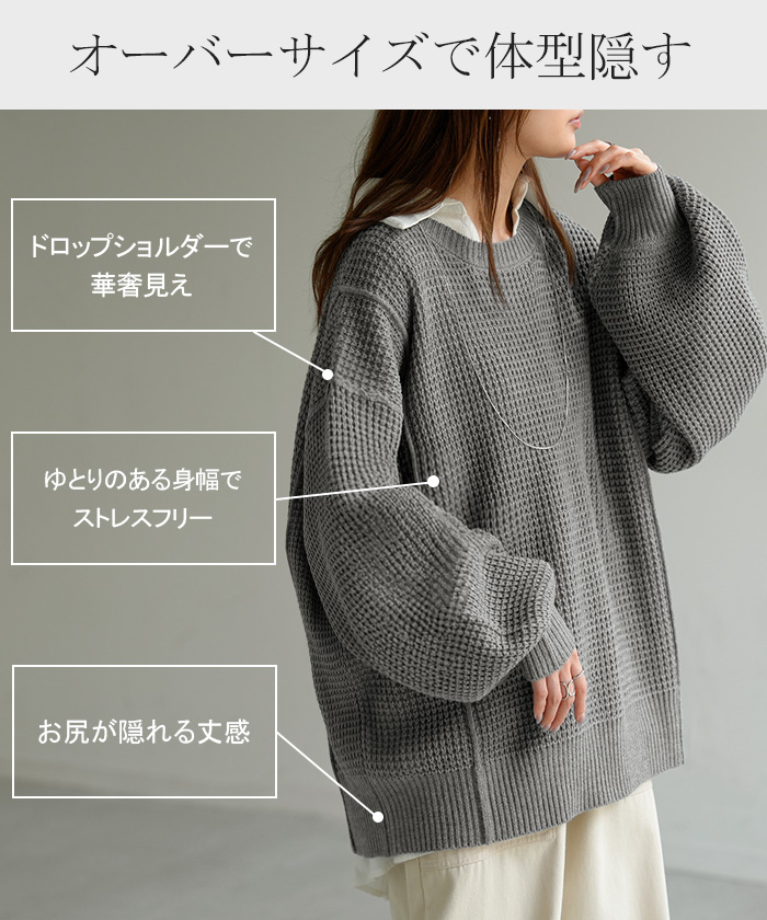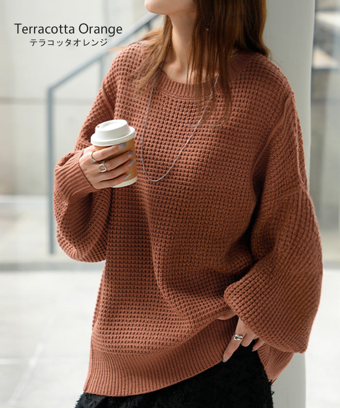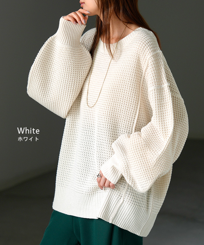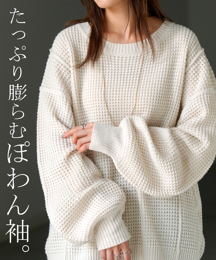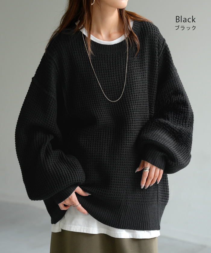 2025AW新作 ニット ワッフル ■10月下旬入荷 プルオーバー レディース トップス ロング セーター ワッフル生地 長袖 長い ボリュームスリーブ クルーネック リブ チュニック ゆったり チクチクしない 軽い 体型カバー 大きいサイズ お尻が隠れる カジュアル 黒 白 秋 冬 HUG.U