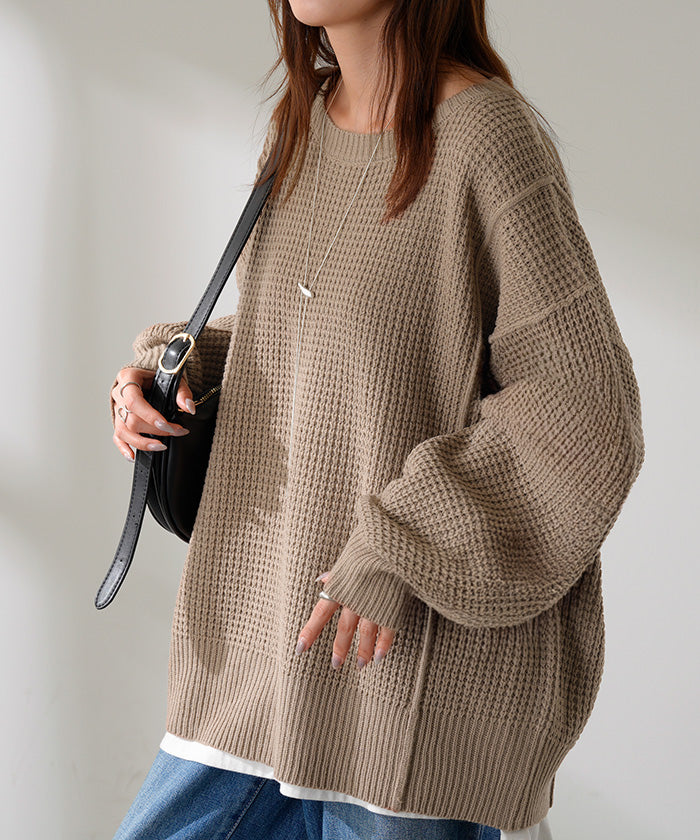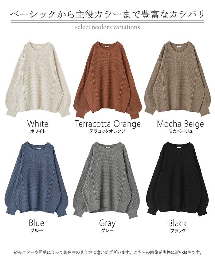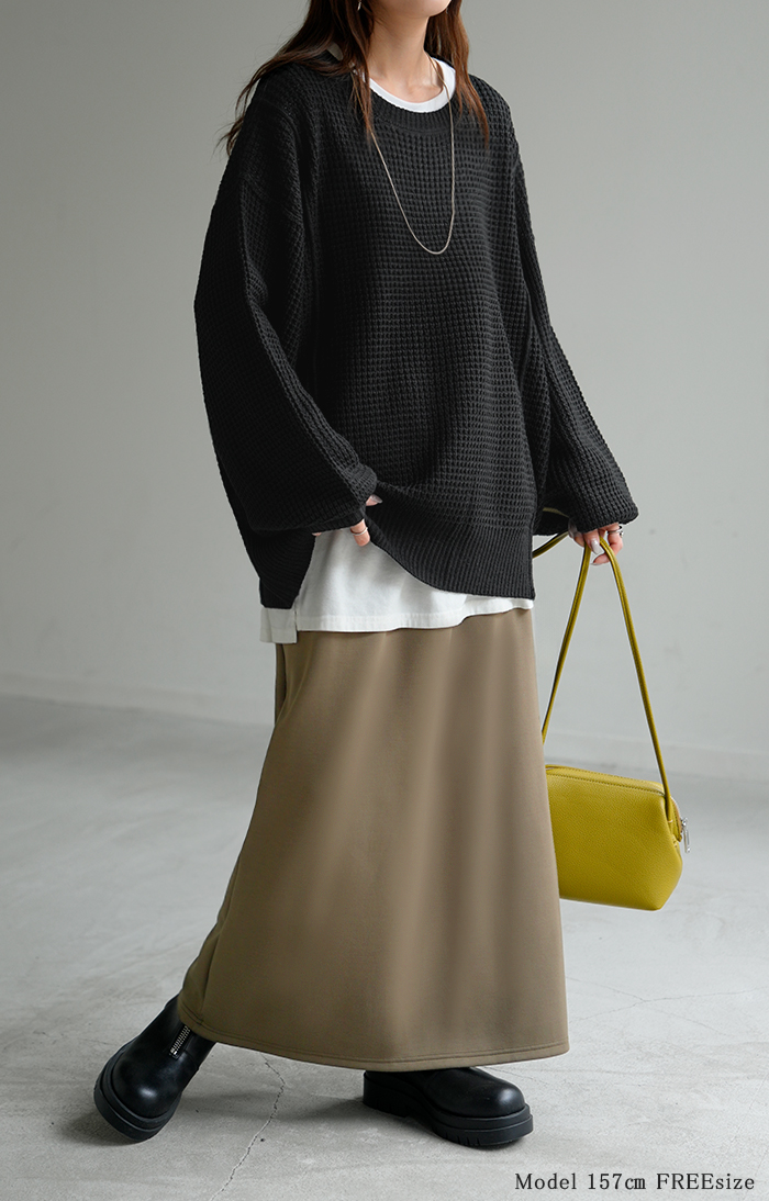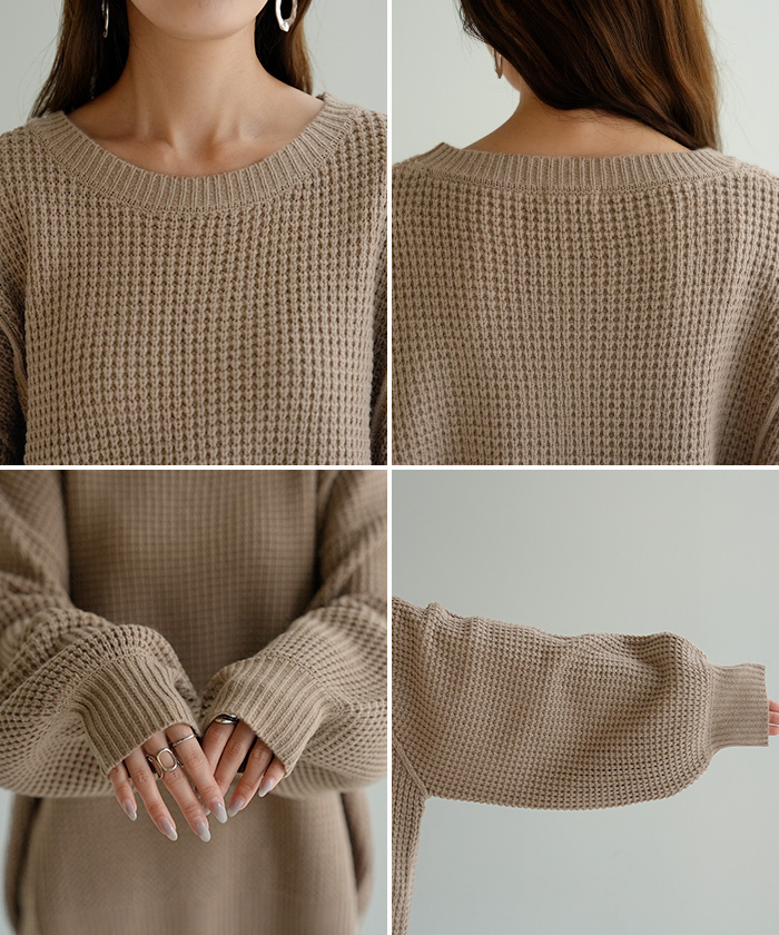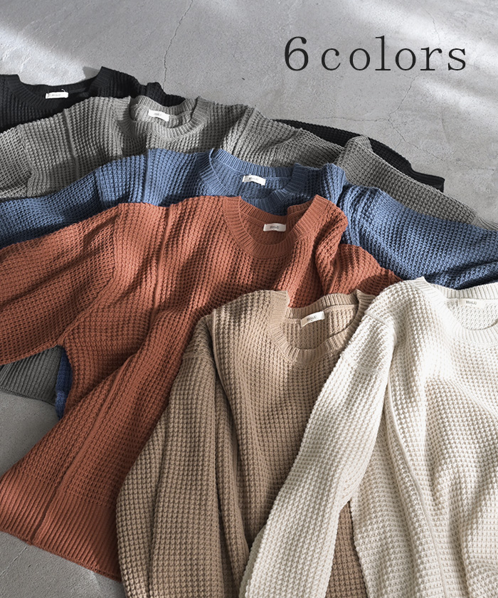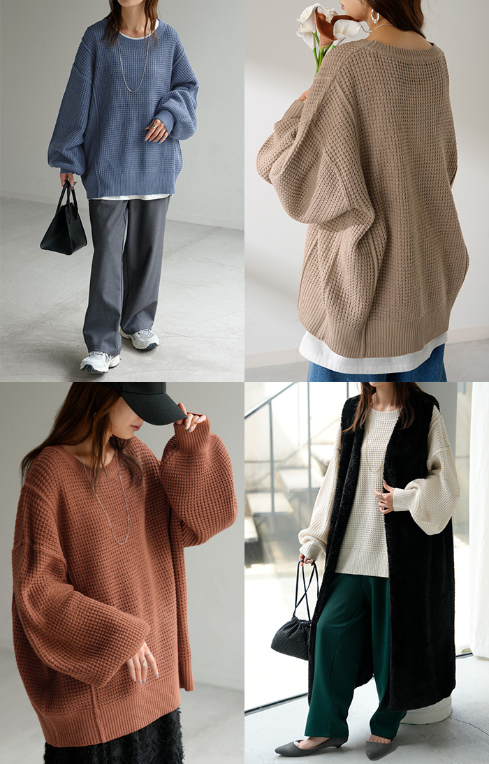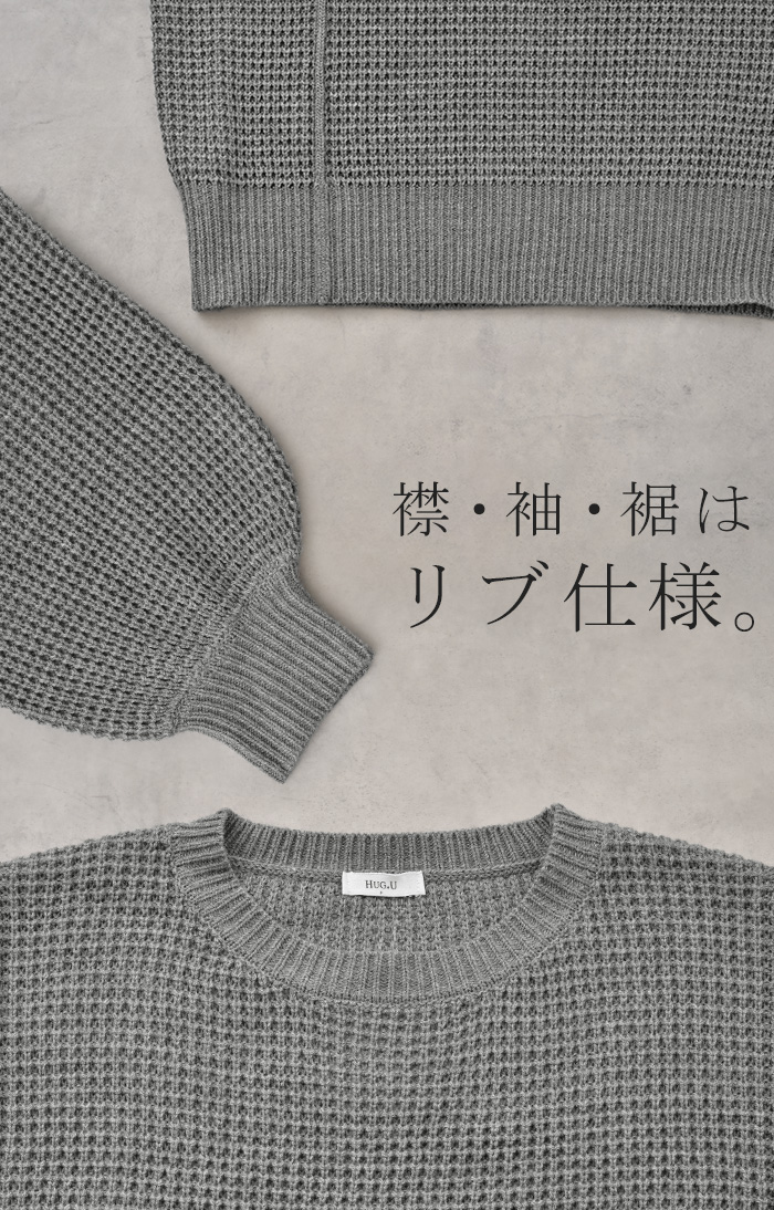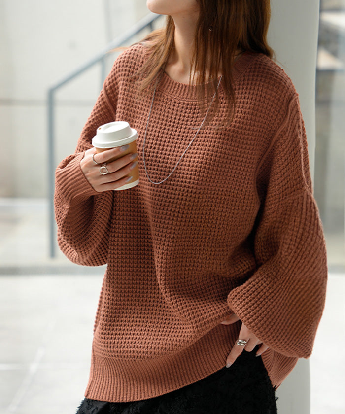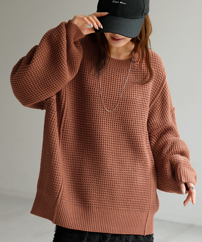 2025AW新作 ニット ワッフル ■10月下旬入荷 プルオーバー レディース トップス ロング セーター ワッフル生地 長袖 長い ボリュームスリーブ クルーネック リブ チュニック ゆったり チクチクしない 軽い 体型カバー 大きいサイズ お尻が隠れる カジュアル 黒 白 秋 冬 HUG.U