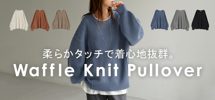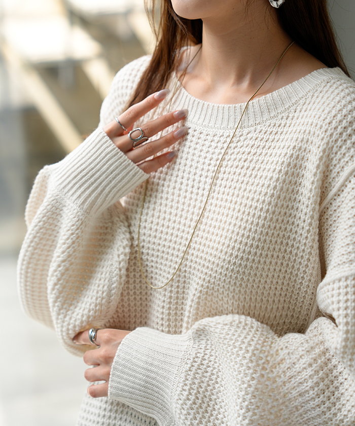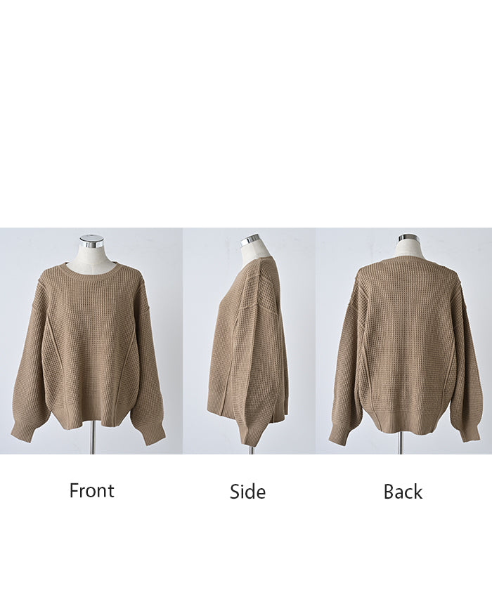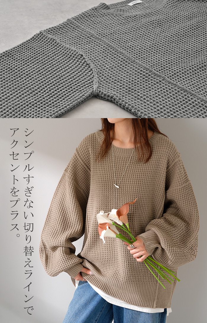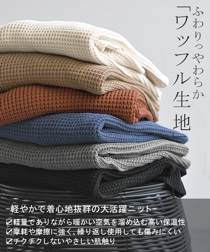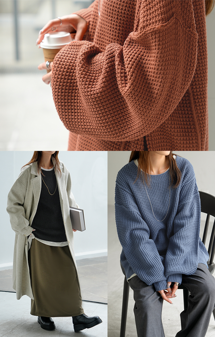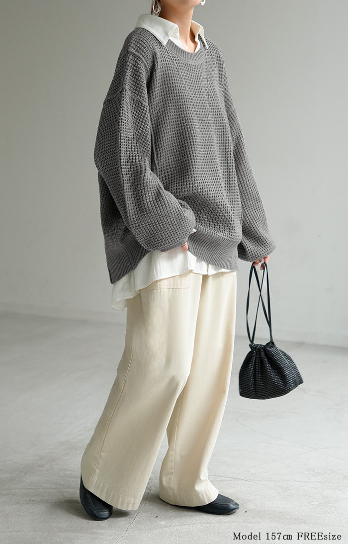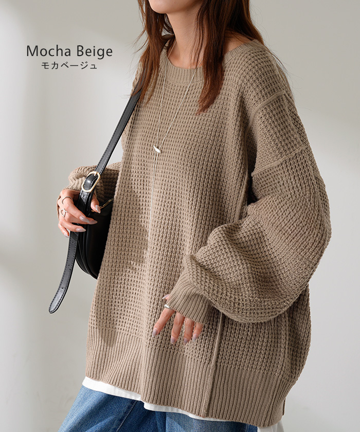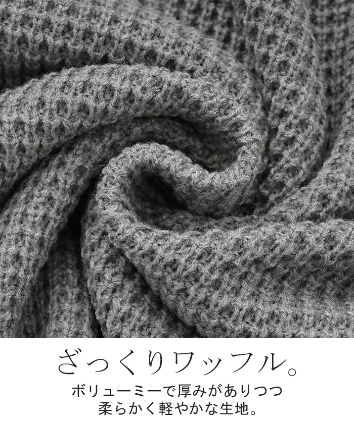 2025AW新作 ニット ワッフル ■10月下旬入荷 プルオーバー レディース トップス ロング セーター ワッフル生地 長袖 長い ボリュームスリーブ クルーネック リブ チュニック ゆったり チクチクしない 軽い 体型カバー 大きいサイズ お尻が隠れる カジュアル 黒 白 秋 冬 HUG.U