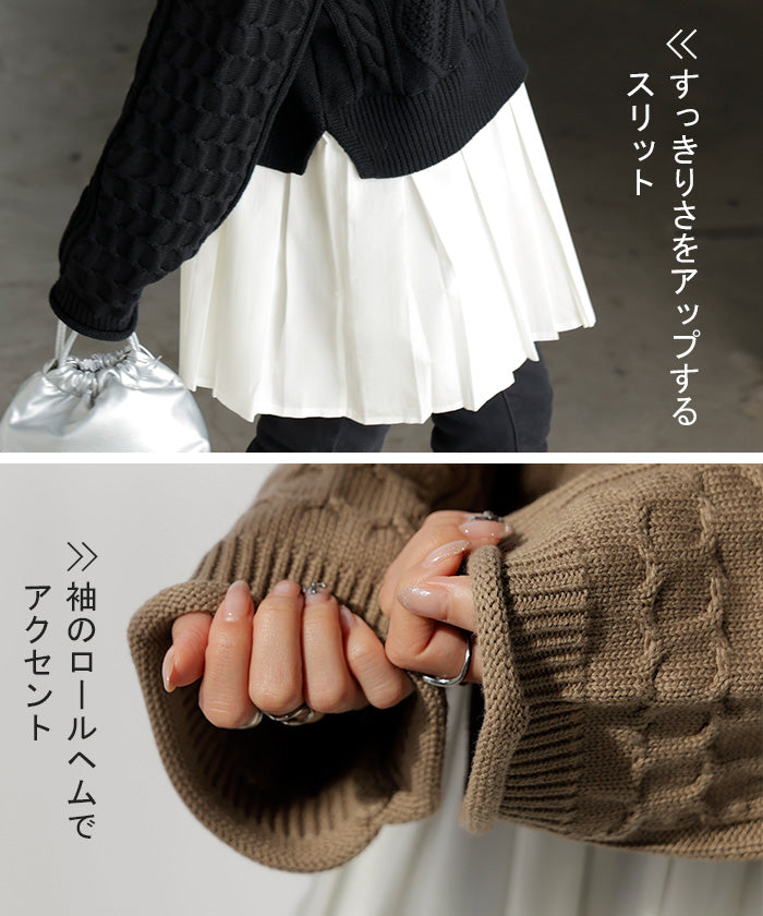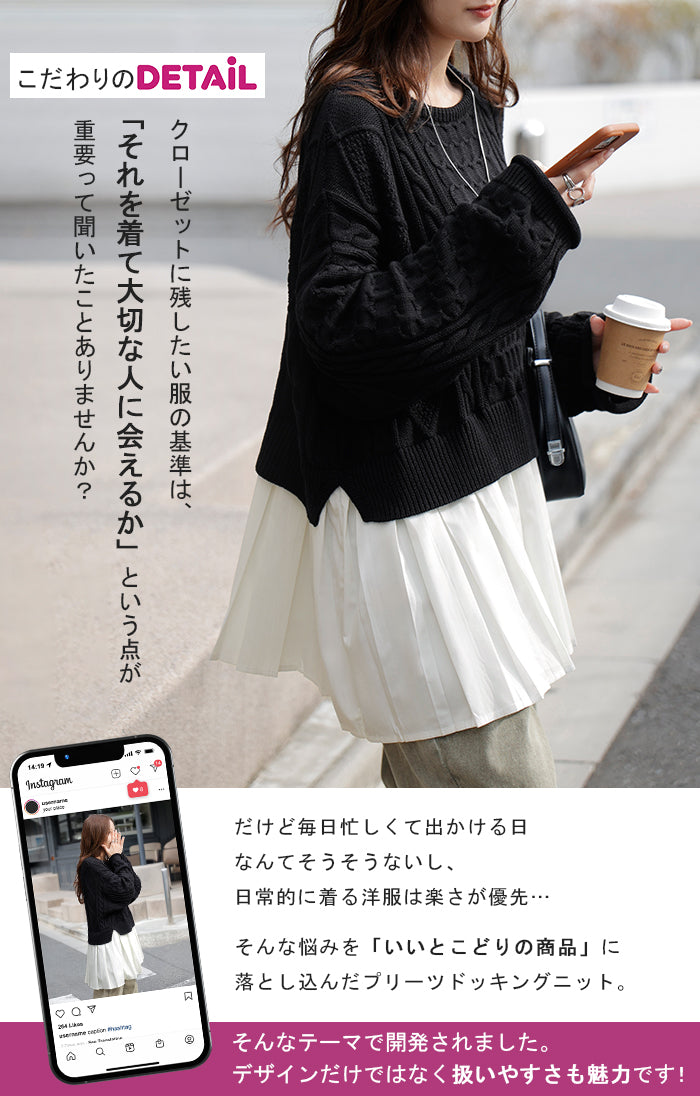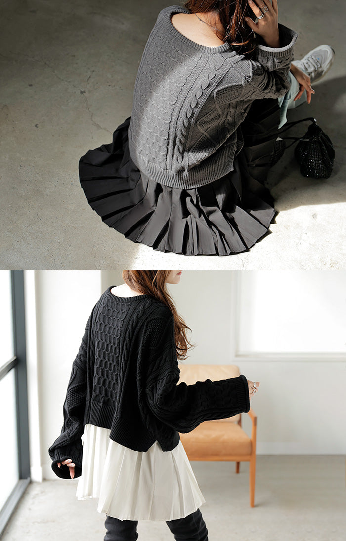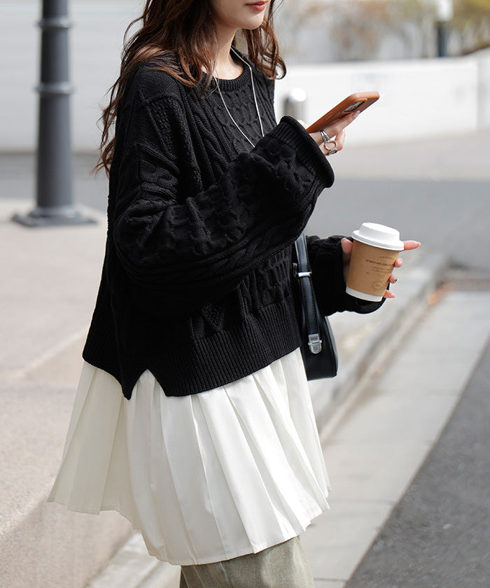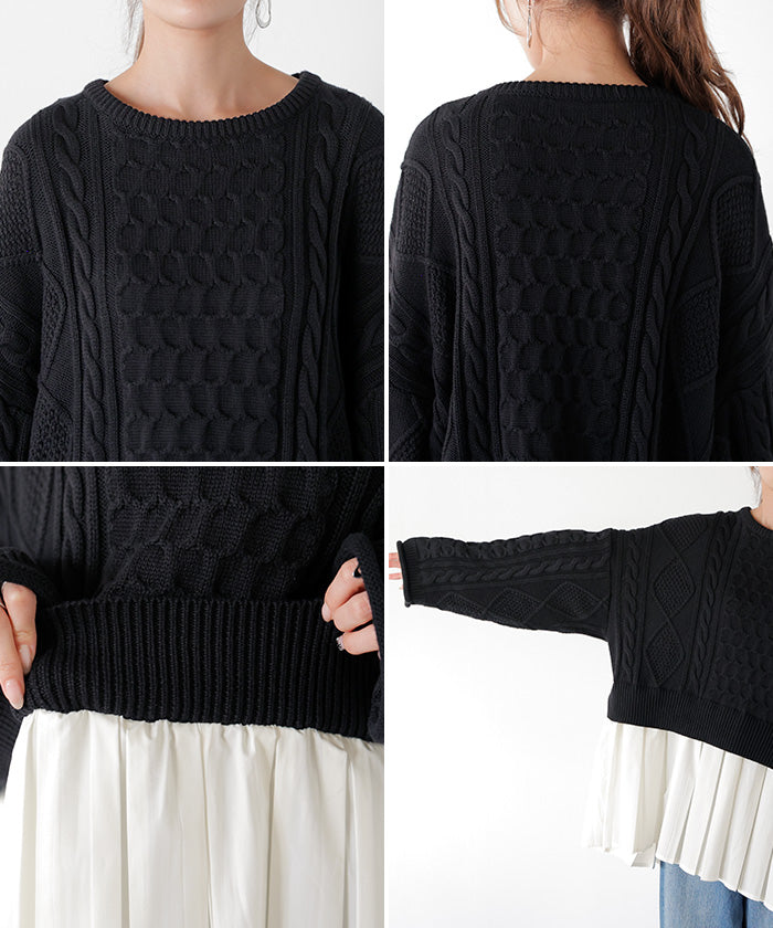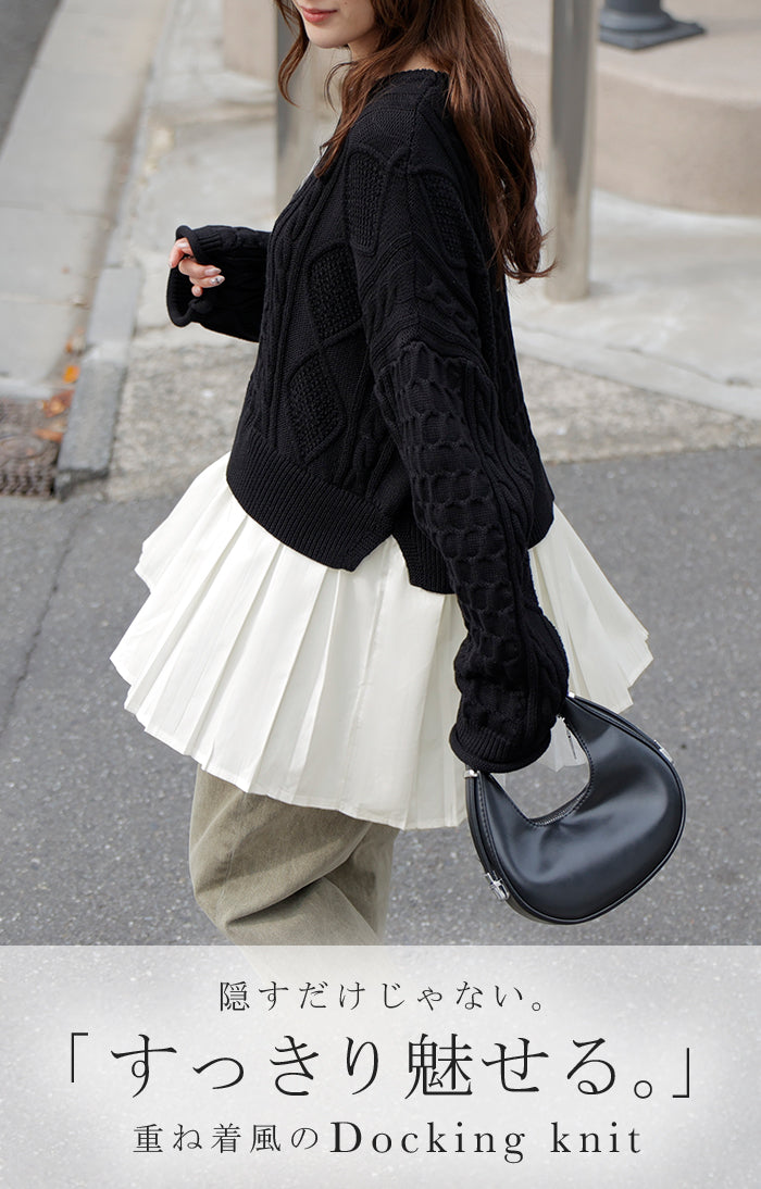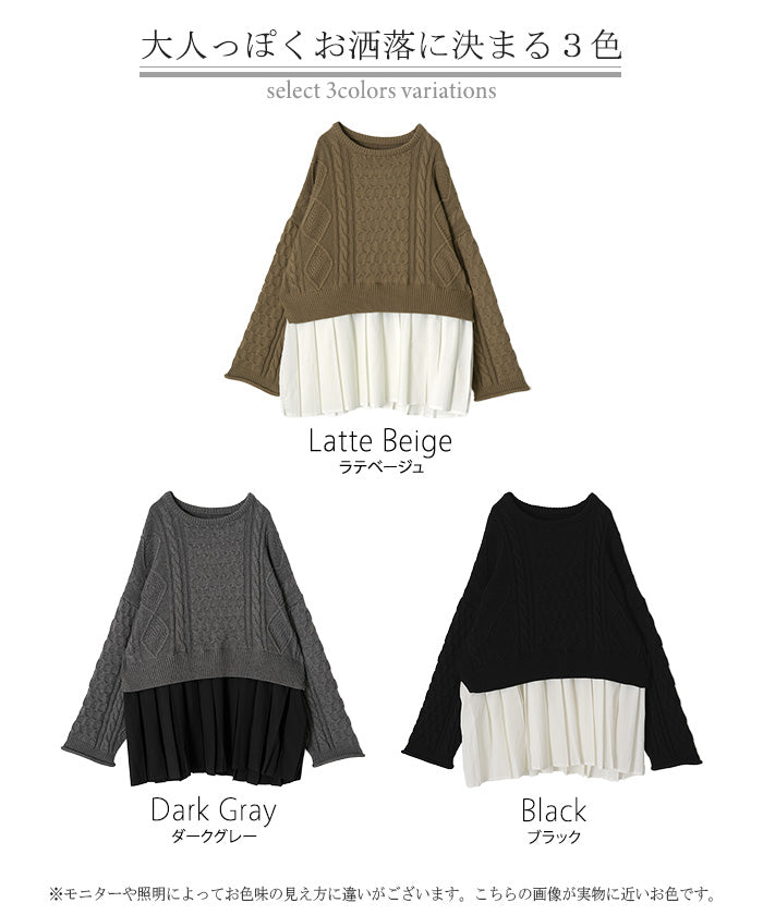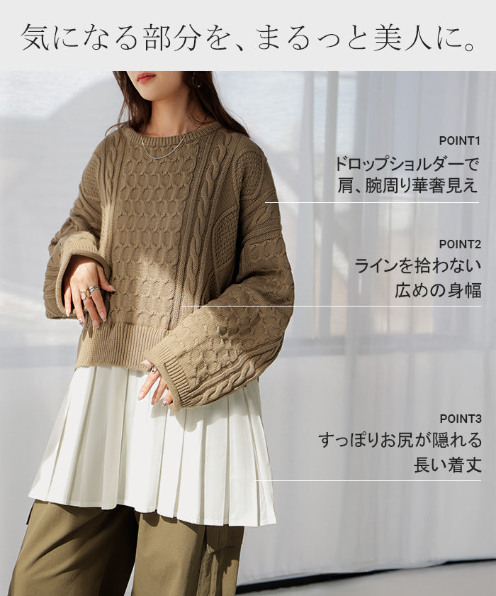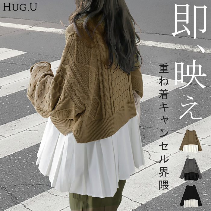 2025AW新作 ニット プリーツ ドッキング ■12月上旬入荷 レディース トップス ロング セーター ケーブルニット オーバー 重ね着 レイヤード プルオーバー クルーネック 無地 チュニック きれいめ 長袖 長い上品 ゆったり 大きいサイズ 体型カバー お尻が隠れる 黒 グレー 秋 冬 HUG.U
