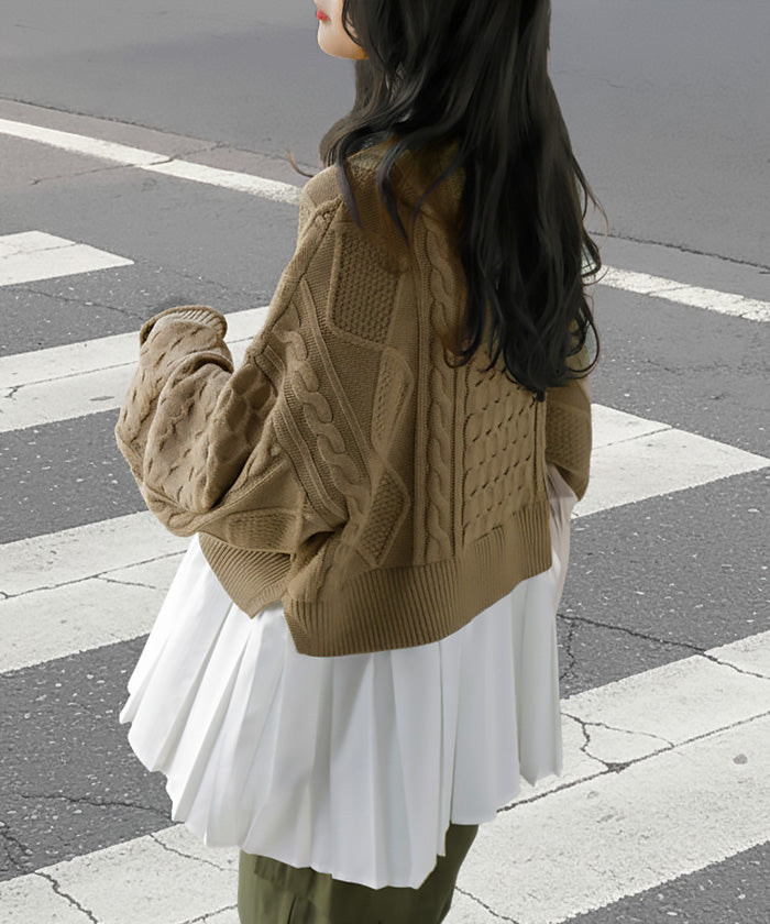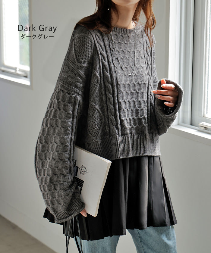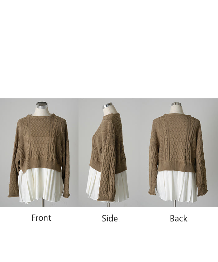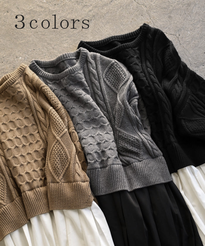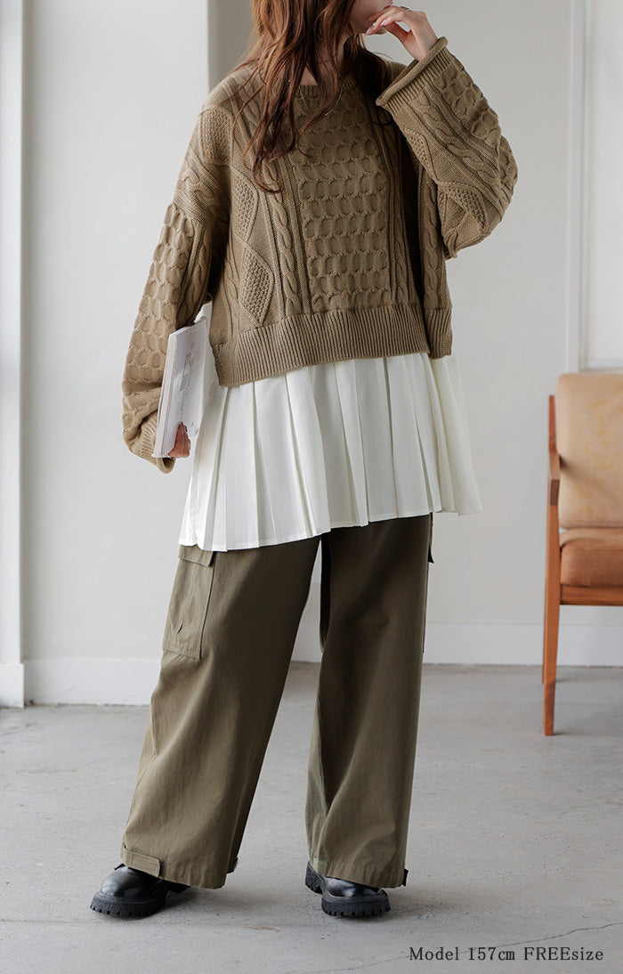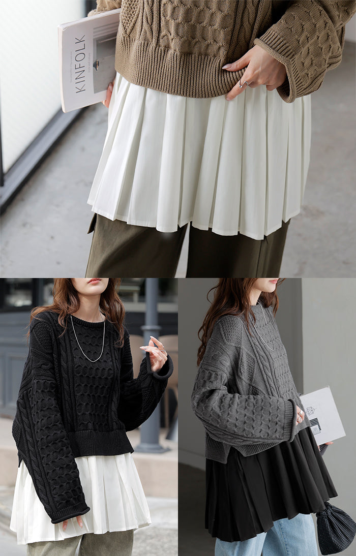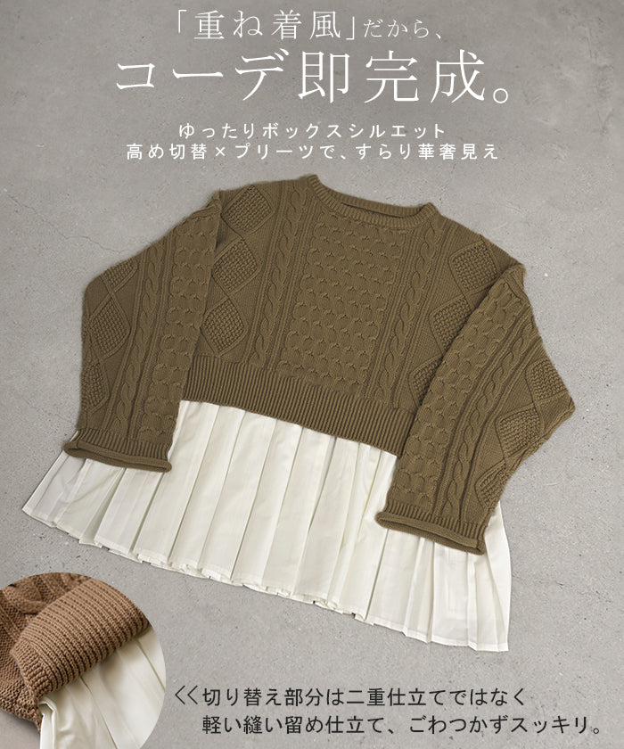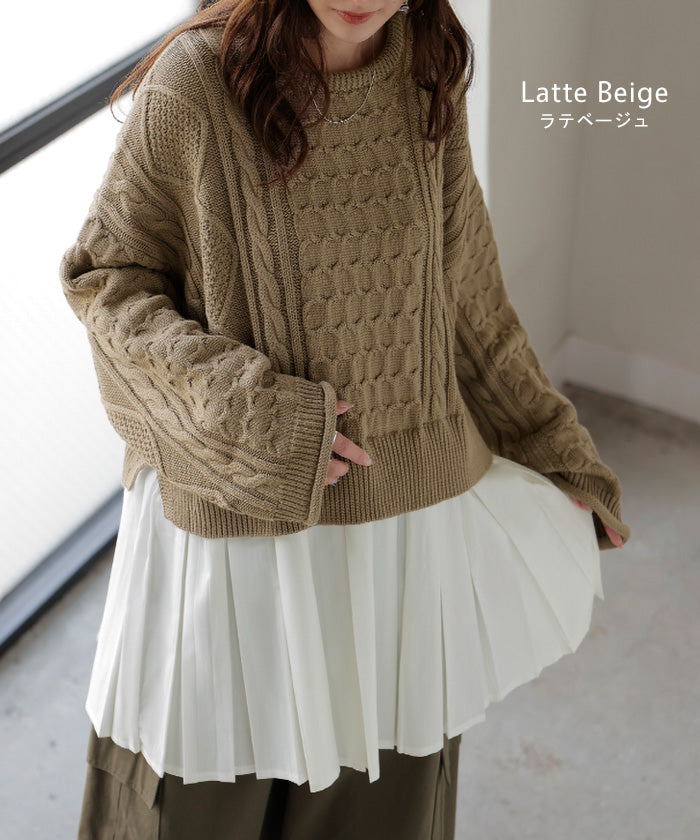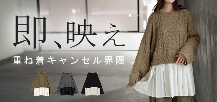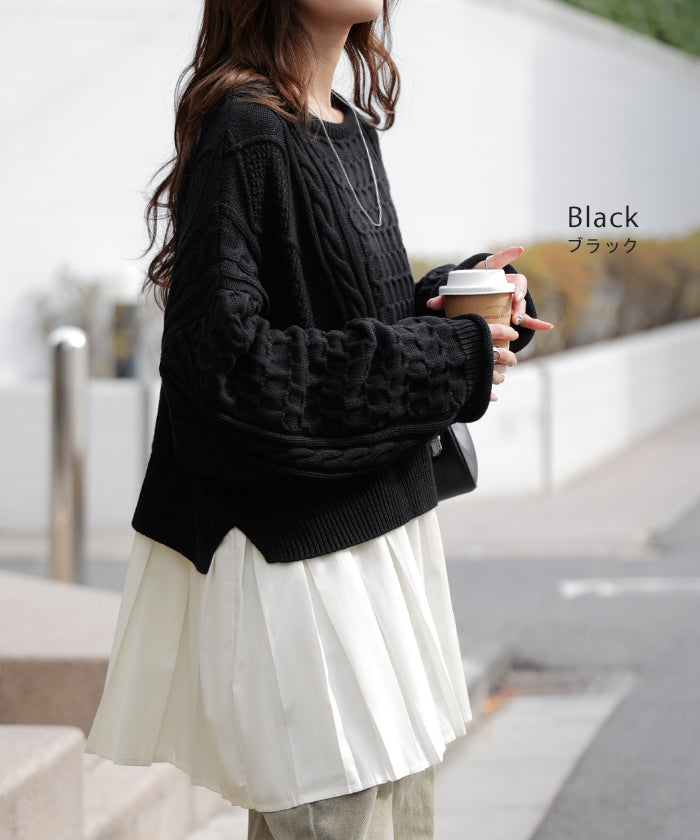 2025AW新作 ニット プリーツ ドッキング ■12月上旬入荷 レディース トップス ロング セーター ケーブルニット オーバー 重ね着 レイヤード プルオーバー クルーネック 無地 チュニック きれいめ 長袖 長い上品 ゆったり 大きいサイズ 体型カバー お尻が隠れる 黒 グレー 秋 冬 HUG.U