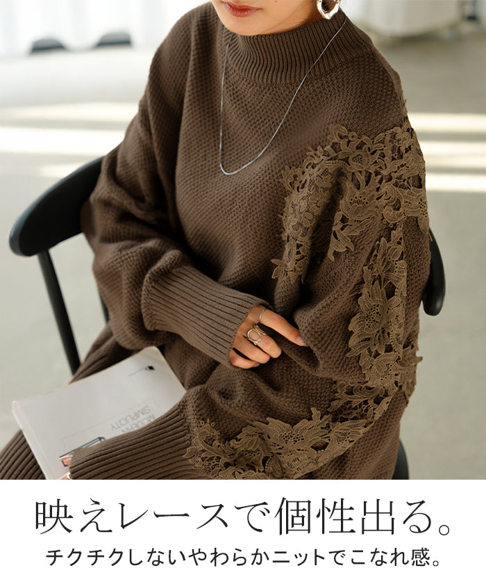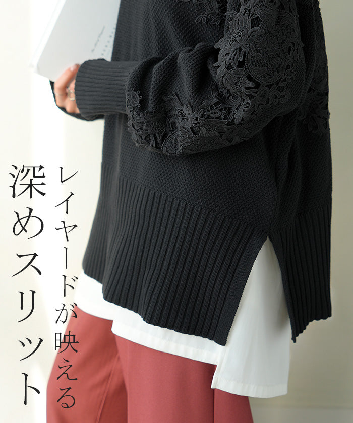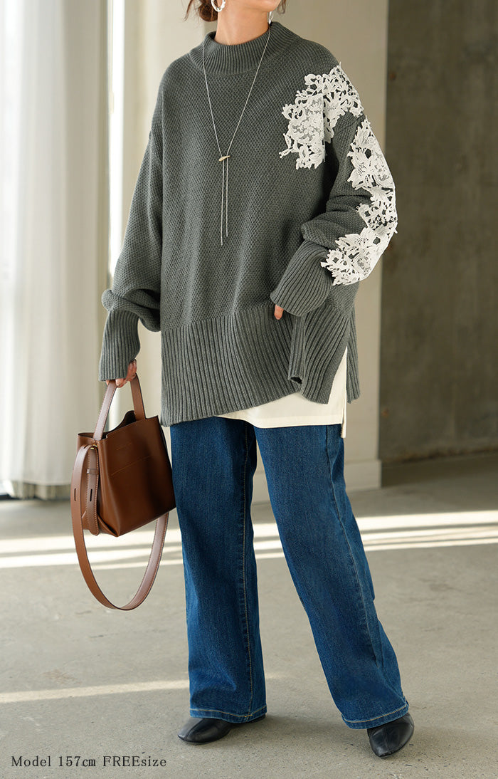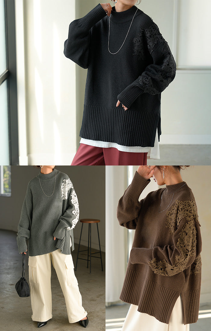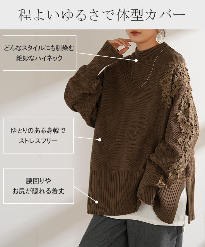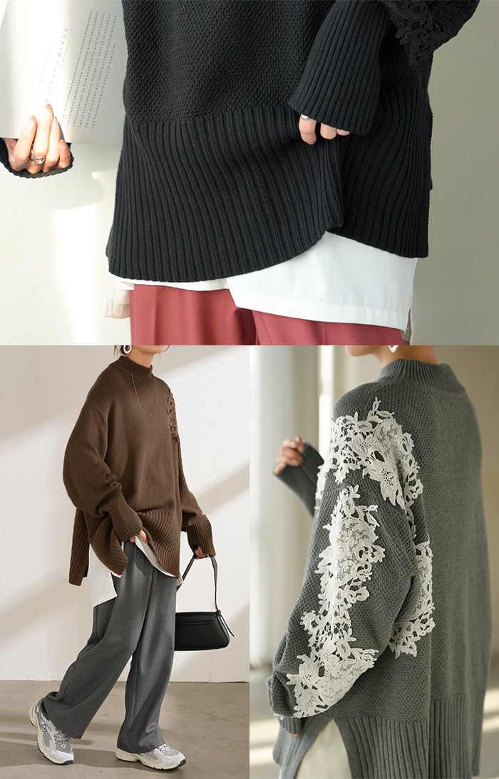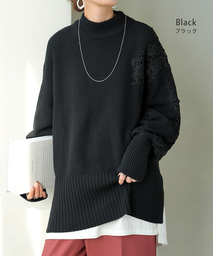 2025AW新作 ニット レース 鹿の子 綿100 レディース トップス ロング セーター オーバー プルオーバー 長袖 長い チクチクしない ハイネック チュニック アシンメトリー リブ ゆったり 体型カバー 大きいサイズ お尻が隠れる カジュアル 黒 グレー 秋 冬 HUG.U
